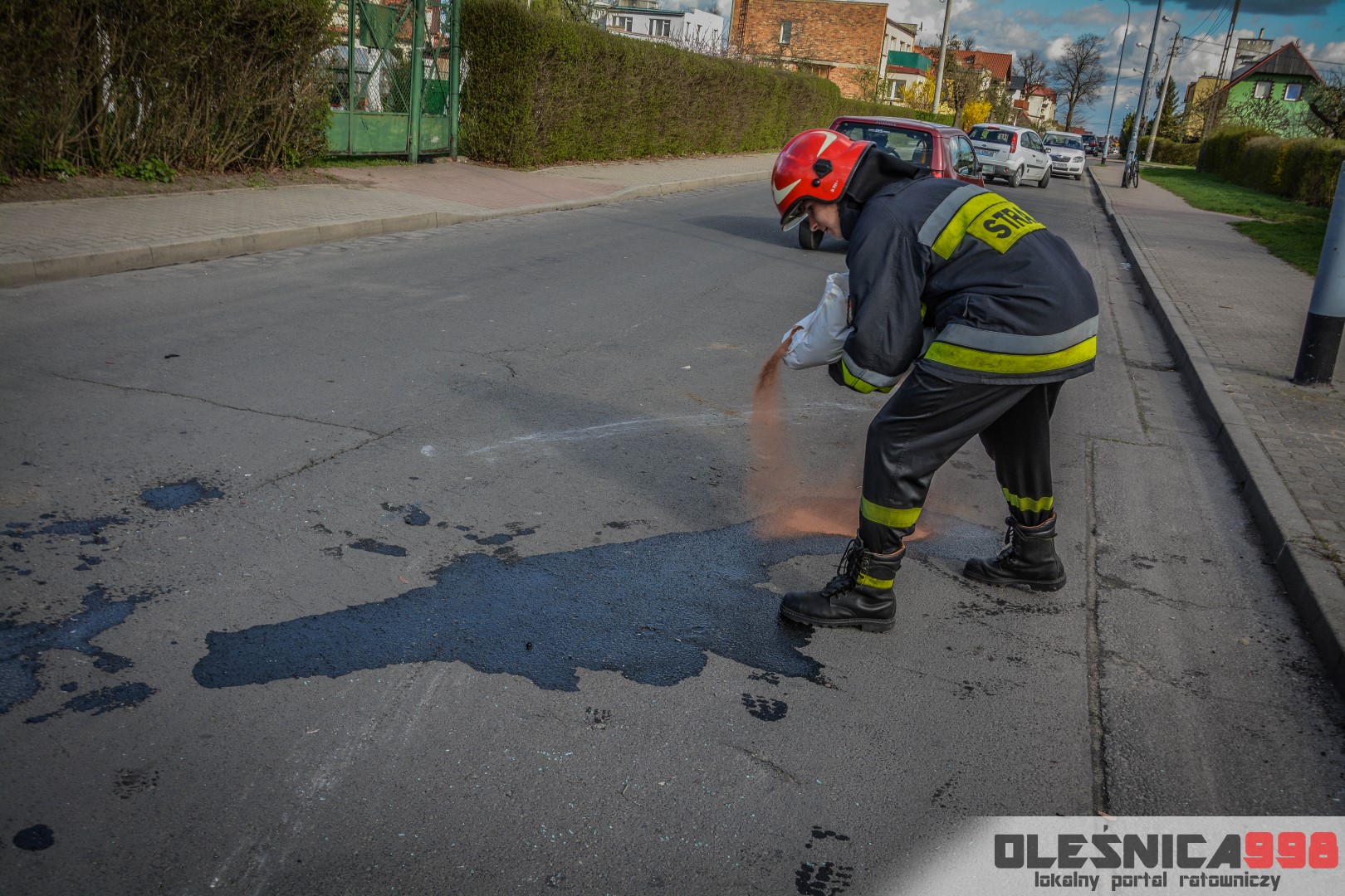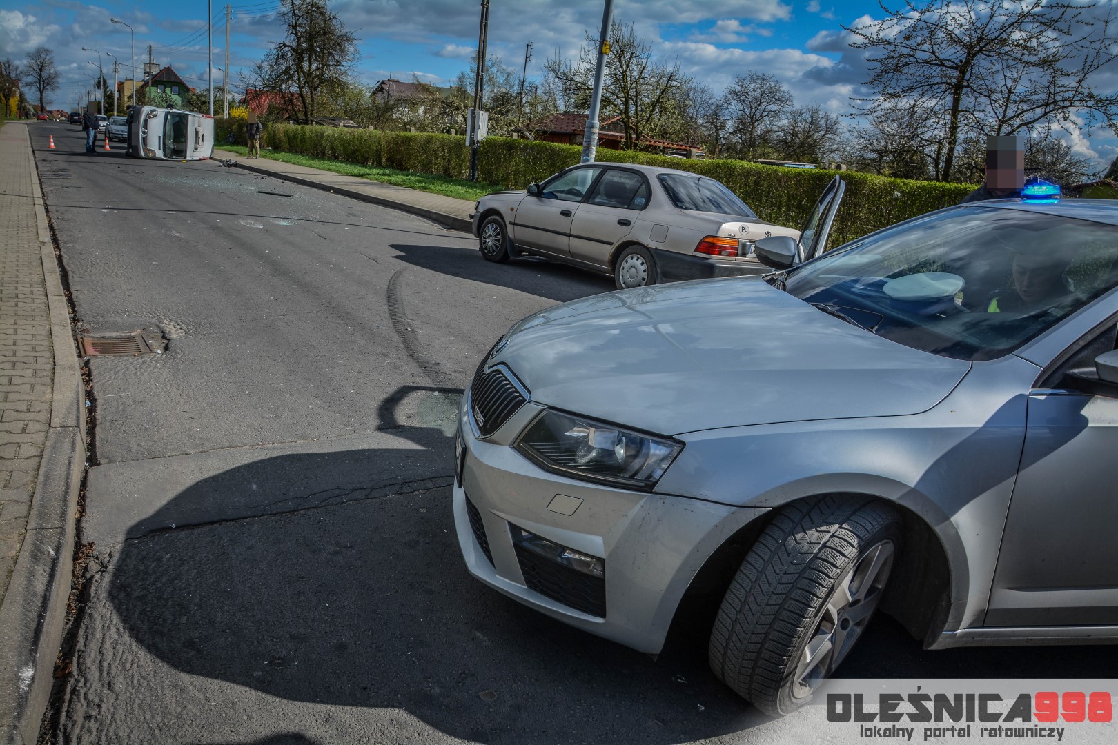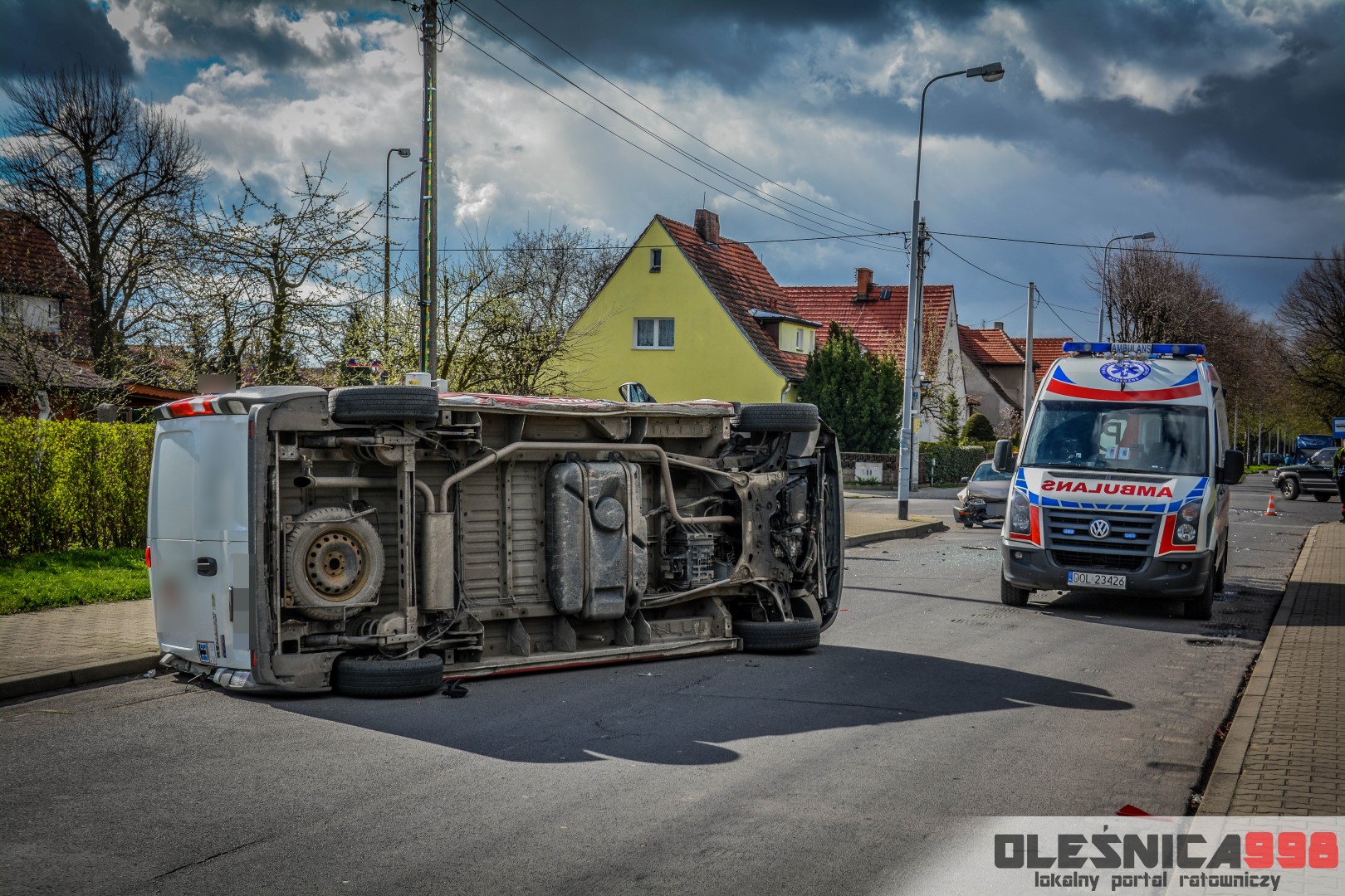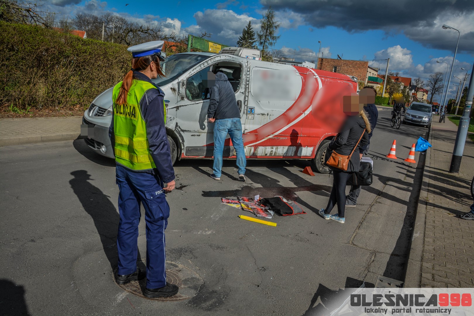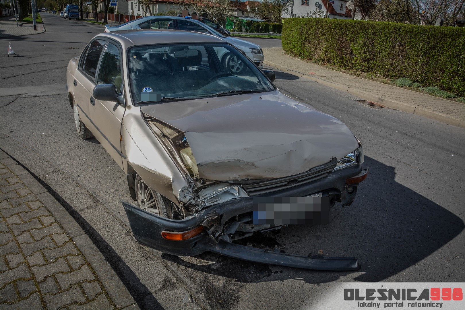 Około godziny 15:30 Oficer Dyżurny Komendy Powiatowej Policji w Oleśnicy otrzymał zgłoszenie o zdarzeniu drogowym z udziałem samochodu osobowego oraz dostawczego, na skrzyżowaniu ulicy Armii Krajowej i Krzywej. Na miejsce niezwłocznie zadysponował on patrol Policjantów Wydziału Ruchu Drogowego a także powiadomił Pogotowie Ratunkowe, które również zjawiło się na miejscu.