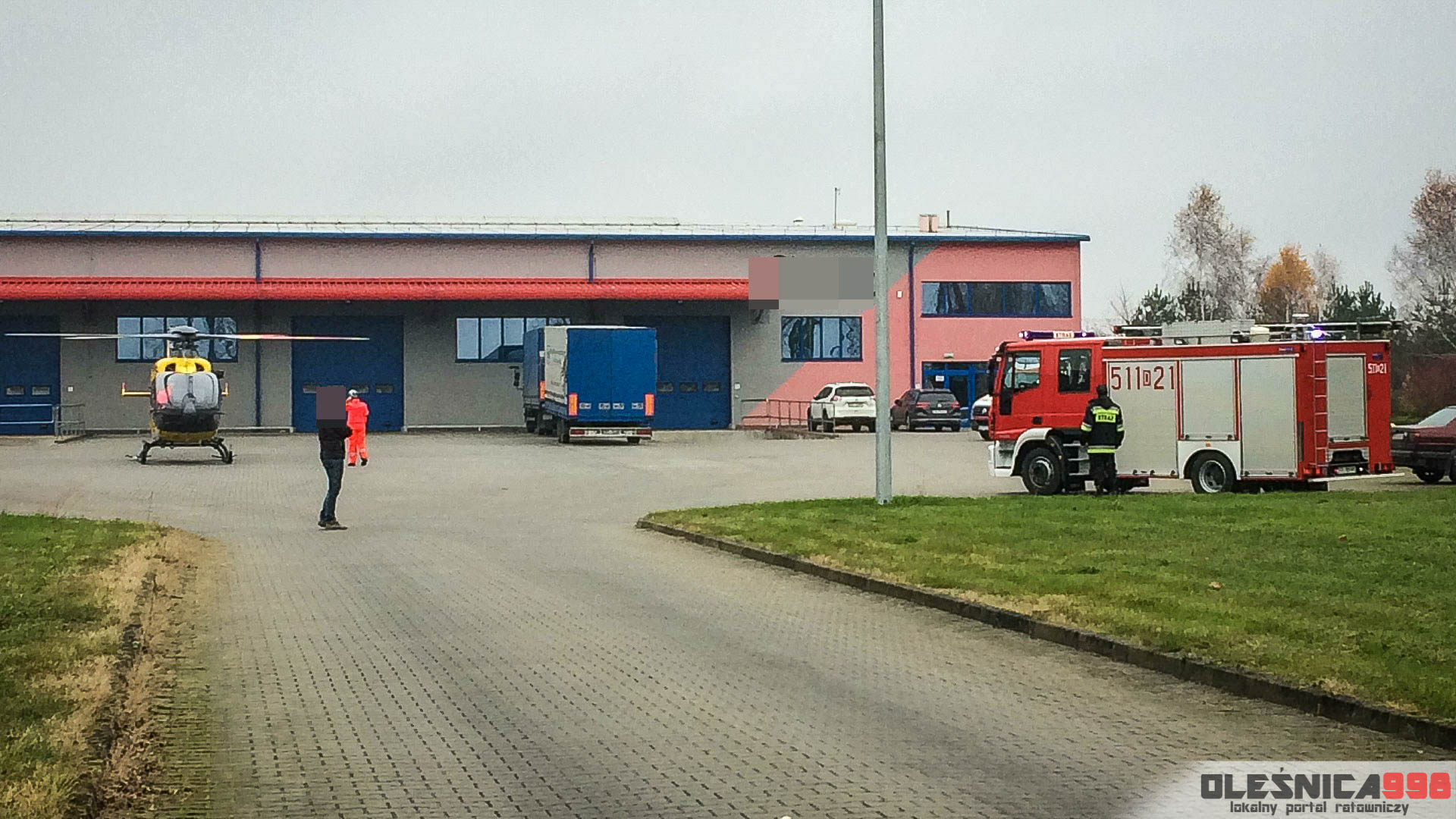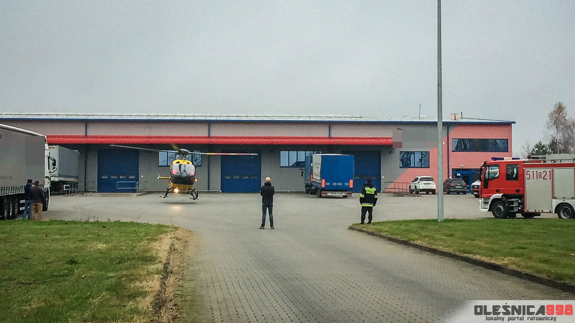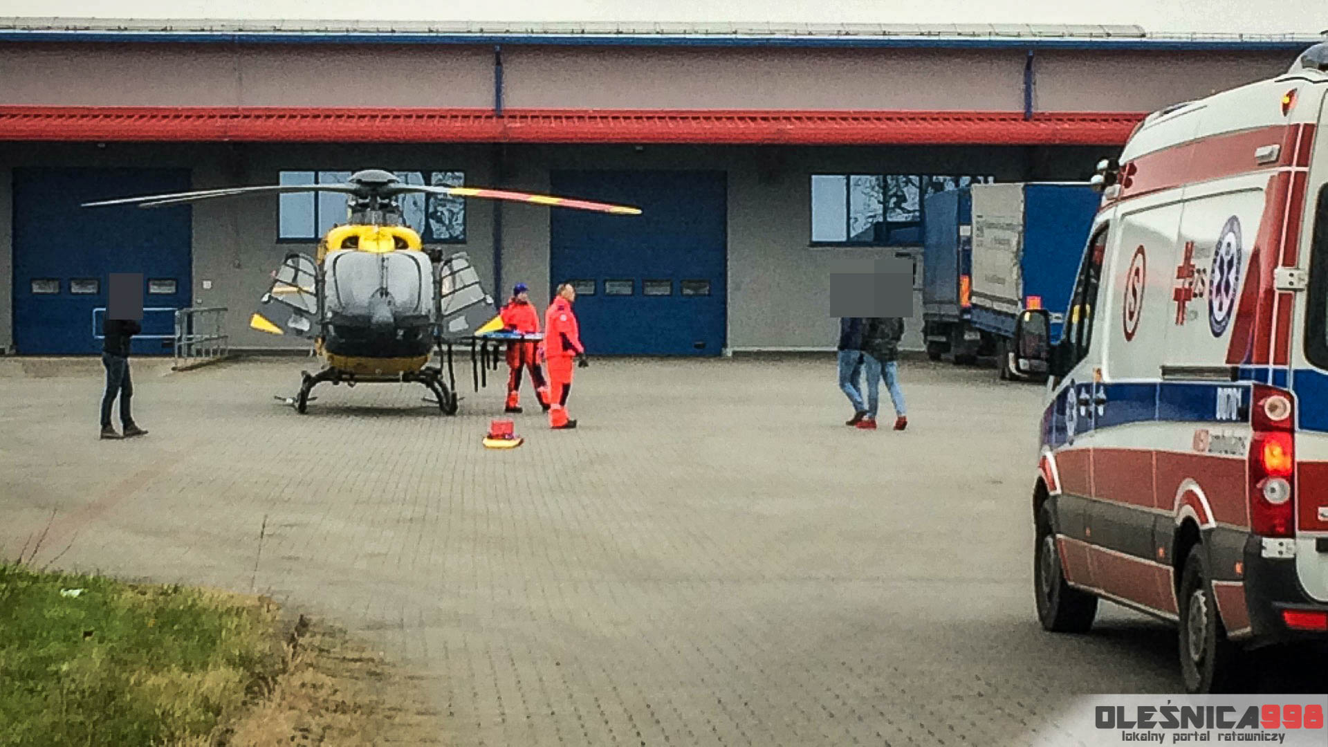 Po kilkunastu minutach od zgłoszenia na miejsce dotarł śmigłowiec Lotniczego Pogotowia Ratunkowego. Maszyna wylądowała na terenie pobliskiej firmy transportowej. Z parkingu zakładu podjęty został, od zespołu naziemnego, poszkodowany mężczyzna, który w ciężkim stanie trafił do jednego z wrocławskich szpitali.