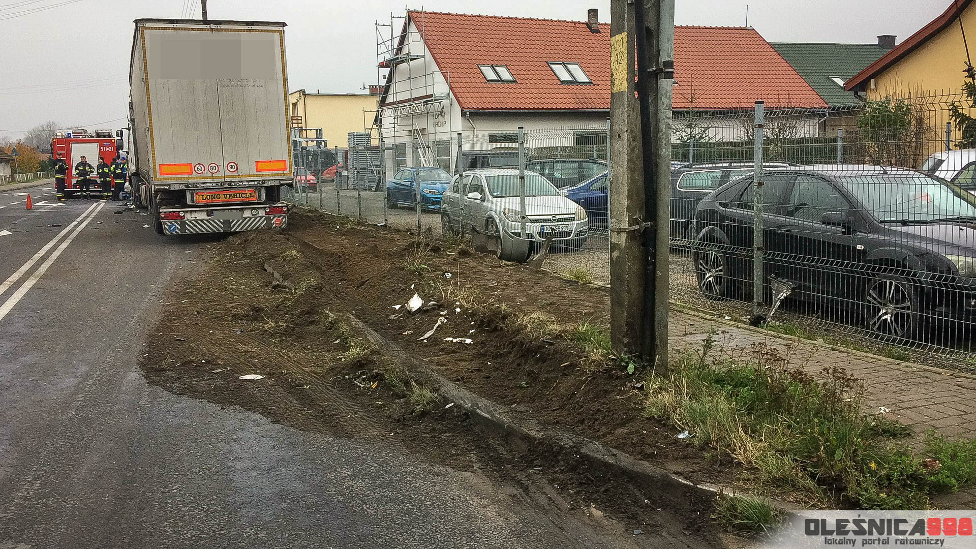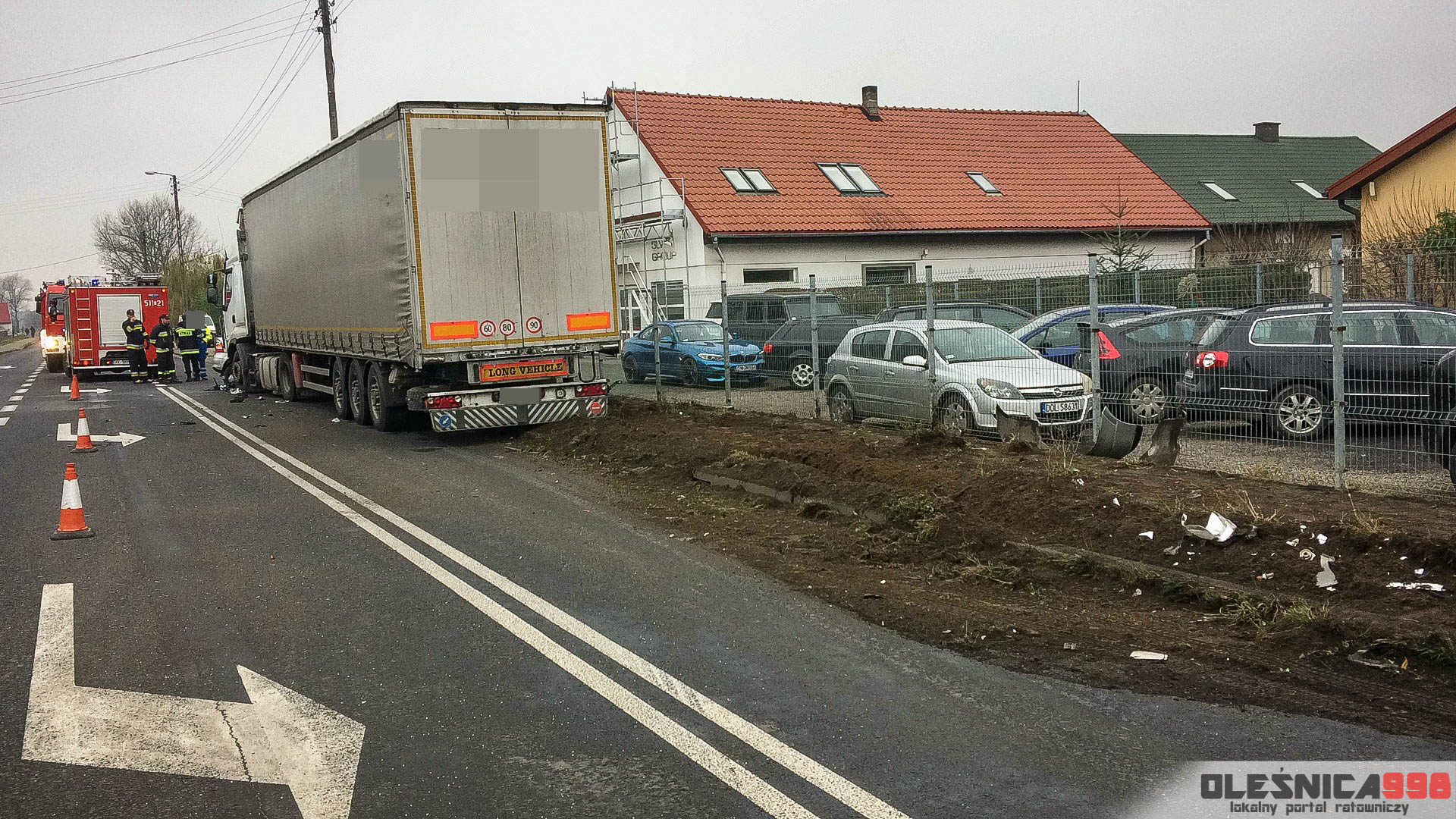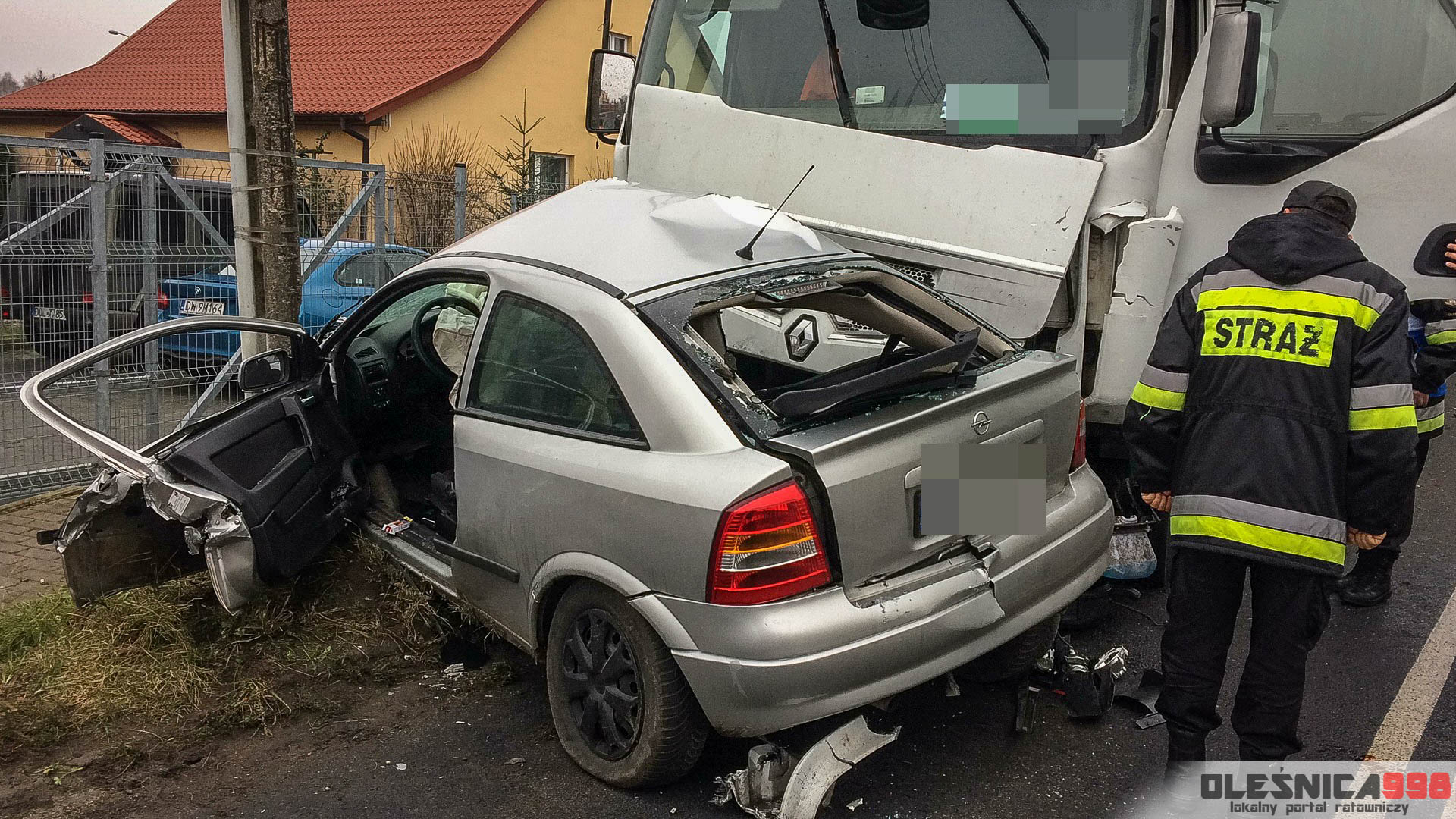 Strażacy, którzy dotarli na miejsce wypadku zastali dwa rozbite pojazdy, które znajdowały się częściowo na pasie ruchu a częściowo na pobliskim chodniku. W samochodzie osobowym, w bok którego uderzyła ciężarówka uwięziony został poważnie ranny kierowca. Podróżował jako jedyny w pojeździe. Mundurowi przystąpili do udzielania pomocy przedmedycznej a także wycinania poszkodowanego z wraku.