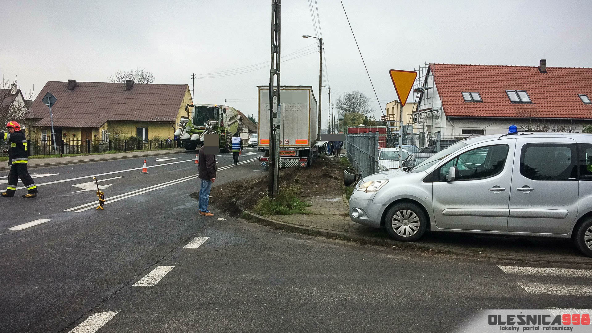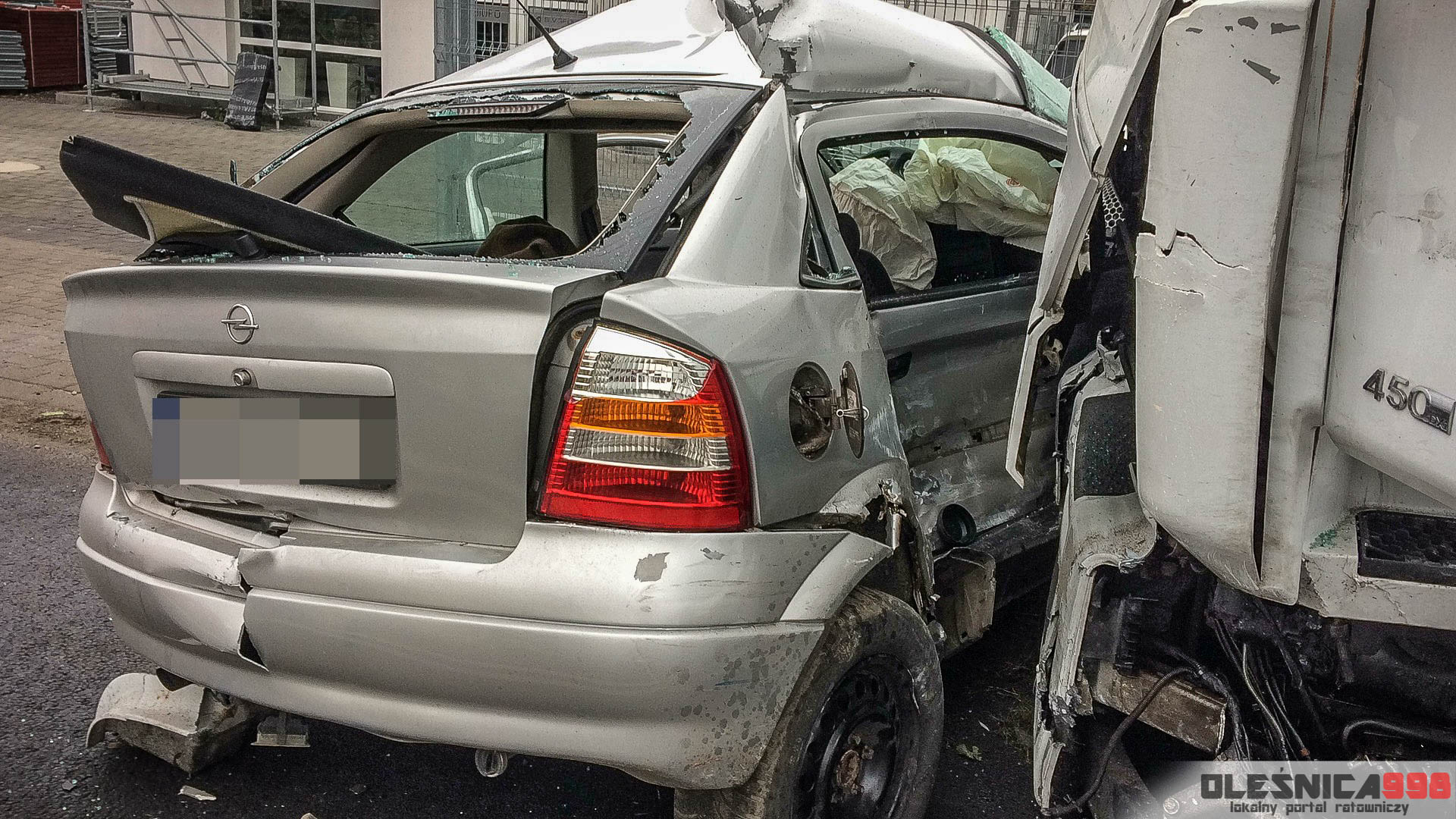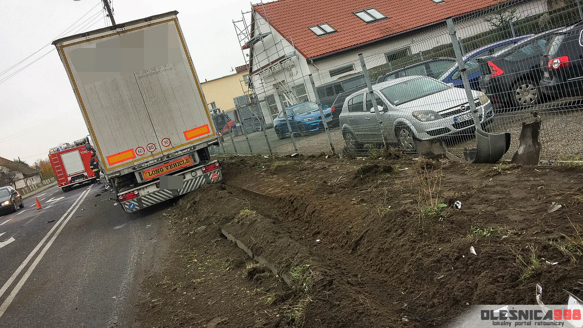Strażacy, którzy dotarli na miejsce wypadku zastali dwa rozbite pojazdy, które znajdowały się częściowo na pasie ruchu a częściowo na pobliskim chodniku. W samochodzie osobowym, w bok którego uderzyła ciężarówka uwięziony został poważnie ranny kierowca. Podróżował jako jedyny w pojeździe. Mundurowi przystąpili do udzielania pomocy przedmedycznej a także wycinania poszkodowanego z wraku.