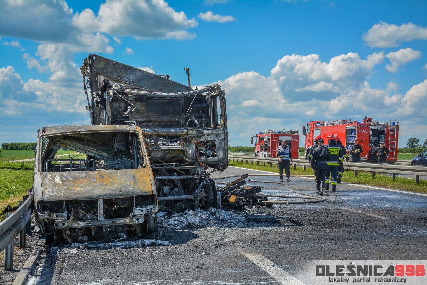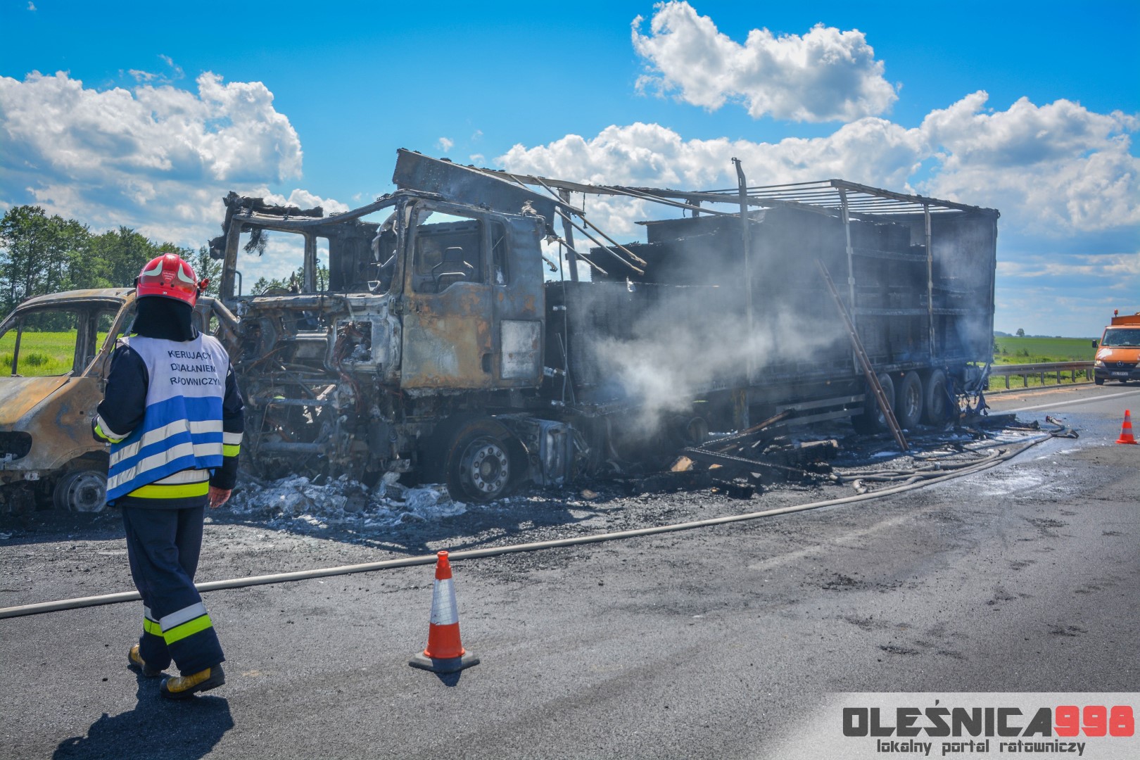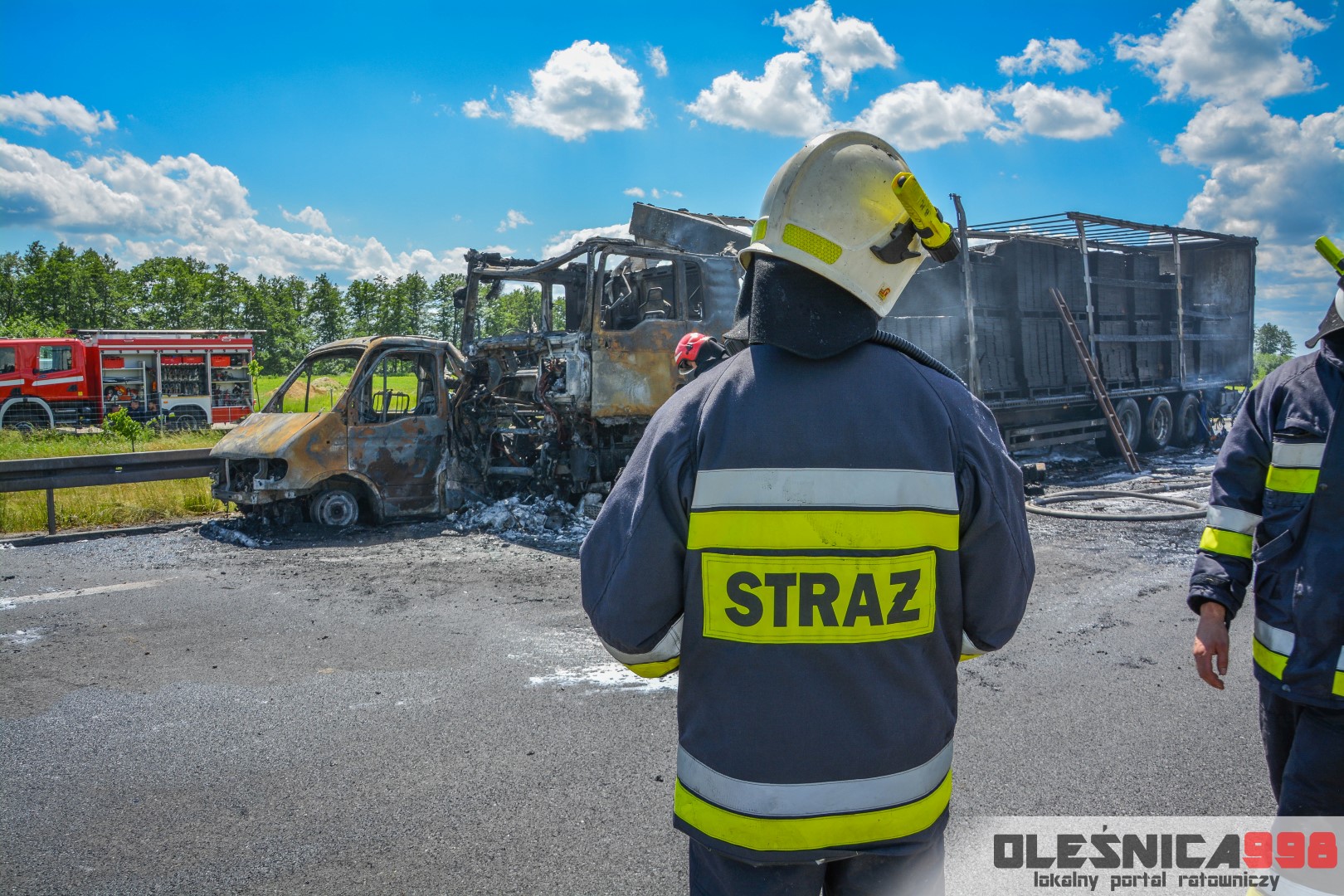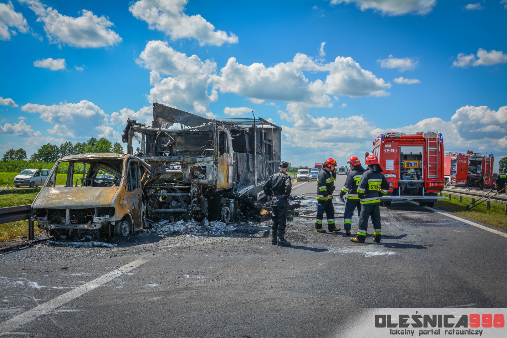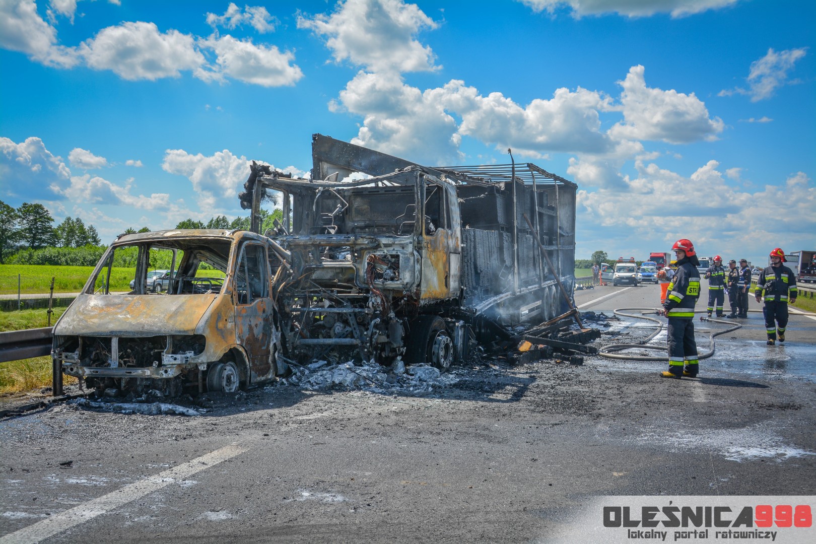 W trakcie dojazdu okazało się jednak, że w wyniku zderzenia oba pojazdy stanęły w ogniu. W momencie przybycia pierwszego zastępu na miejsce zdarzenia, oba samochody były całkowicie objęte ogniem. Początkowo zachodziła również obawa, że w zmiażdżonym busie mogli znajdować się ludzie. Ta informacja na szczęście nie potwierdziła się.