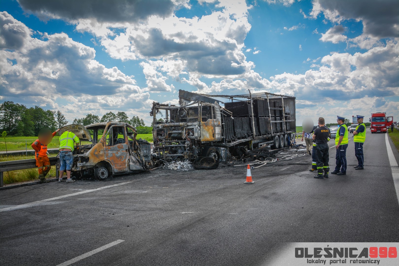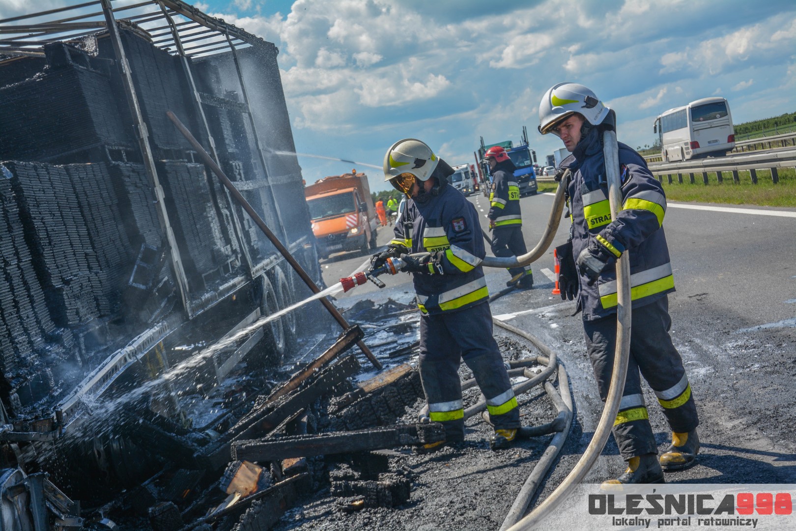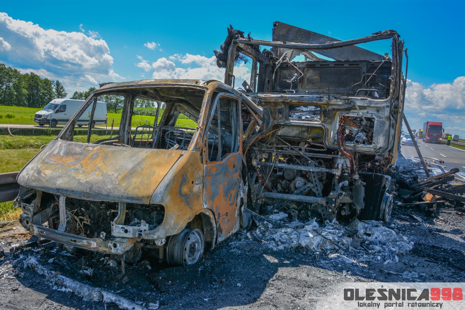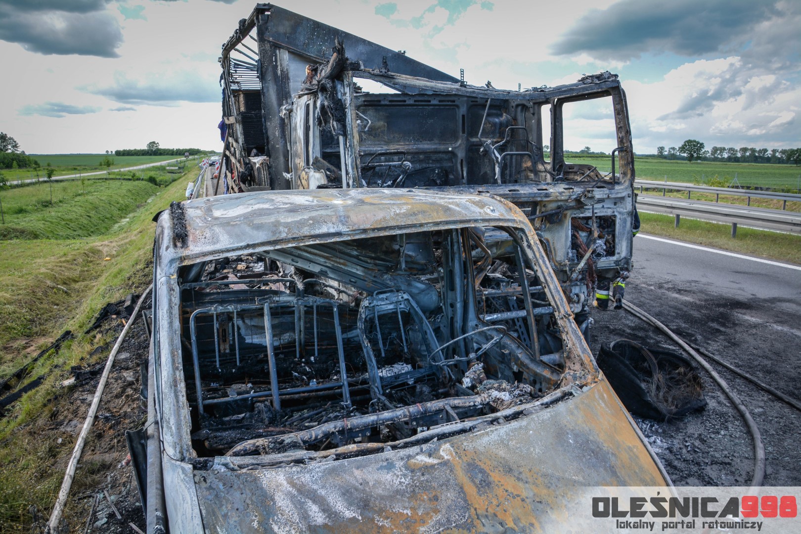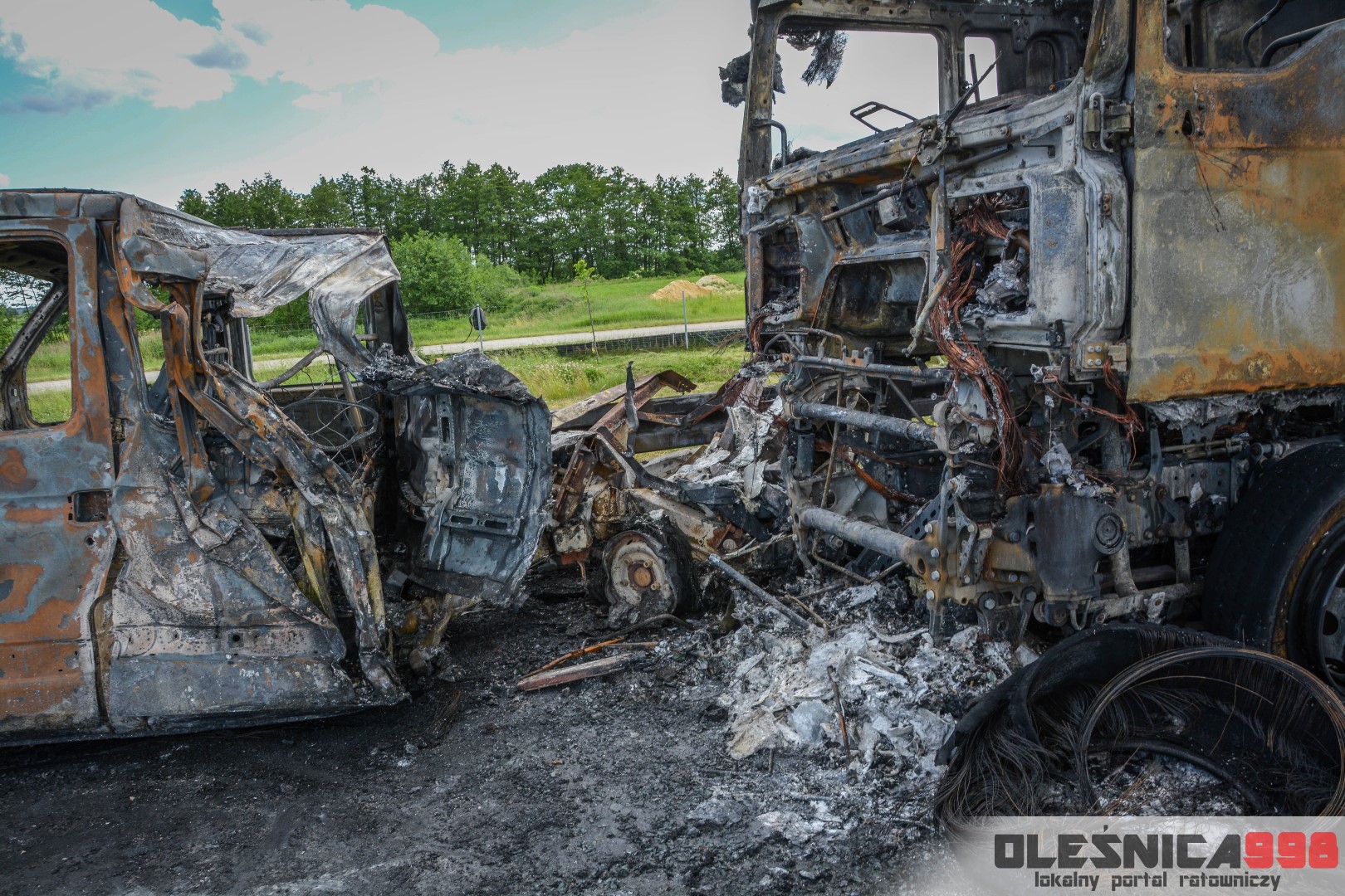 W trakcie dojazdu okazało się jednak, że w wyniku zderzenia oba pojazdy stanęły w ogniu. W momencie przybycia pierwszego zastępu na miejsce zdarzenia, oba samochody były całkowicie objęte ogniem. Początkowo zachodziła również obawa, że w zmiażdżonym busie mogli znajdować się ludzie. Ta informacja na szczęście nie potwierdziła się.
