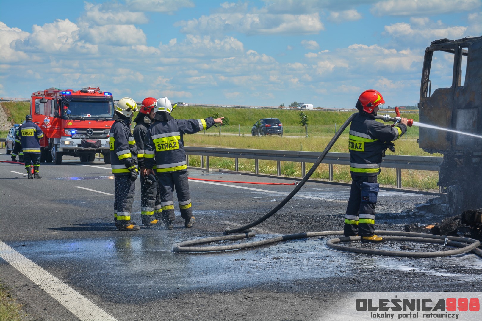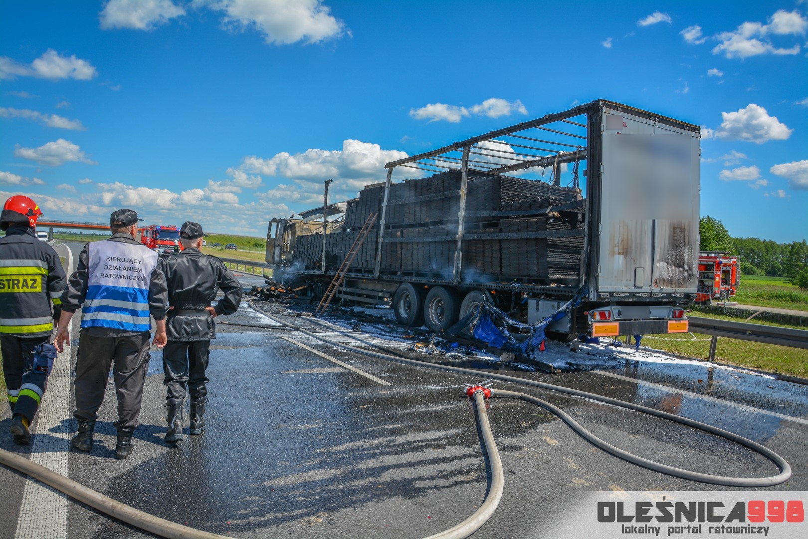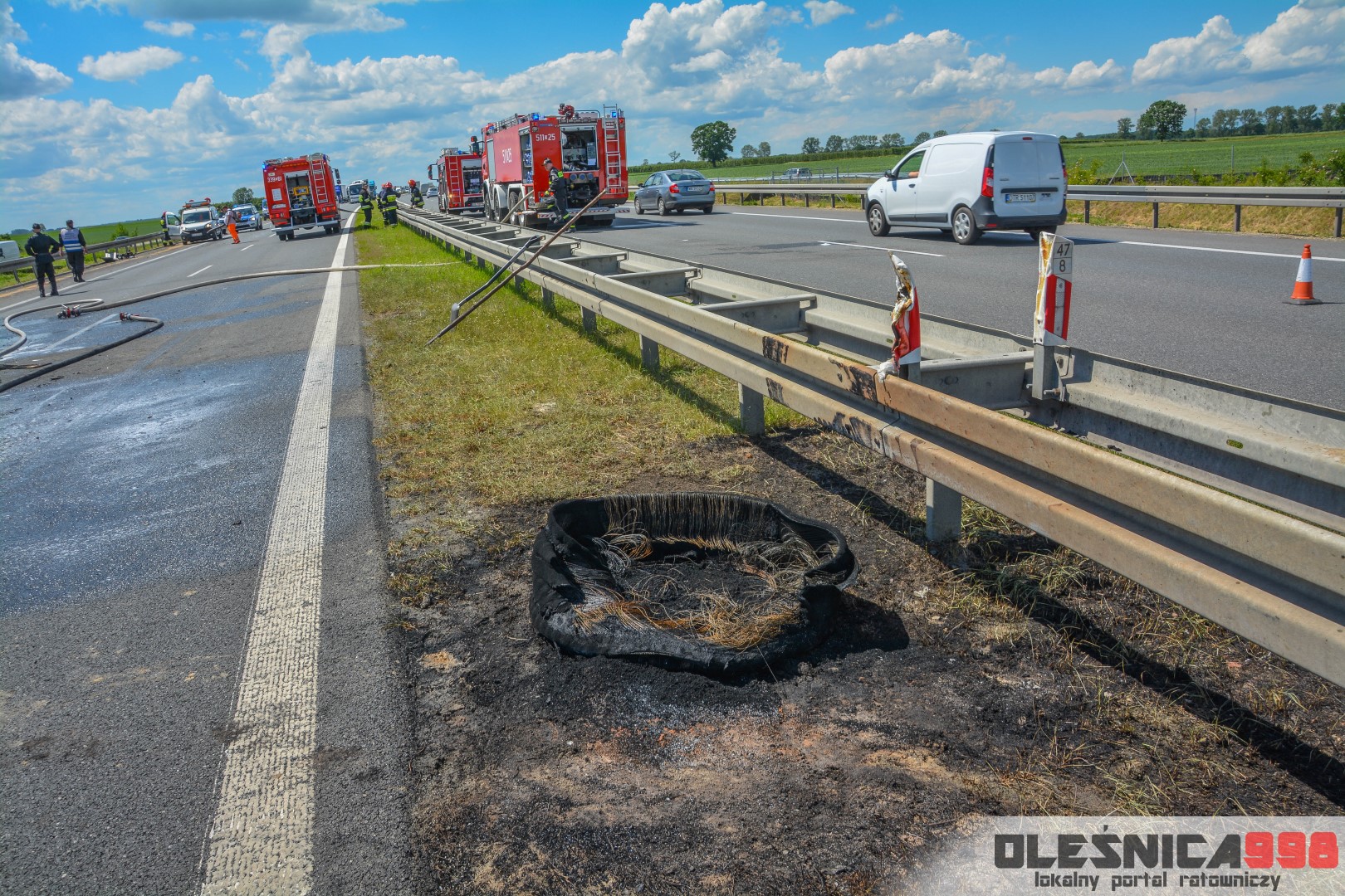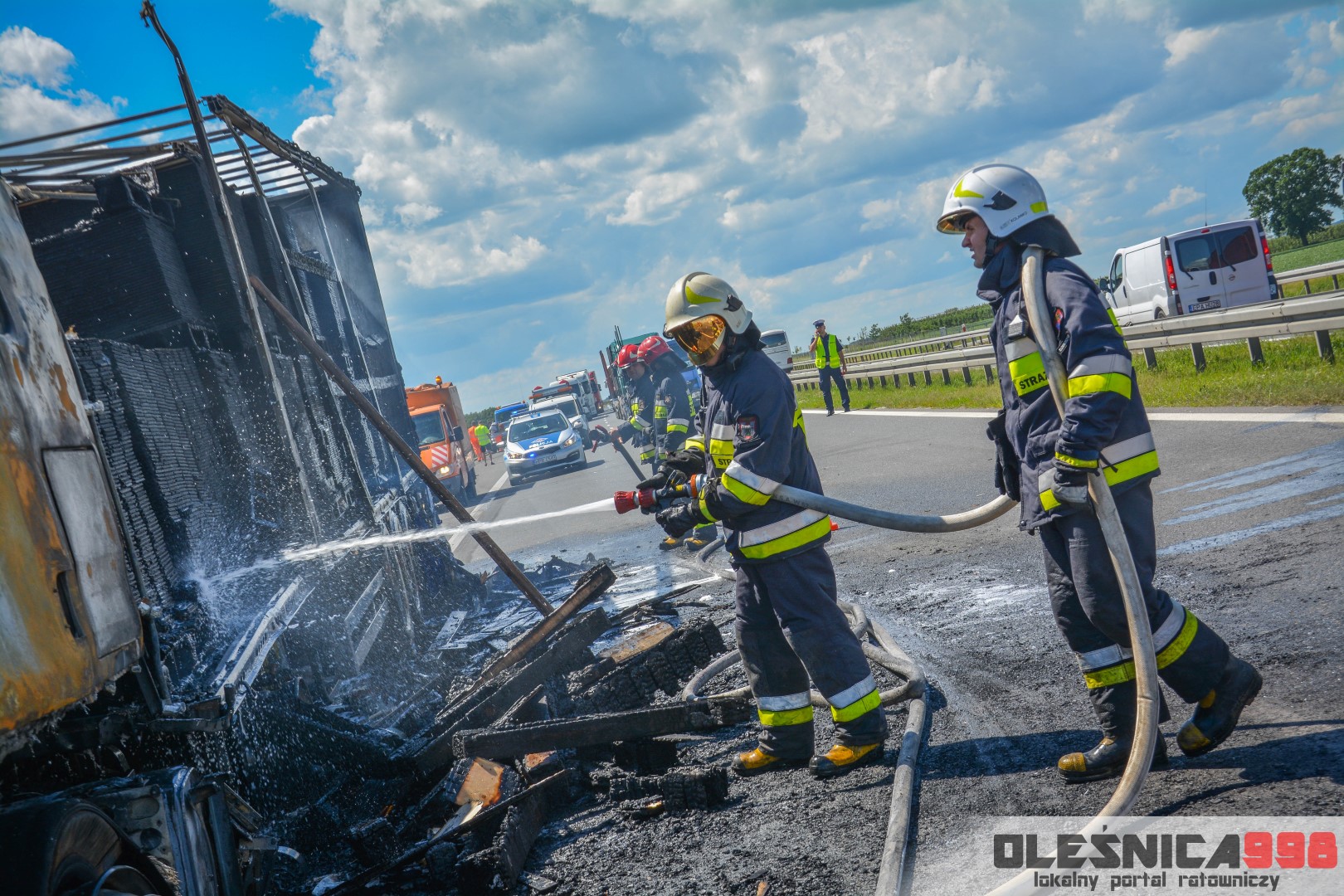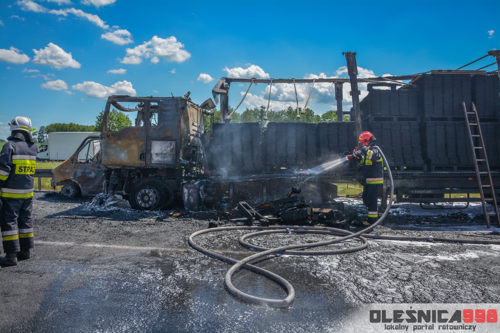 W trakcie dojazdu okazało się jednak, że w wyniku zderzenia oba pojazdy stanęły w ogniu. W momencie przybycia pierwszego zastępu na miejsce zdarzenia, oba samochody były całkowicie objęte ogniem. Początkowo zachodziła również obawa, że w zmiażdżonym busie mogli znajdować się ludzie. Ta informacja na szczęście nie potwierdziła się.