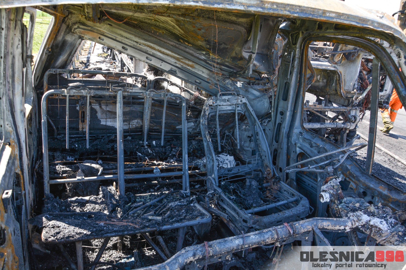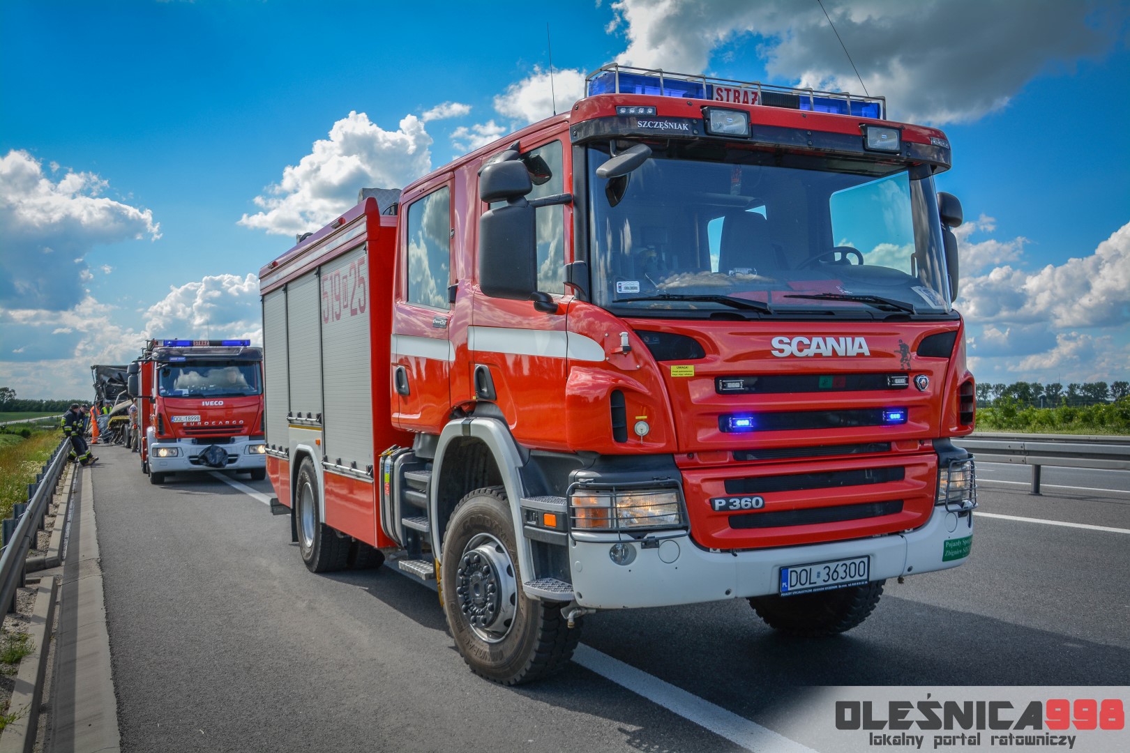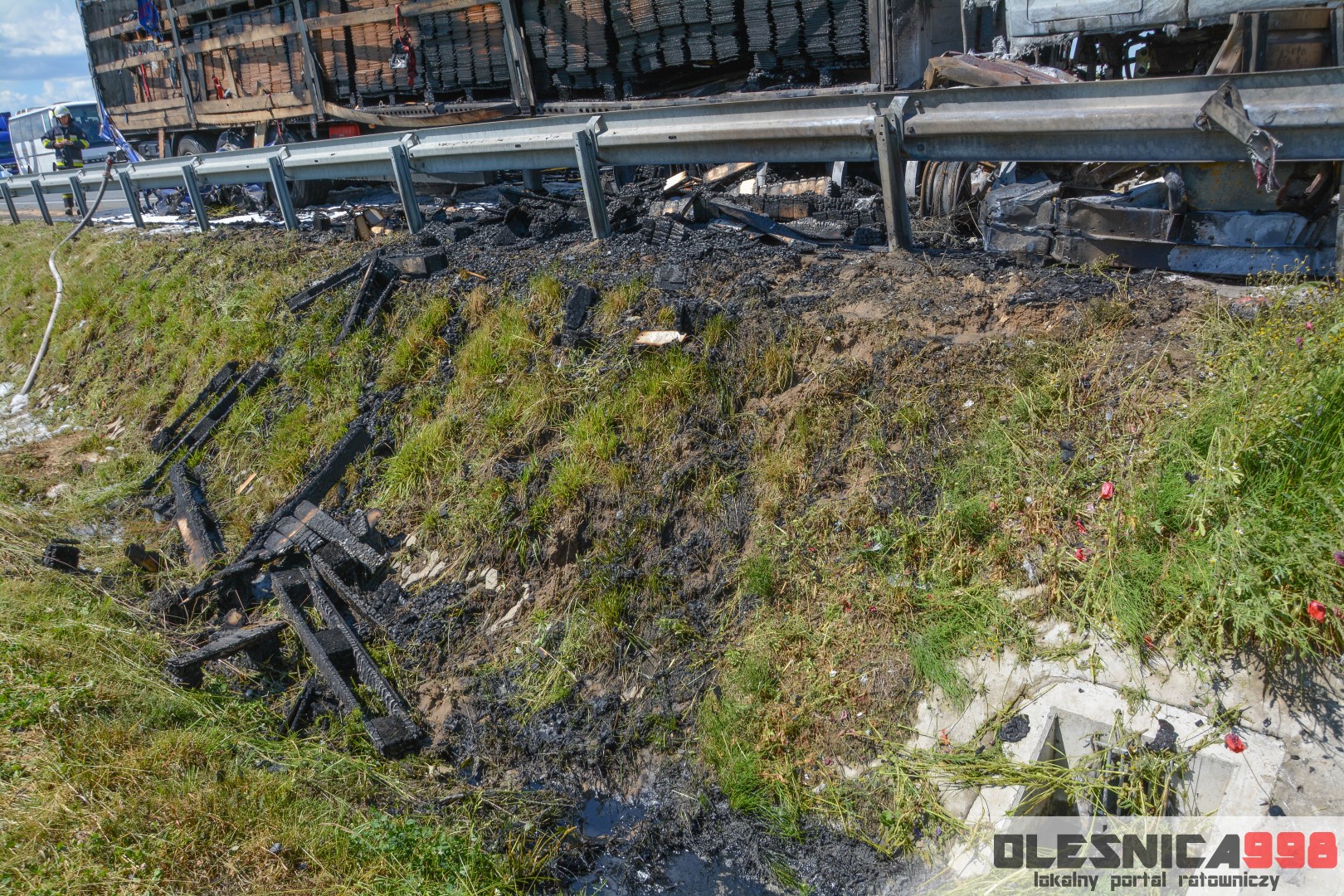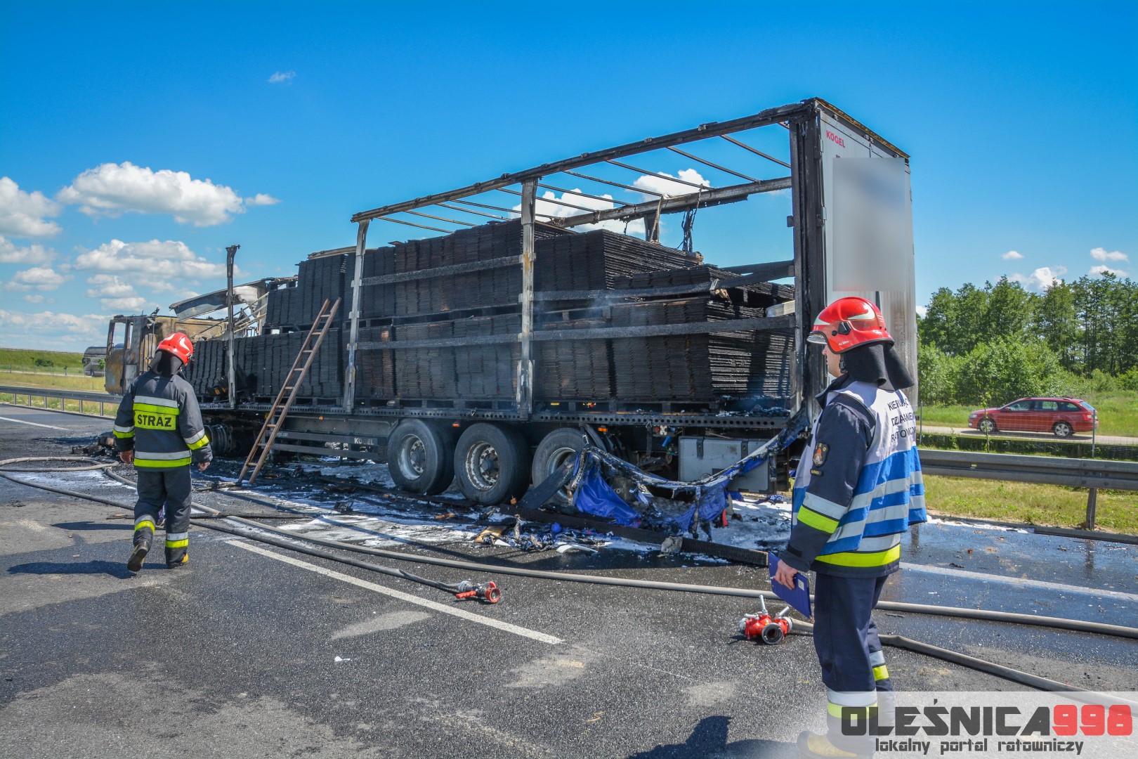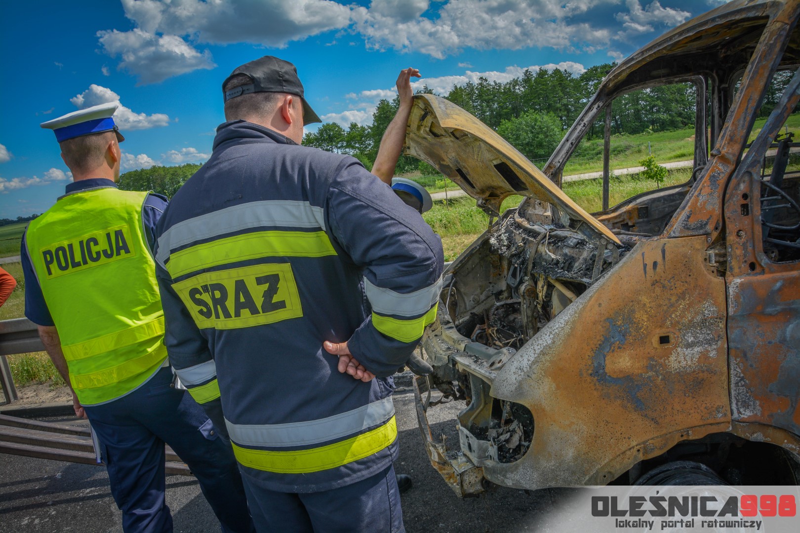 W trakcie dojazdu okazało się jednak, że w wyniku zderzenia oba pojazdy stanęły w ogniu. W momencie przybycia pierwszego zastępu na miejsce zdarzenia, oba samochody były całkowicie objęte ogniem. Początkowo zachodziła również obawa, że w zmiażdżonym busie mogli znajdować się ludzie. Ta informacja na szczęście nie potwierdziła się.