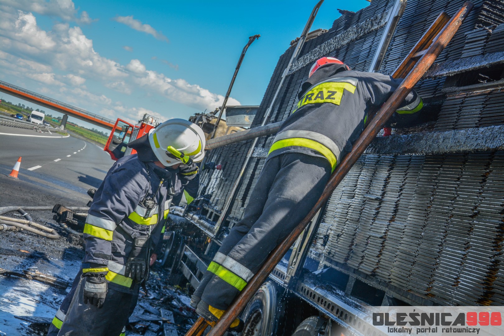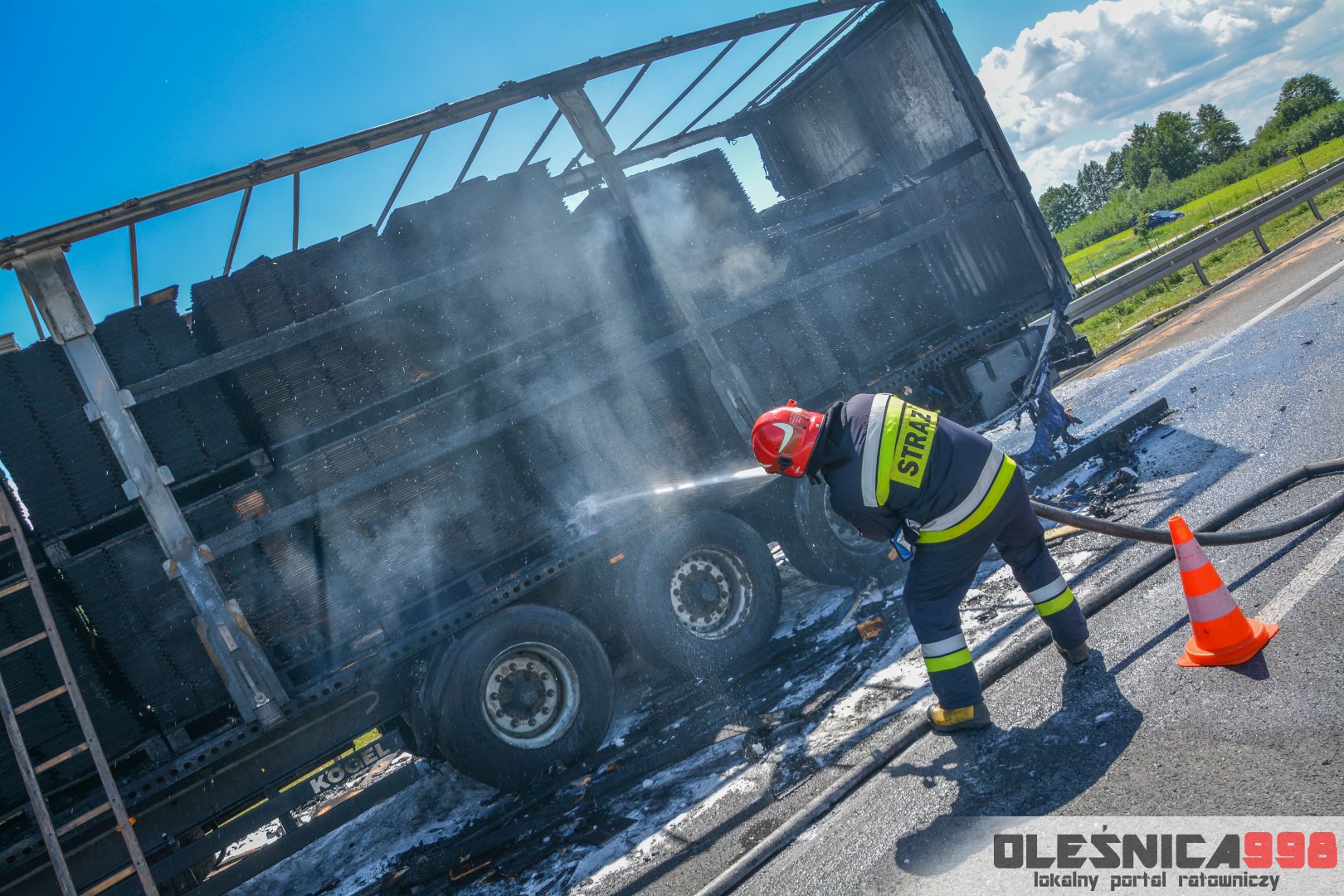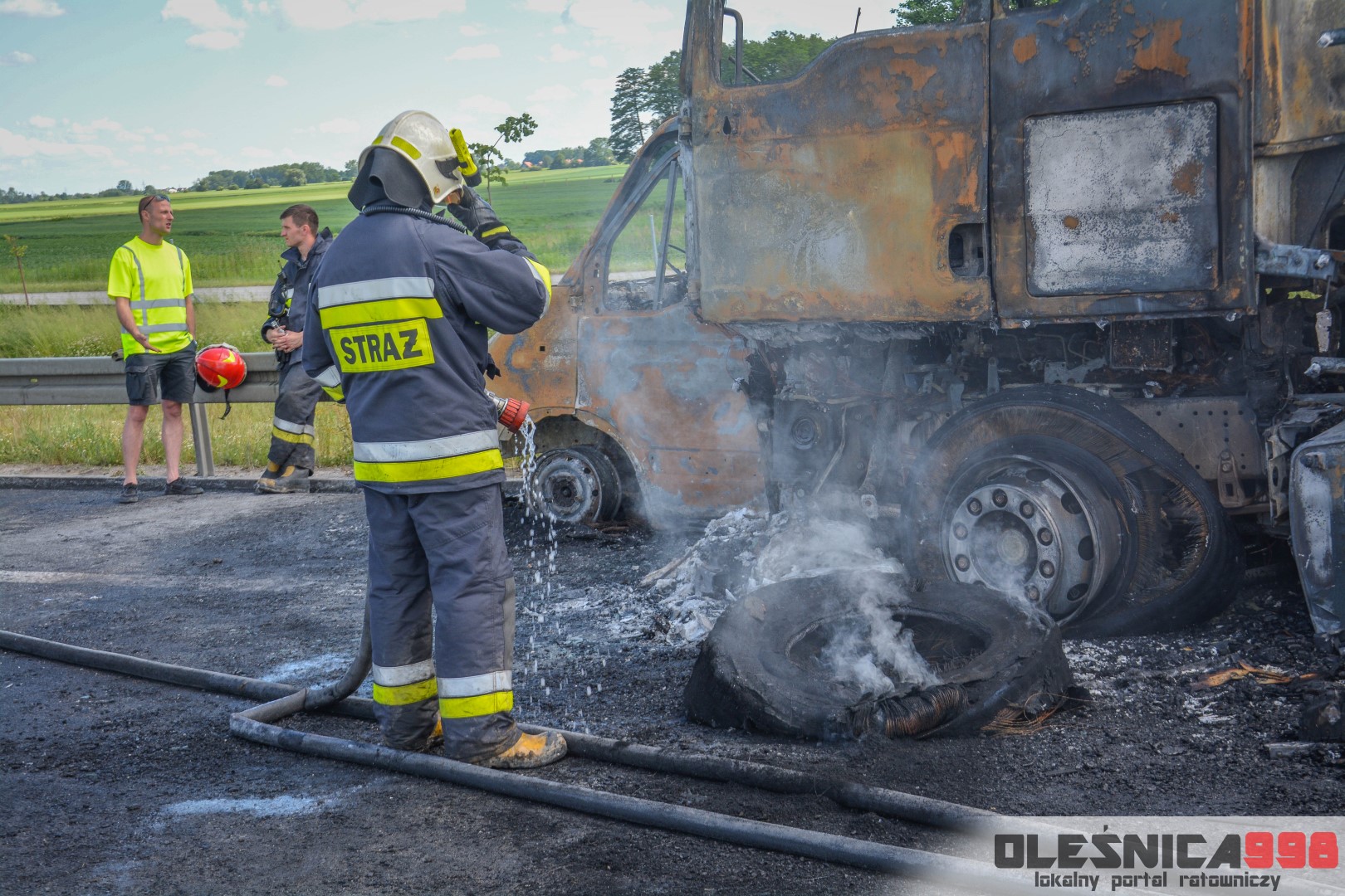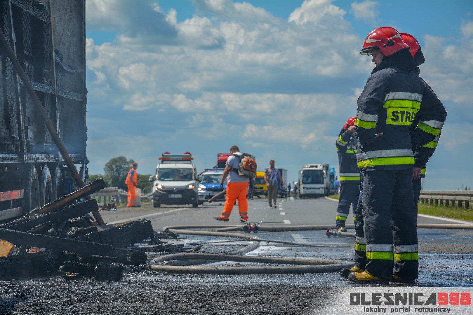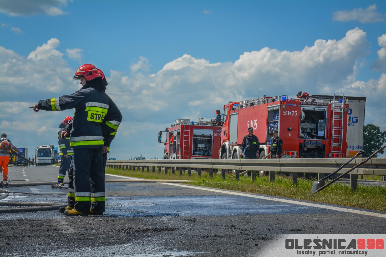 W trakcie dojazdu okazało się jednak, że w wyniku zderzenia oba pojazdy stanęły w ogniu. W momencie przybycia pierwszego zastępu na miejsce zdarzenia, oba samochody były całkowicie objęte ogniem. Początkowo zachodziła również obawa, że w zmiażdżonym busie mogli znajdować się ludzie. Ta informacja na szczęście nie potwierdziła się.