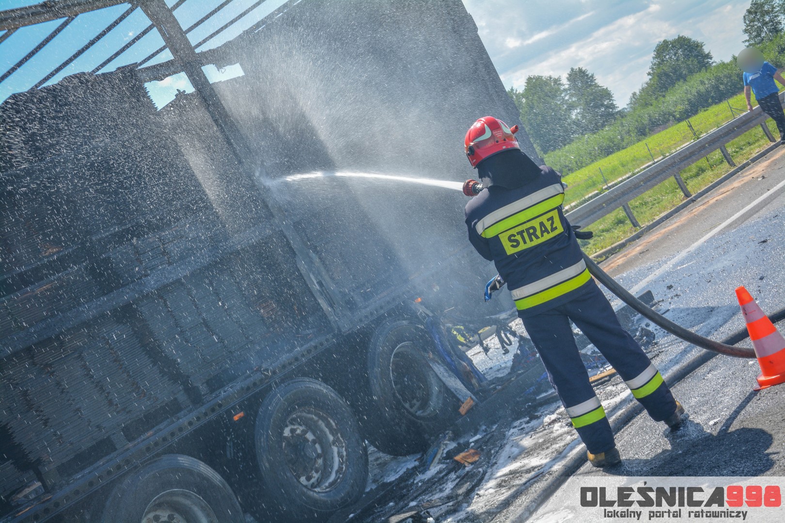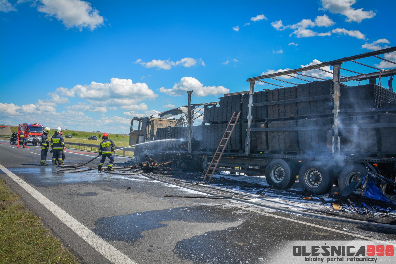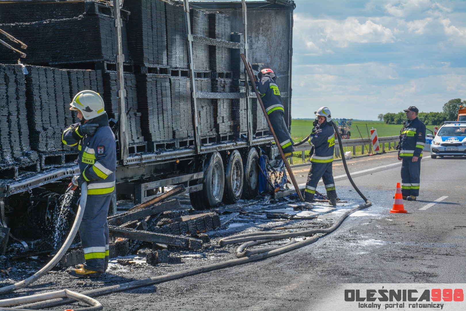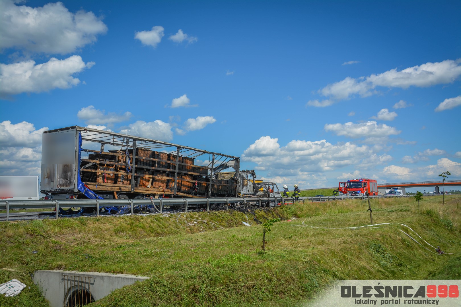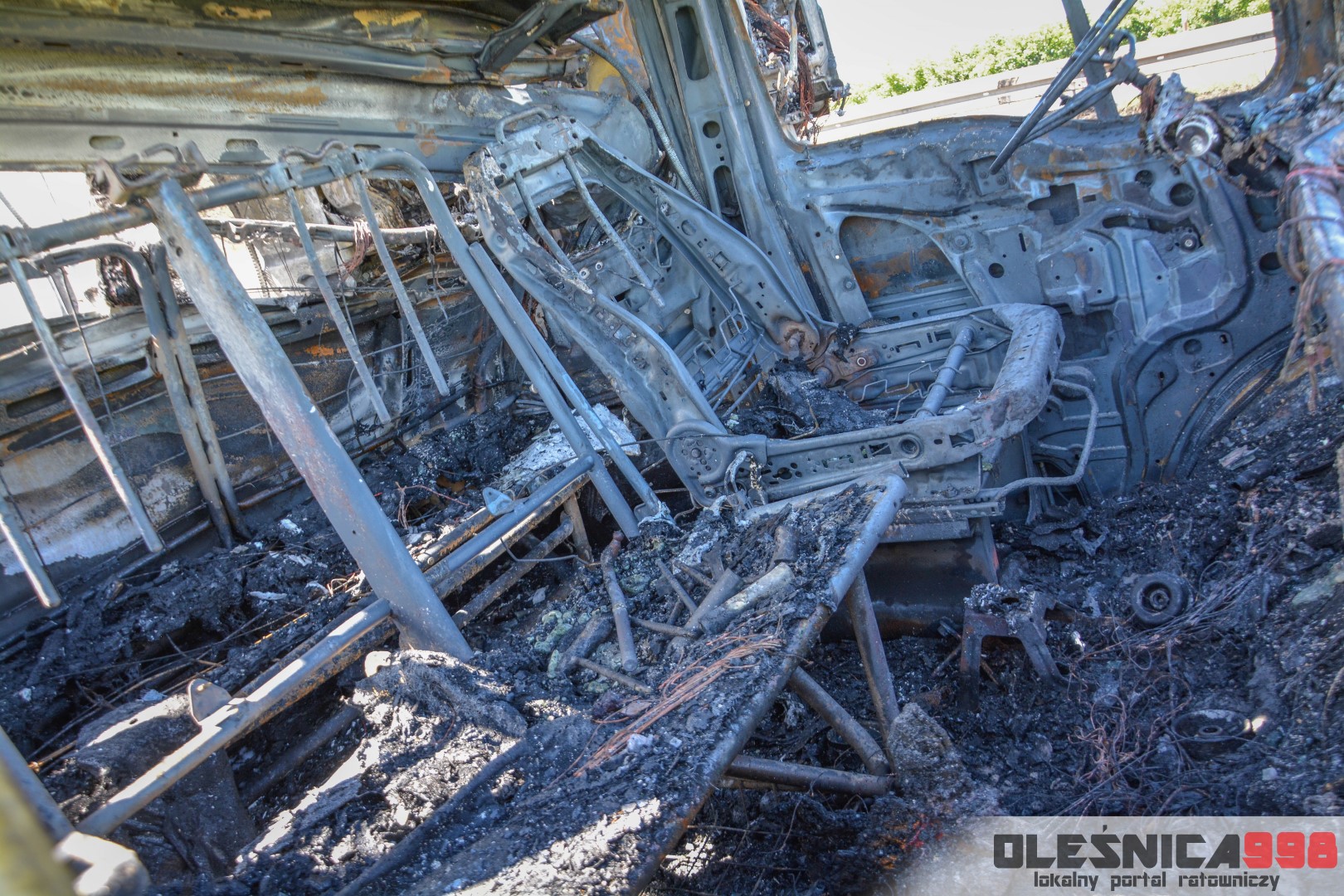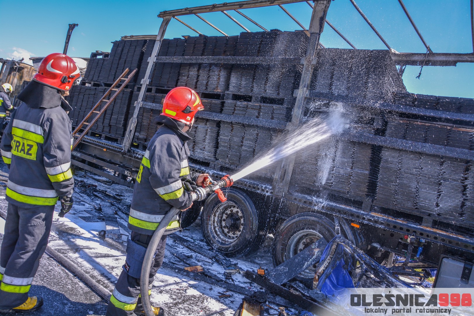 W trakcie dojazdu okazało się jednak, że w wyniku zderzenia oba pojazdy stanęły w ogniu. W momencie przybycia pierwszego zastępu na miejsce zdarzenia, oba samochody były całkowicie objęte ogniem. Początkowo zachodziła również obawa, że w zmiażdżonym busie mogli znajdować się ludzie. Ta informacja na szczęście nie potwierdziła się.
