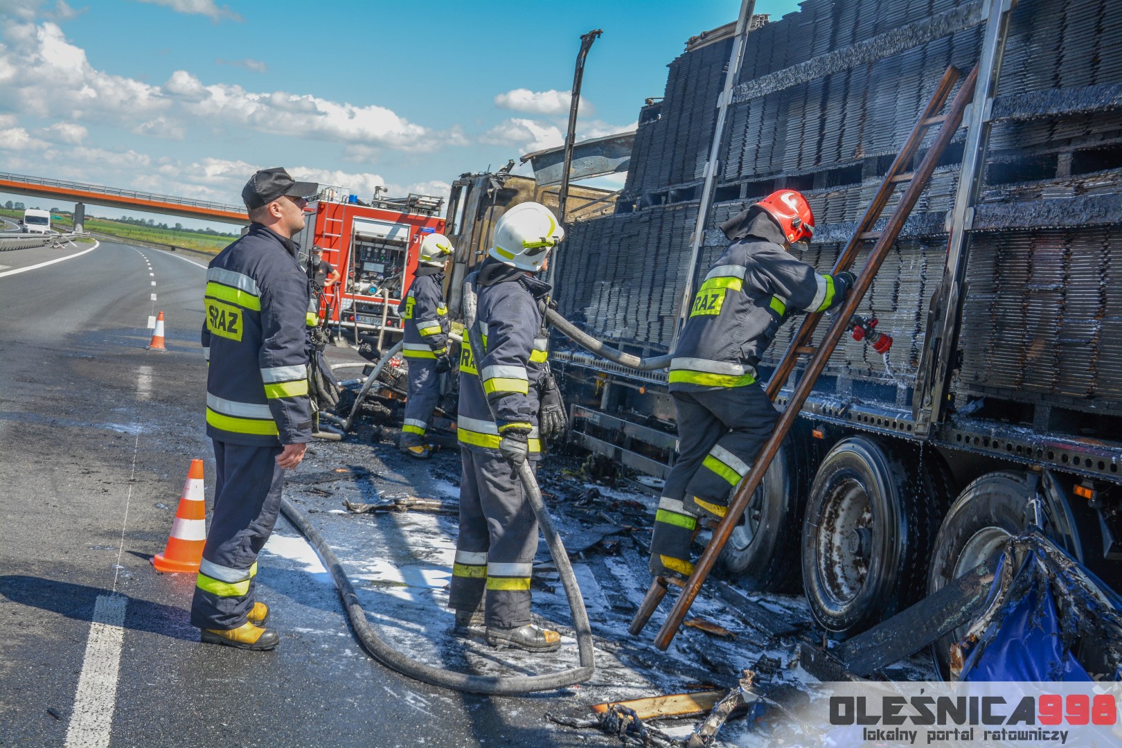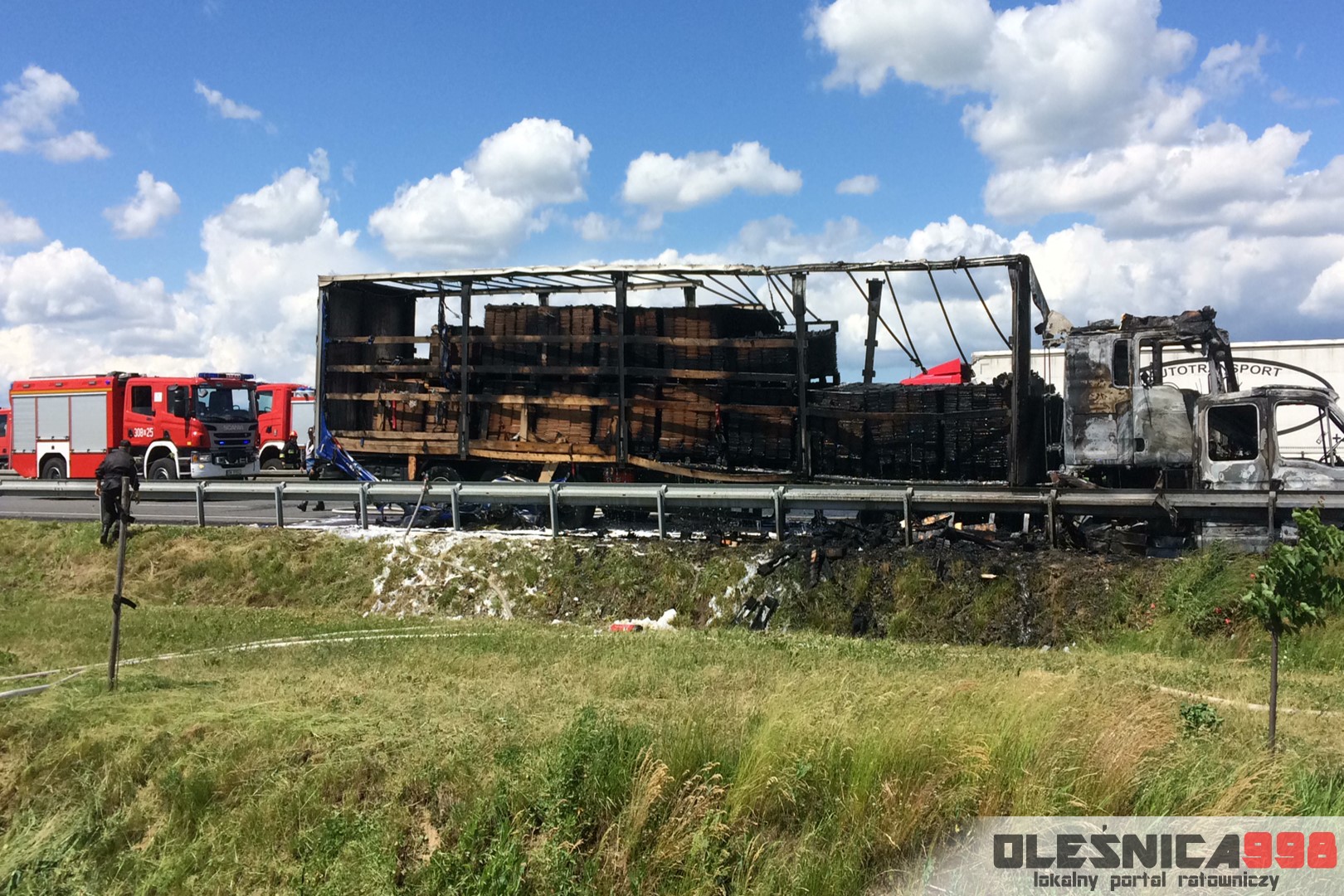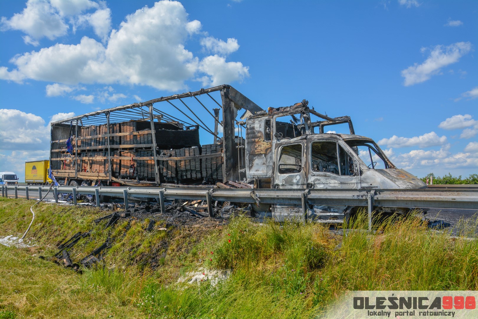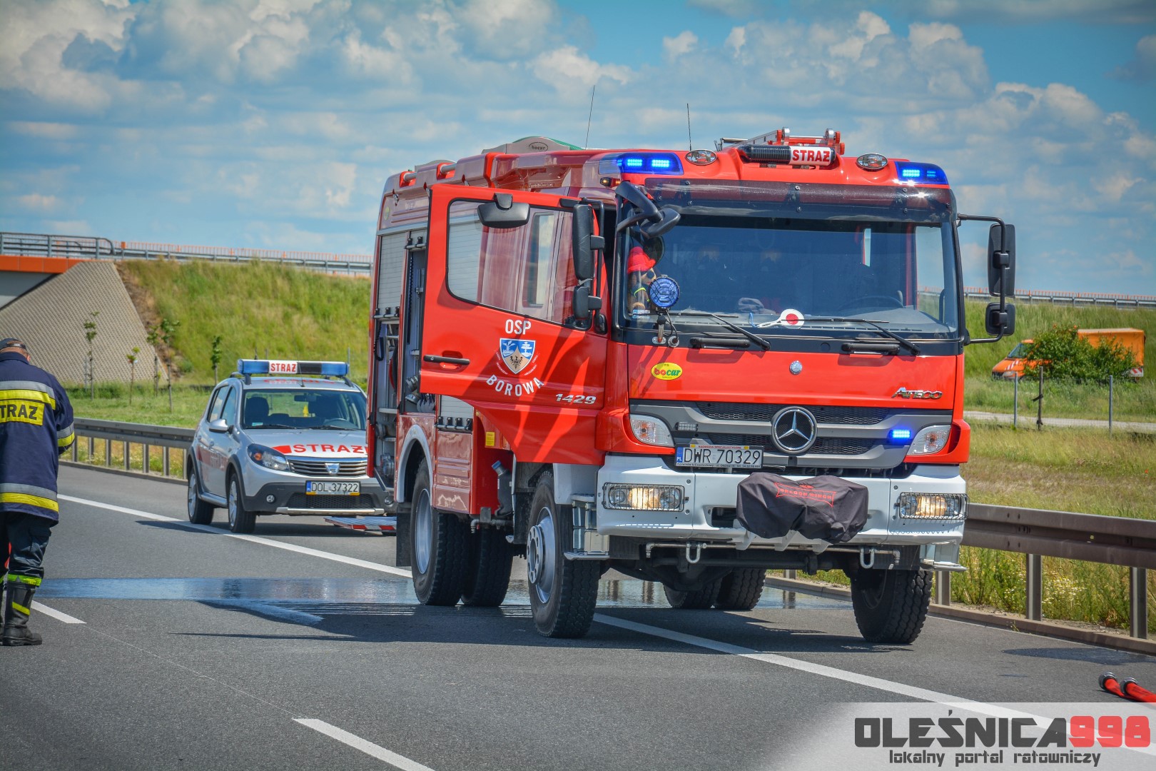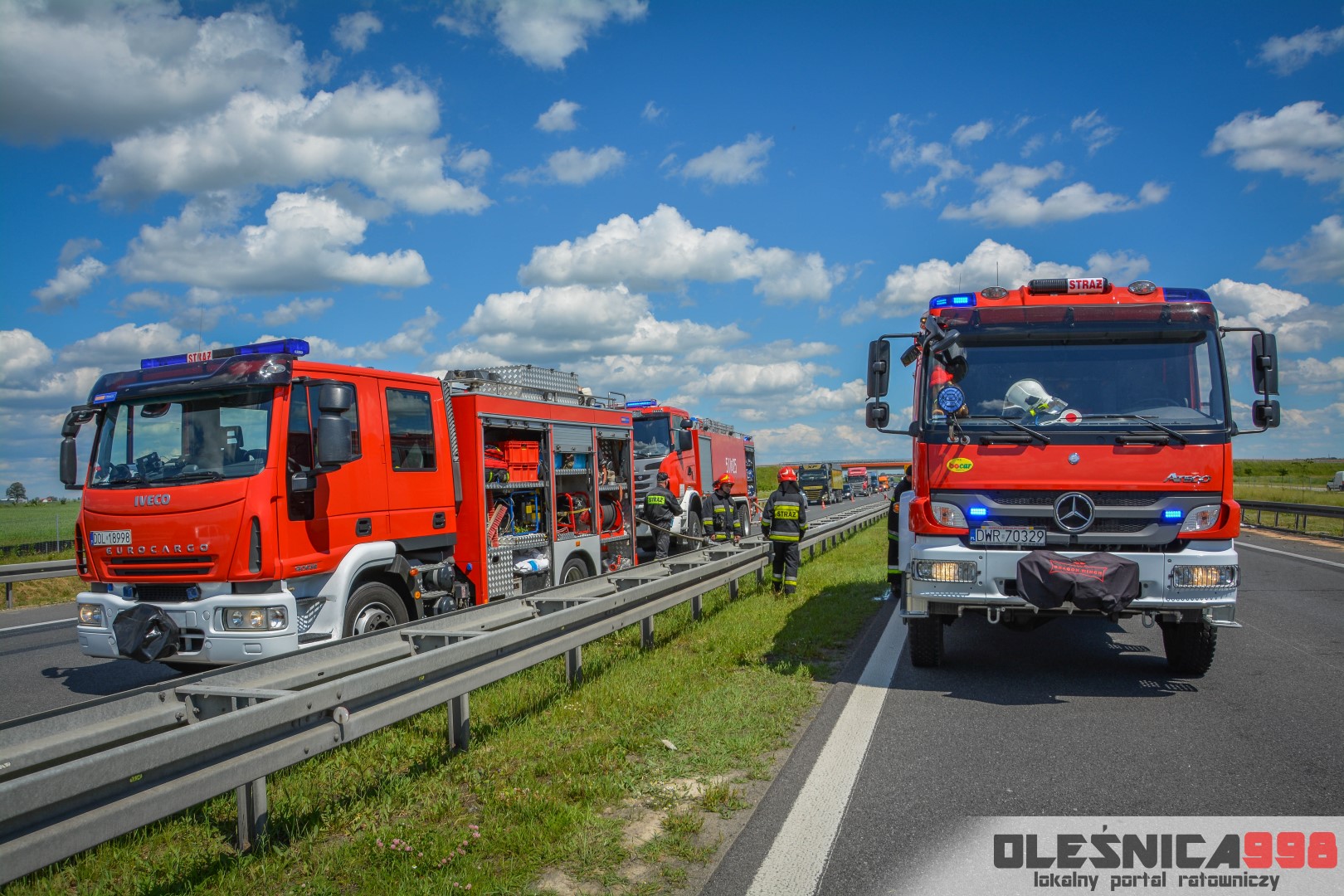 W trakcie dojazdu okazało się jednak, że w wyniku zderzenia oba pojazdy stanęły w ogniu. W momencie przybycia pierwszego zastępu na miejsce zdarzenia, oba samochody były całkowicie objęte ogniem. Początkowo zachodziła również obawa, że w zmiażdżonym busie mogli znajdować się ludzie. Ta informacja na szczęście nie potwierdziła się.