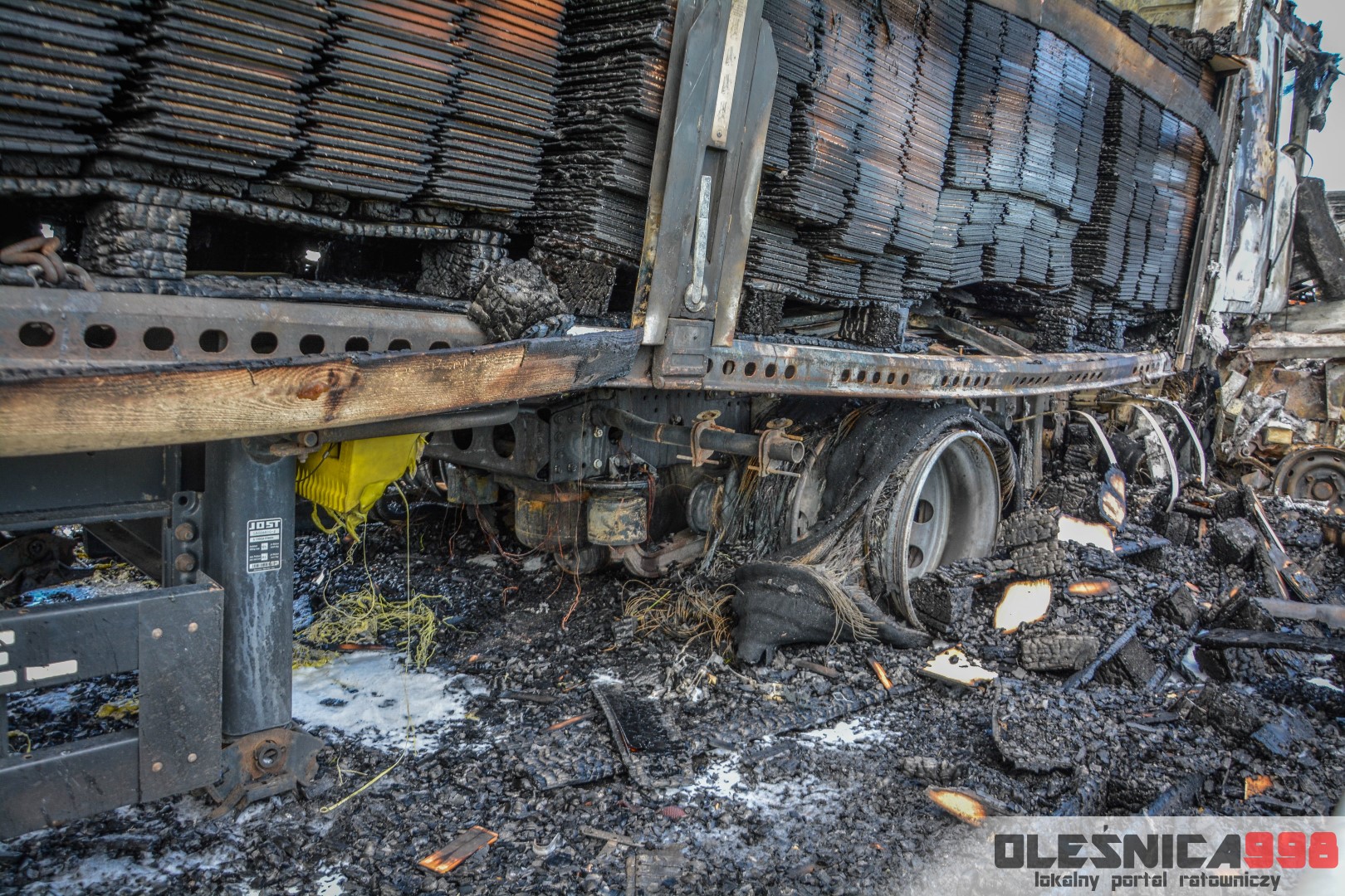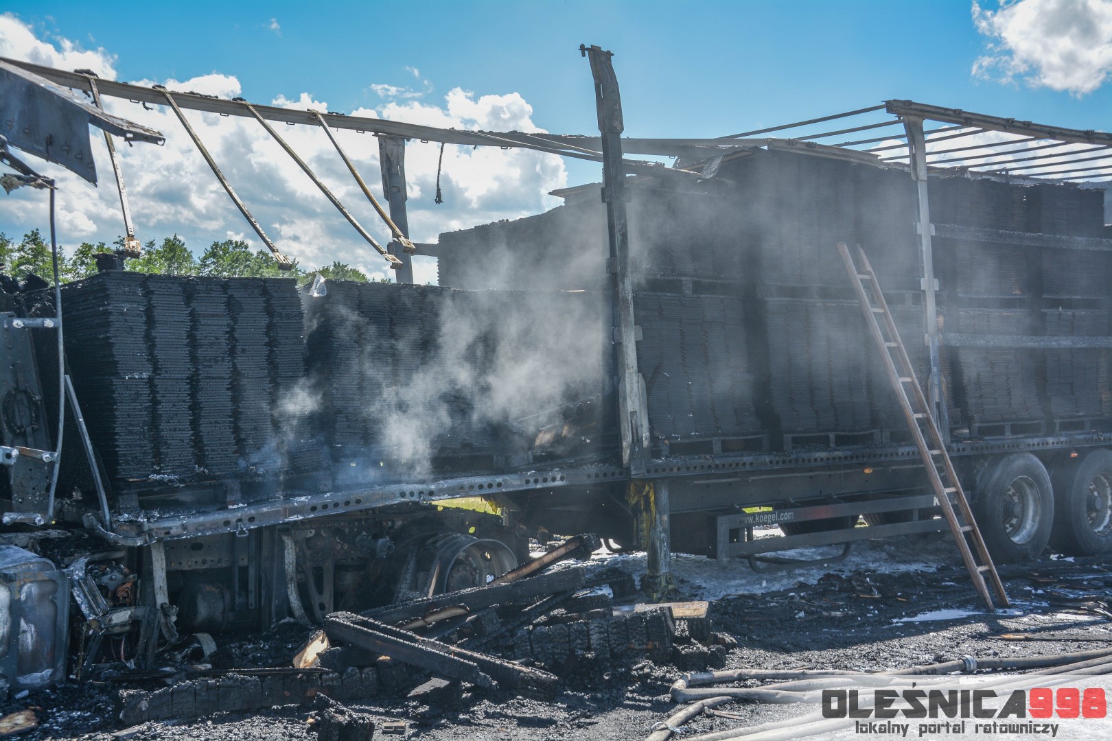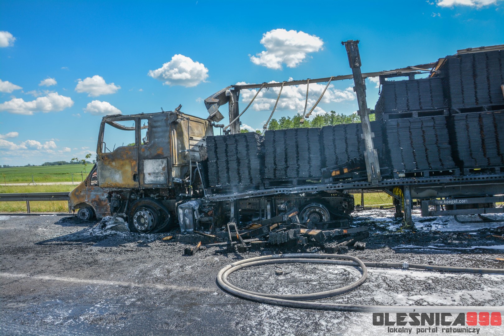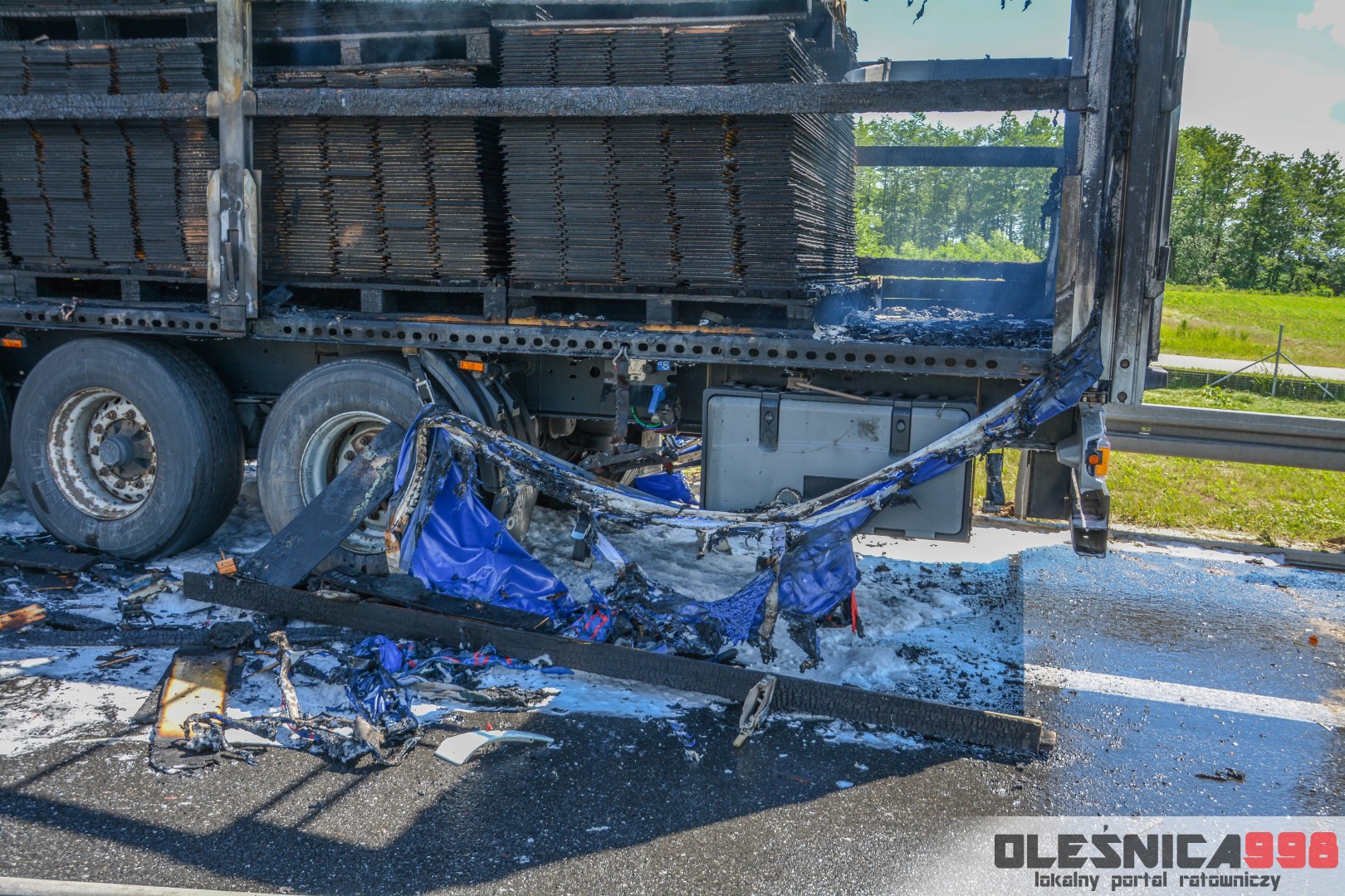 Samochód ciężarowy, na litewskich tablicach rejestracyjnych przewoził panele podłogowe. Po tym jak pożar objął kabinę ciągnika, przeniósł się na ładunek. Ten błyskawicznie cały zajął się ogniem. Spaleniu uległo 20 palet transportowanych paneli.