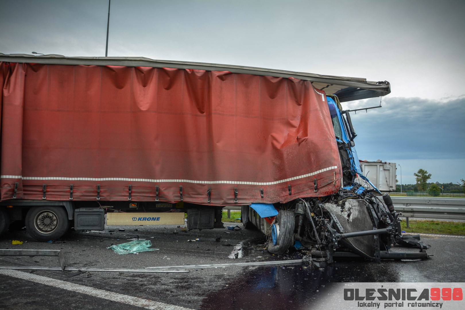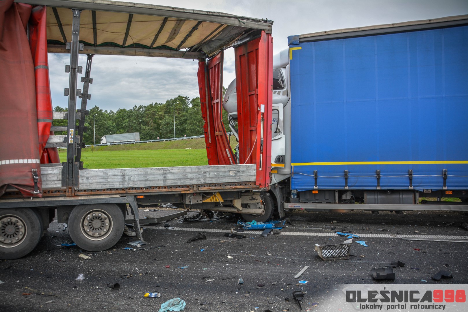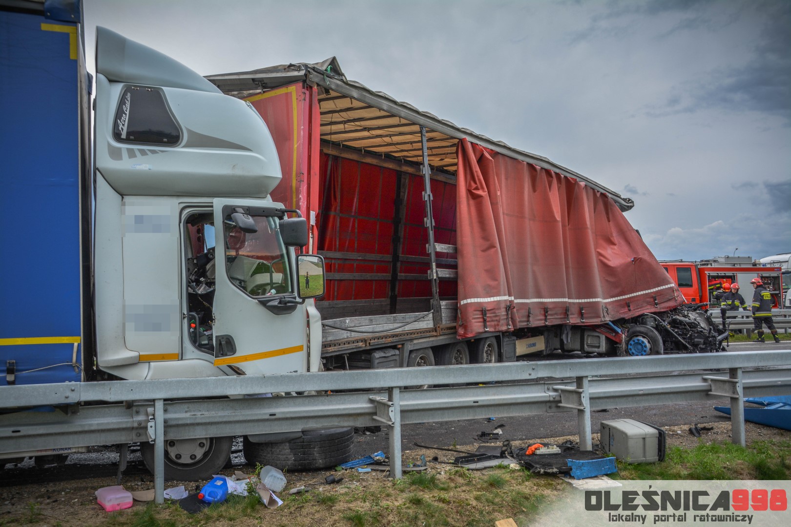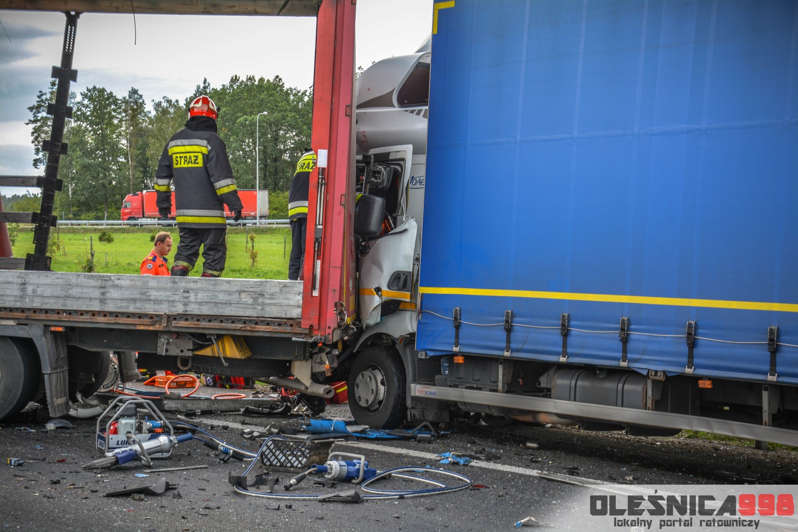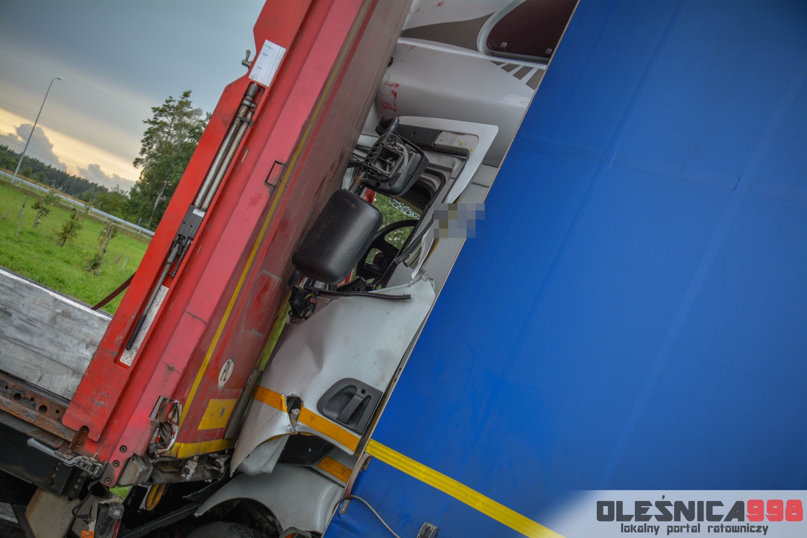 Dzisiejszego popołudnia, tuż przed godziną 15:30, na 59 kilometrze drogi S8 w kierunku Wrocławia doszło do bardzo poważnego zdarzenia drogowego. Zderzyły się tam trzy samochody ciężarowe. Trzy osoby zostały poszkodowane, z czego jedna z nich zakleszczona wewnątrz rozbitej kabiny. Informację o zdarzeniu odebrały wszystkie lokalne służby, a po chwili do akcji wyruszyły dwa zastępy z JRG Oleśnica, zespół Ratownictwa Medycznego oraz patrol Policji.