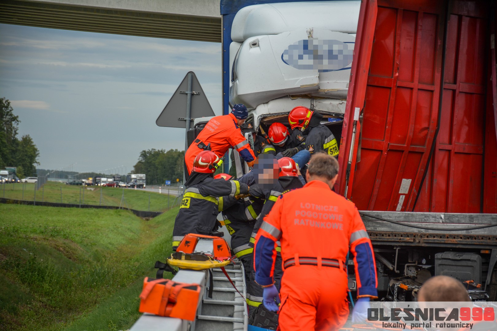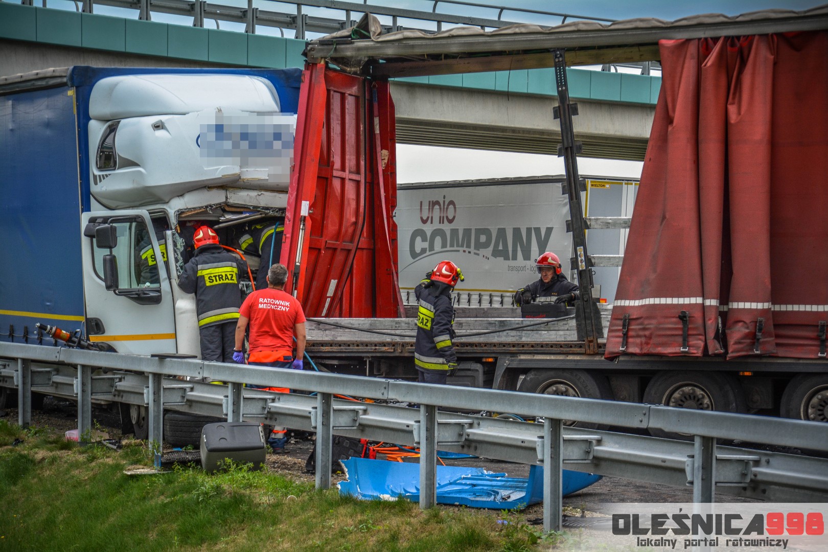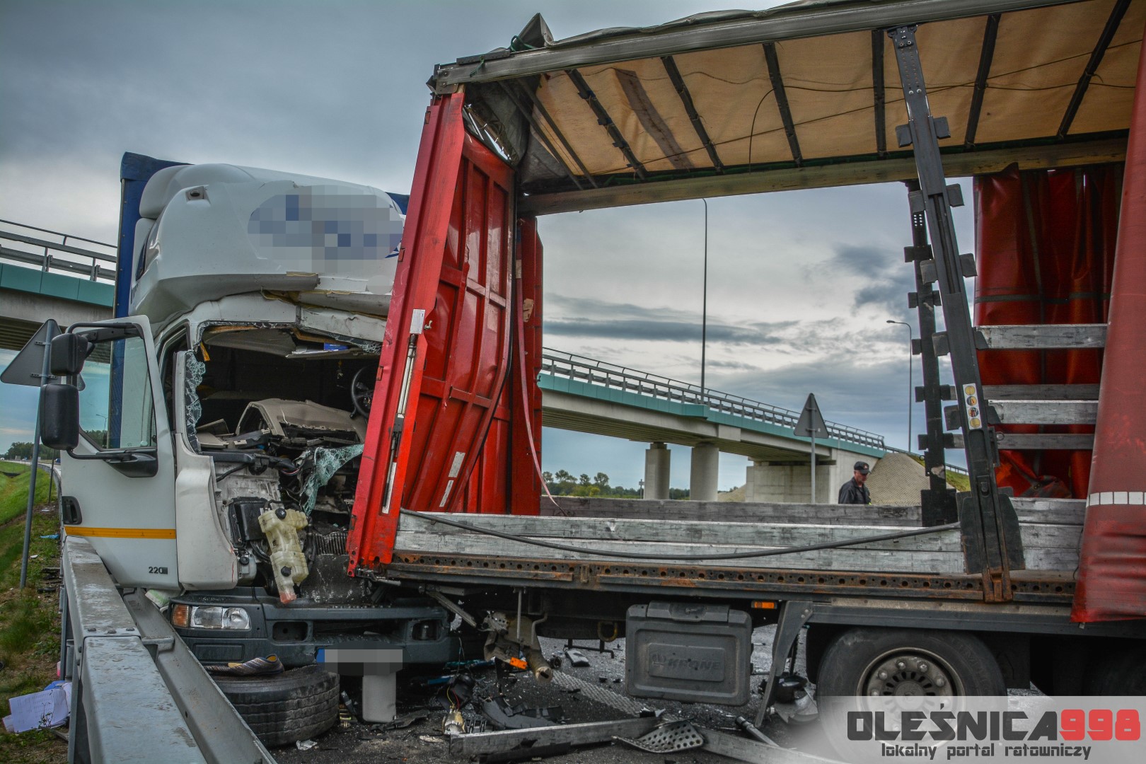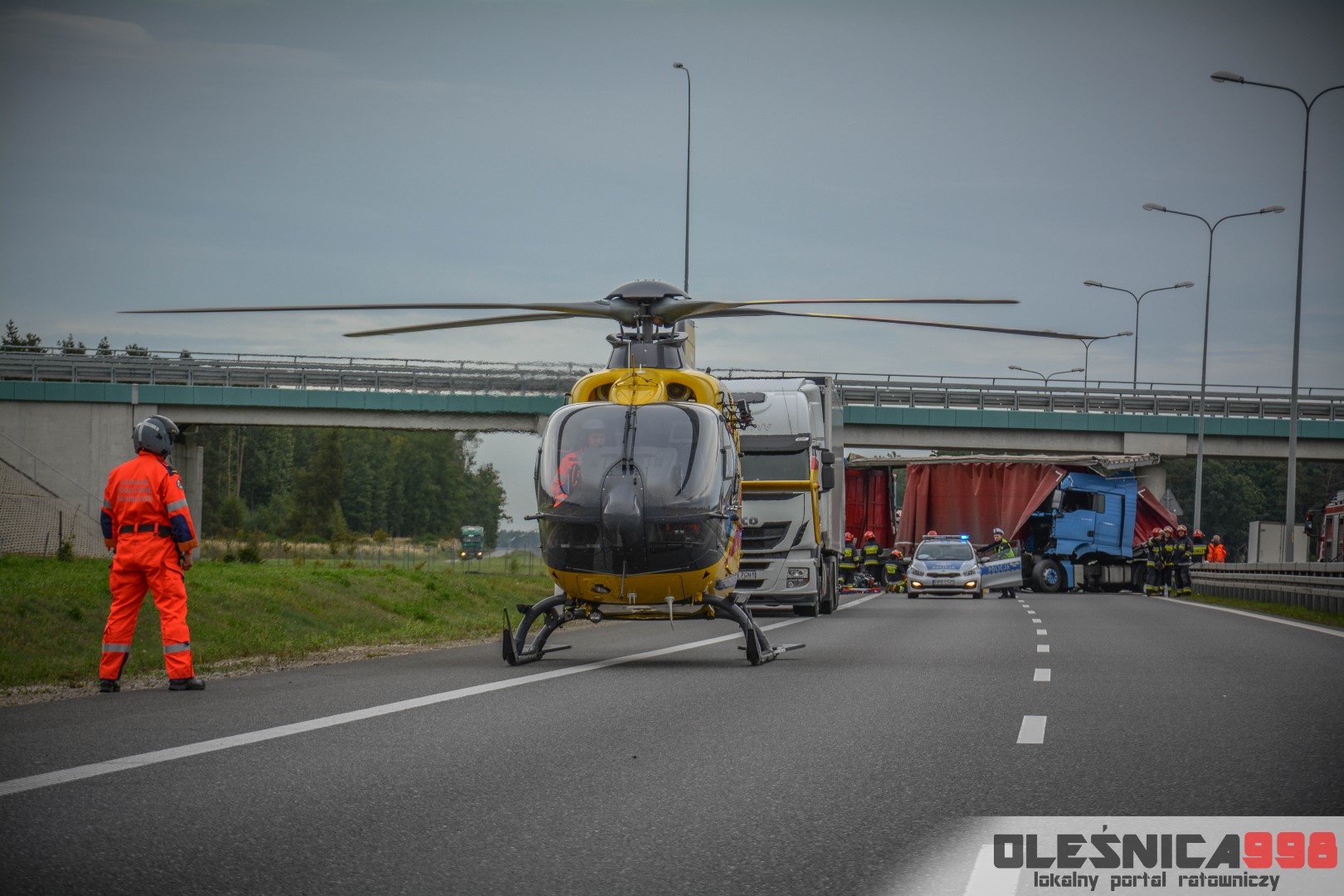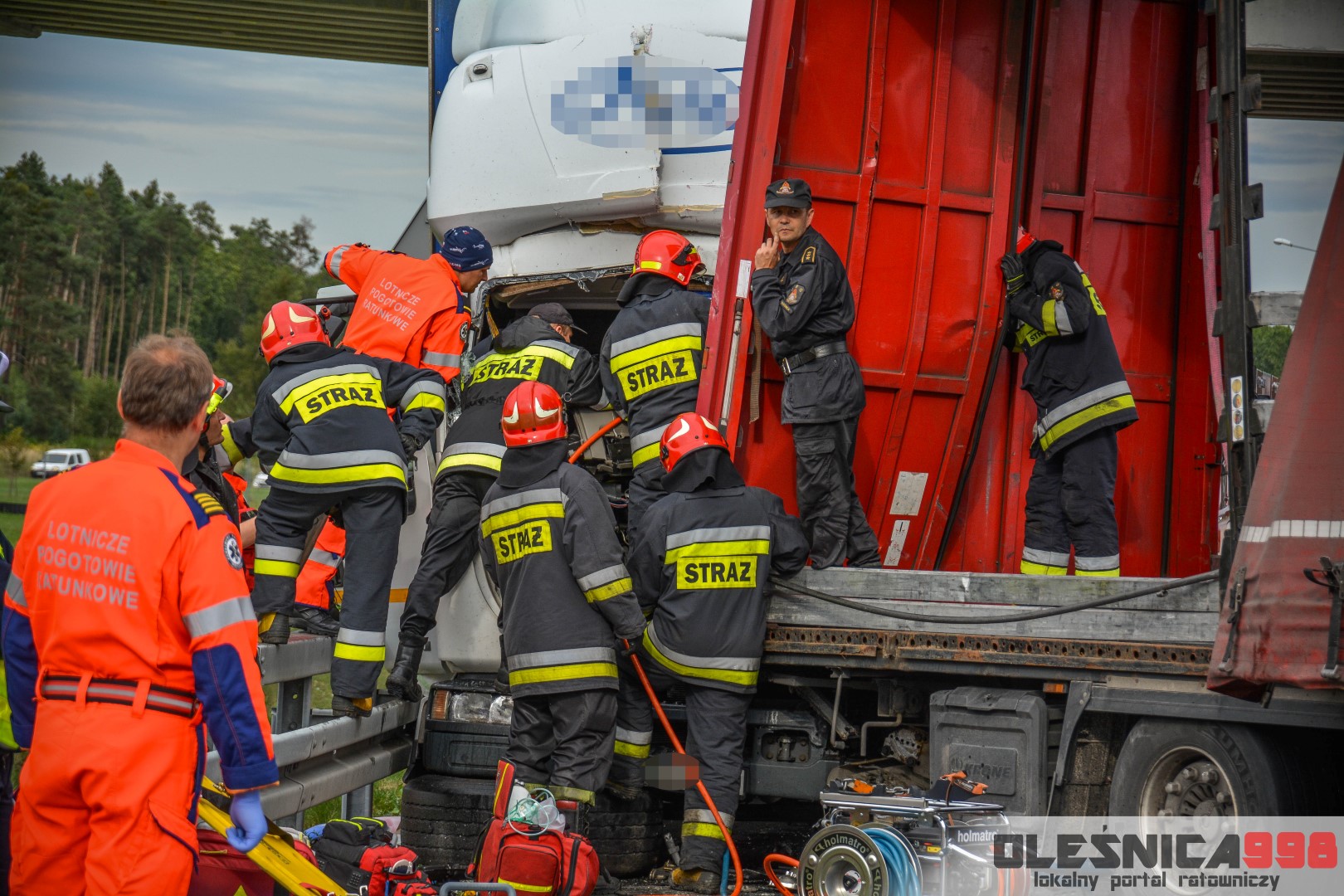 Dzisiejszego popołudnia, tuż przed godziną 15:30, na 59 kilometrze drogi S8 w kierunku Wrocławia doszło do bardzo poważnego zdarzenia drogowego. Zderzyły się tam trzy samochody ciężarowe. Trzy osoby zostały poszkodowane, z czego jedna z nich zakleszczona wewnątrz rozbitej kabiny. Informację o zdarzeniu odebrały wszystkie lokalne służby, a po chwili do akcji wyruszyły dwa zastępy z JRG Oleśnica, zespół Ratownictwa Medycznego oraz patrol Policji.