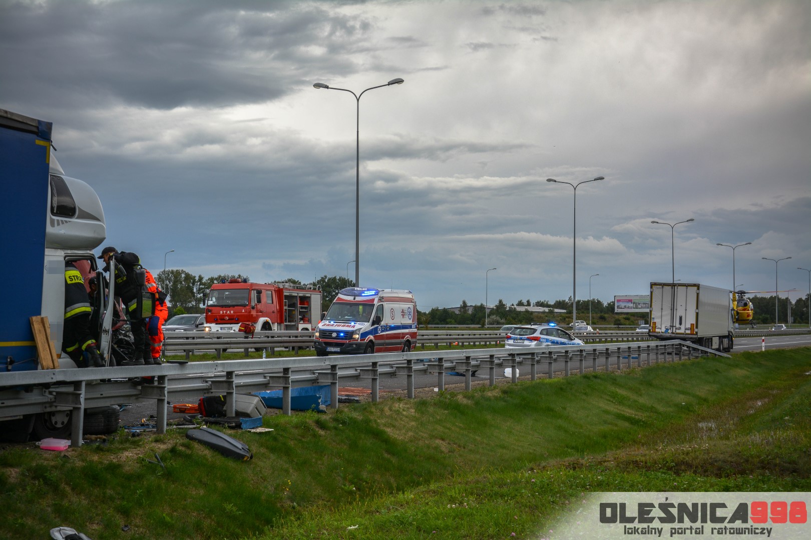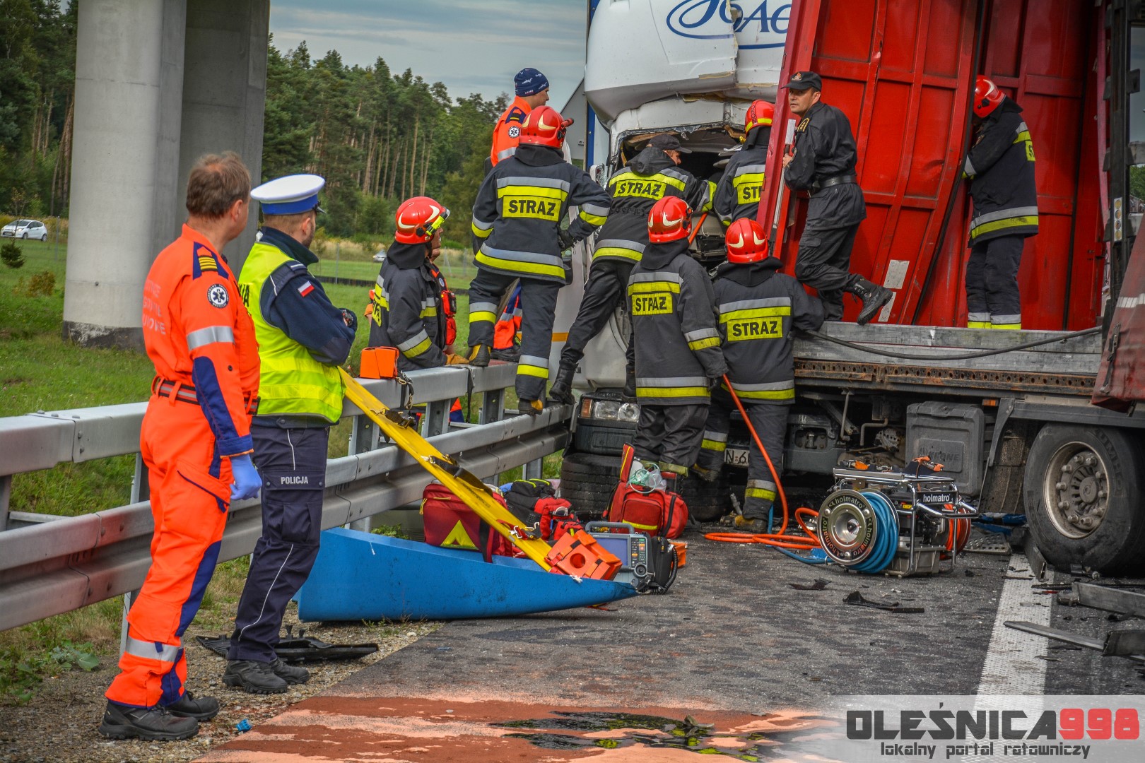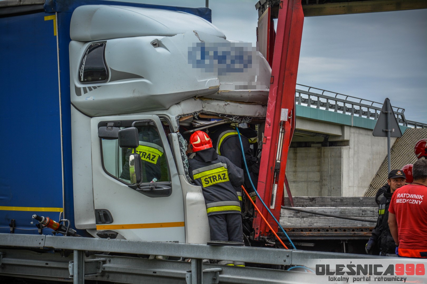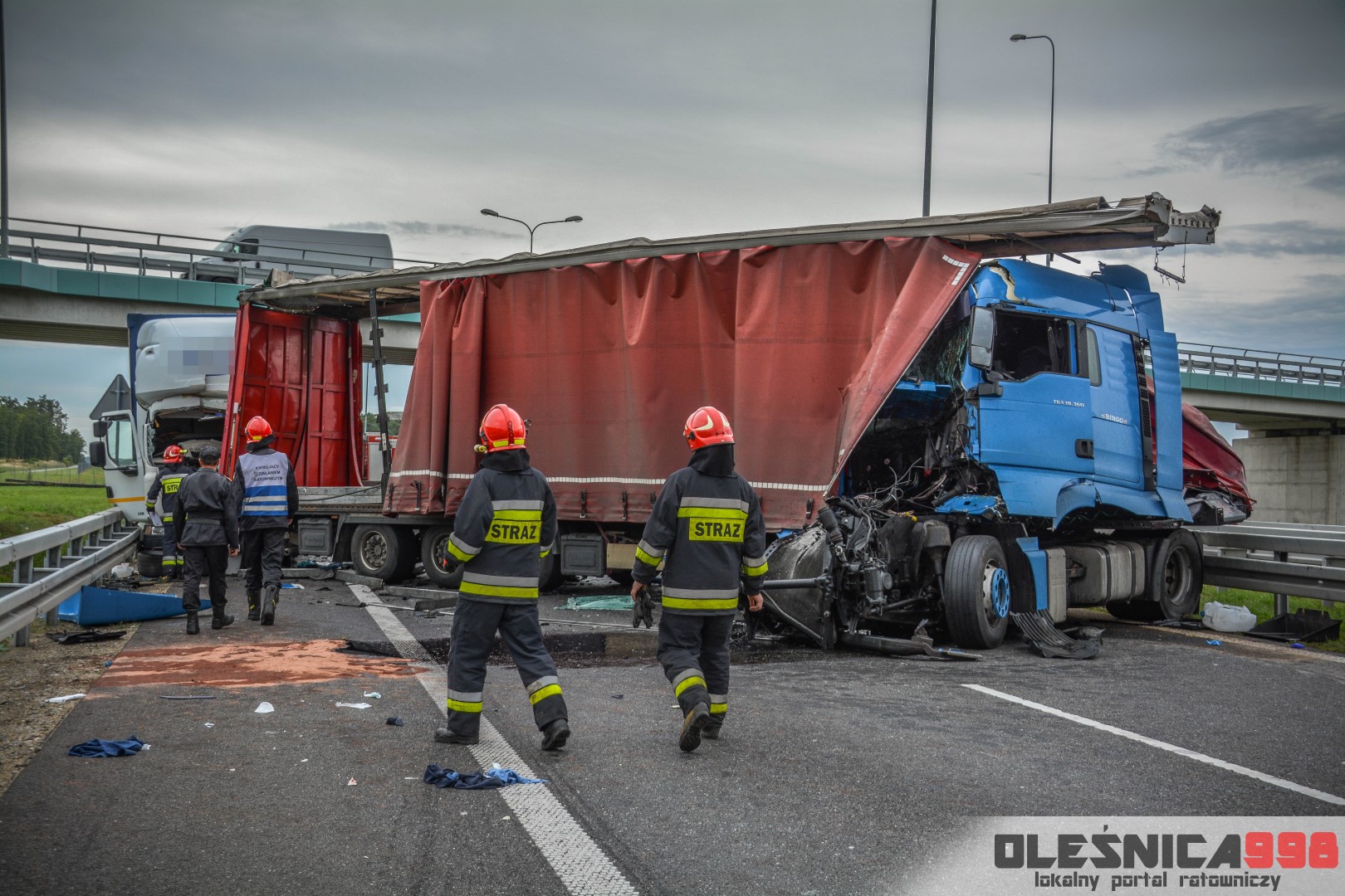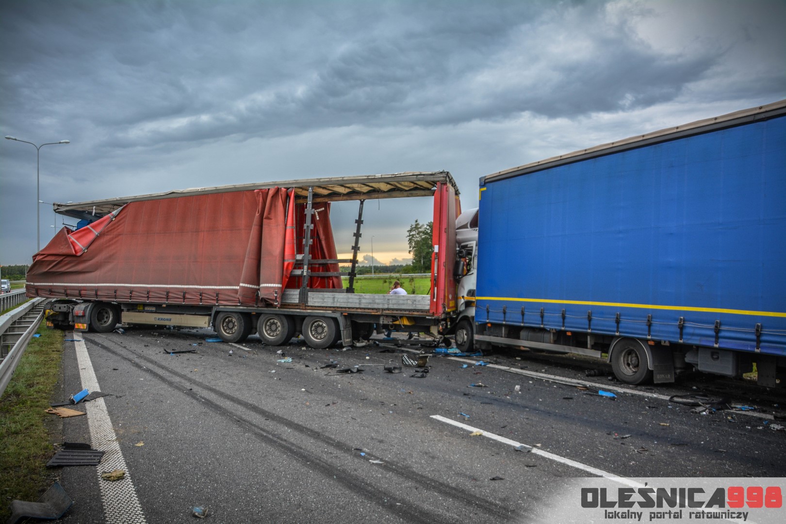 Dzisiejszego popołudnia, tuż przed godziną 15:30, na 59 kilometrze drogi S8 w kierunku Wrocławia doszło do bardzo poważnego zdarzenia drogowego. Zderzyły się tam trzy samochody ciężarowe. Trzy osoby zostały poszkodowane, z czego jedna z nich zakleszczona wewnątrz rozbitej kabiny. Informację o zdarzeniu odebrały wszystkie lokalne służby, a po chwili do akcji wyruszyły dwa zastępy z JRG Oleśnica, zespół Ratownictwa Medycznego oraz patrol Policji.