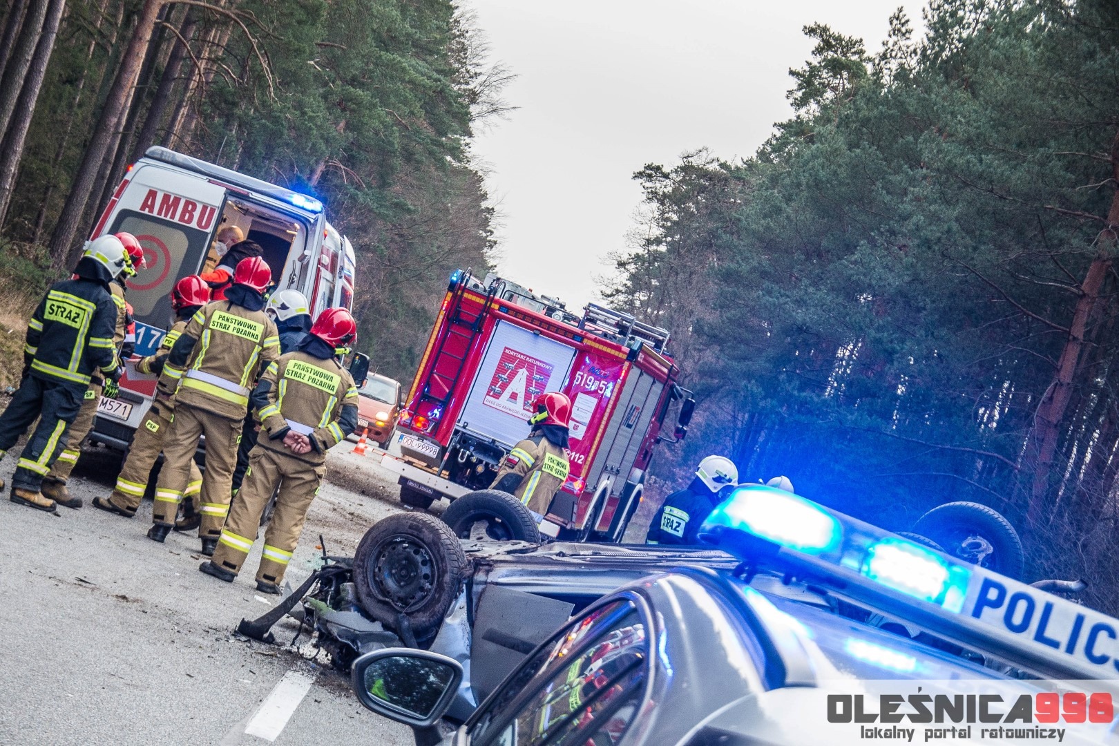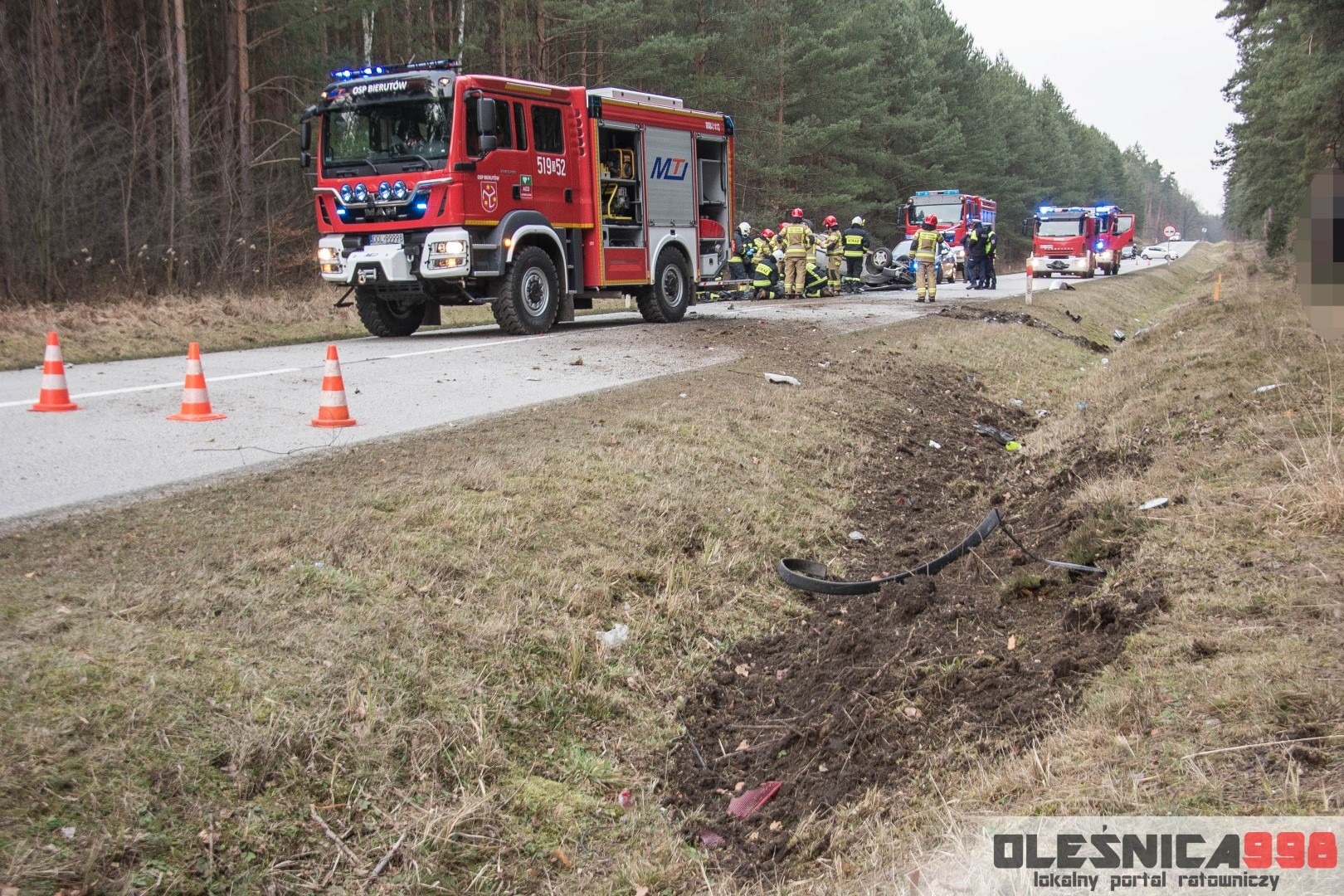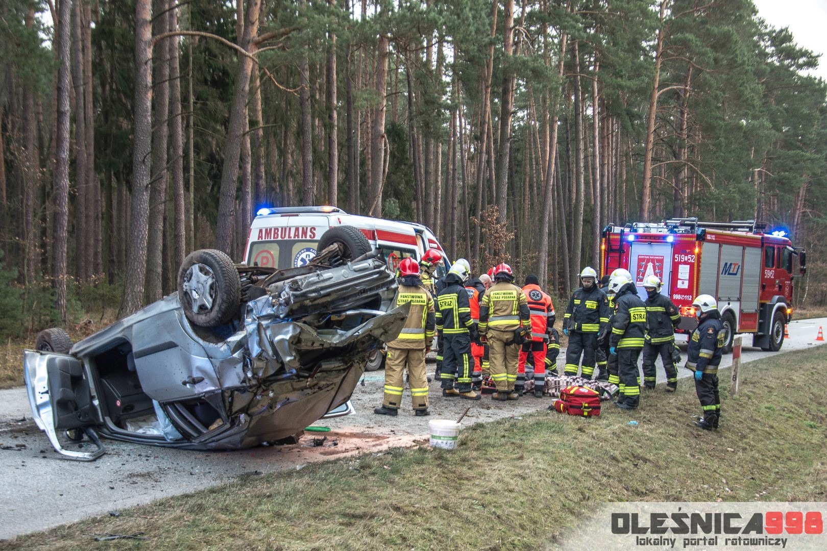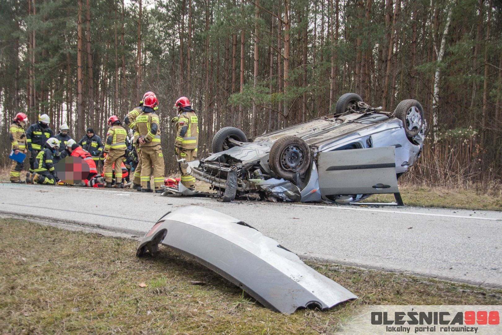 Dzisiejszego popołudnia, tuż po godzinie 15:00, Dyżurny Operacyjny Stanowiska Kierowania Komendanta Powiatowego Państwowej Straży Pożarnej w Oleśnicy odebrał zgłoszenie z Wojewódzkiego Centrum Powiadamia Ratunkowego, dotyczące dachowania samochodu osobowego na drodze wojewódzkiej nr 396 w miejscowości Karwiniec (gm. Bierutów). Ze wstępnych informacji wynikało, że poszkodowana jest jedna osoba, która został uwięziona wewnątrz wraku. Po doprecyzowaniu zgłoszenia okazało się, że poszkodowany kierowca osobówki został ewakuowany na zewnątrz i znajduje się pod opieką osób postronnych. Na miejsce zostały niezwłocznie zadysponowane po dwa zastępy z Jednostki Ratowniczo – Gaśniczej w Oleśnicy oraz miejscowej Ochotniczej Straży Pożarnej z Bierutowa. Do zdarzenia zostali także skierowani oleśniccy Policjanci Wydziału Ruchu Drogowego a także Ratownicy Medyczny wrocławskiego Pogotowia Ratunkowego.