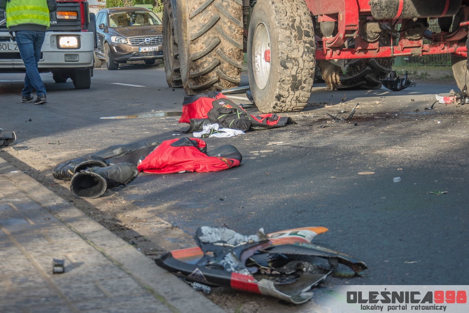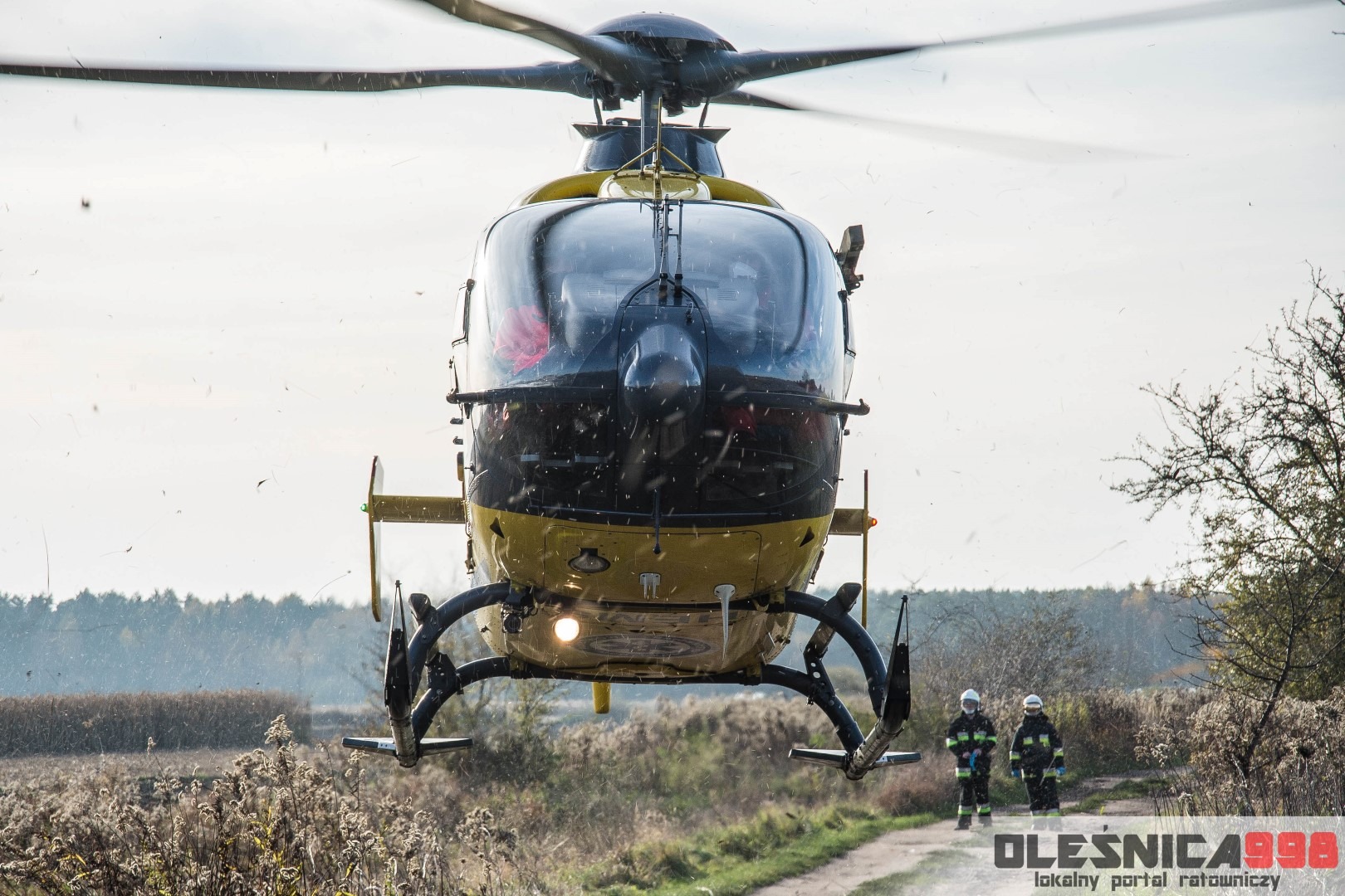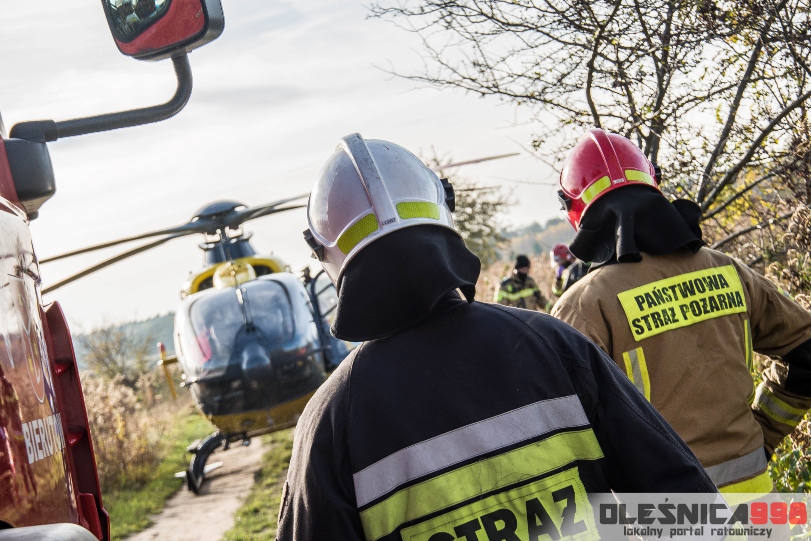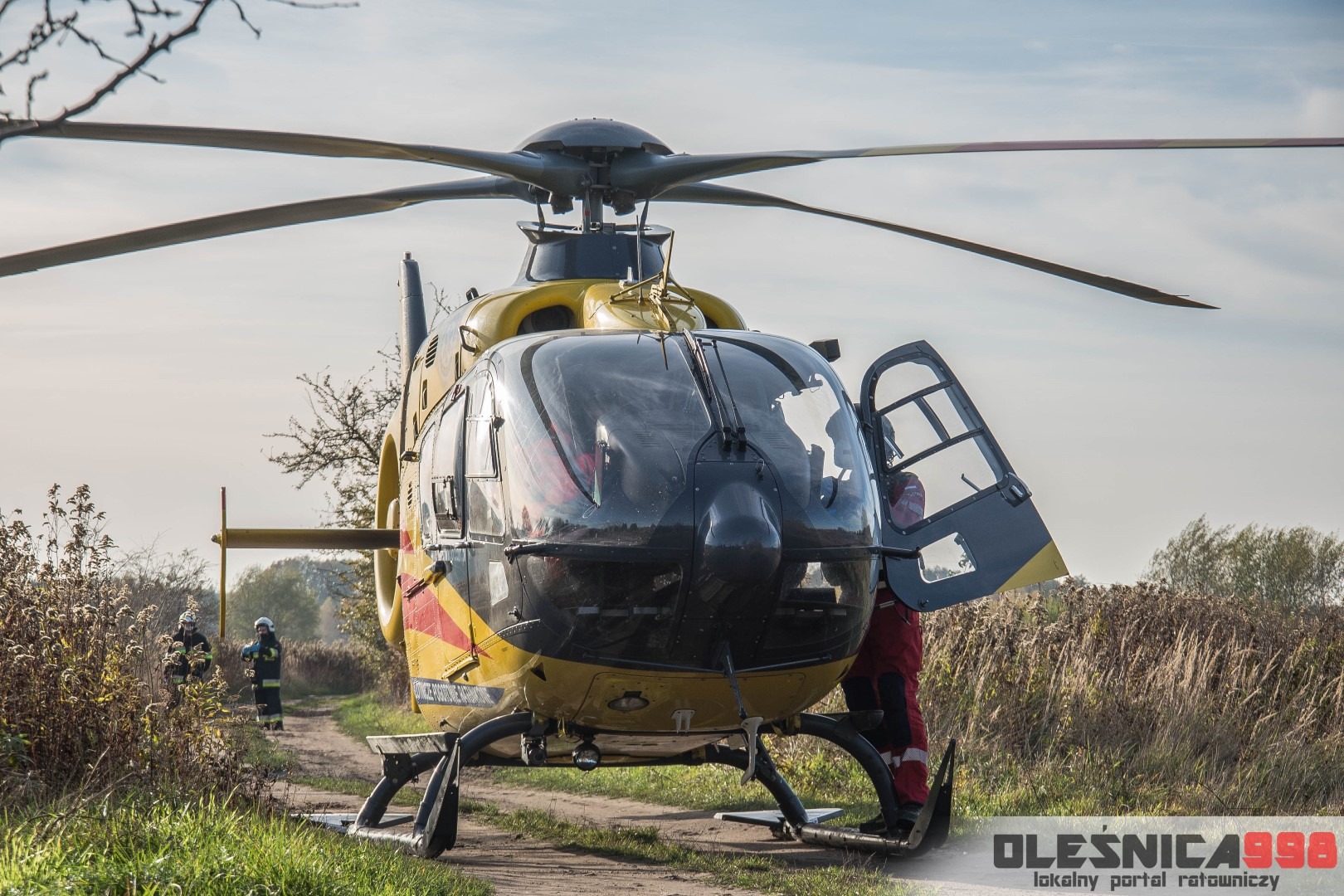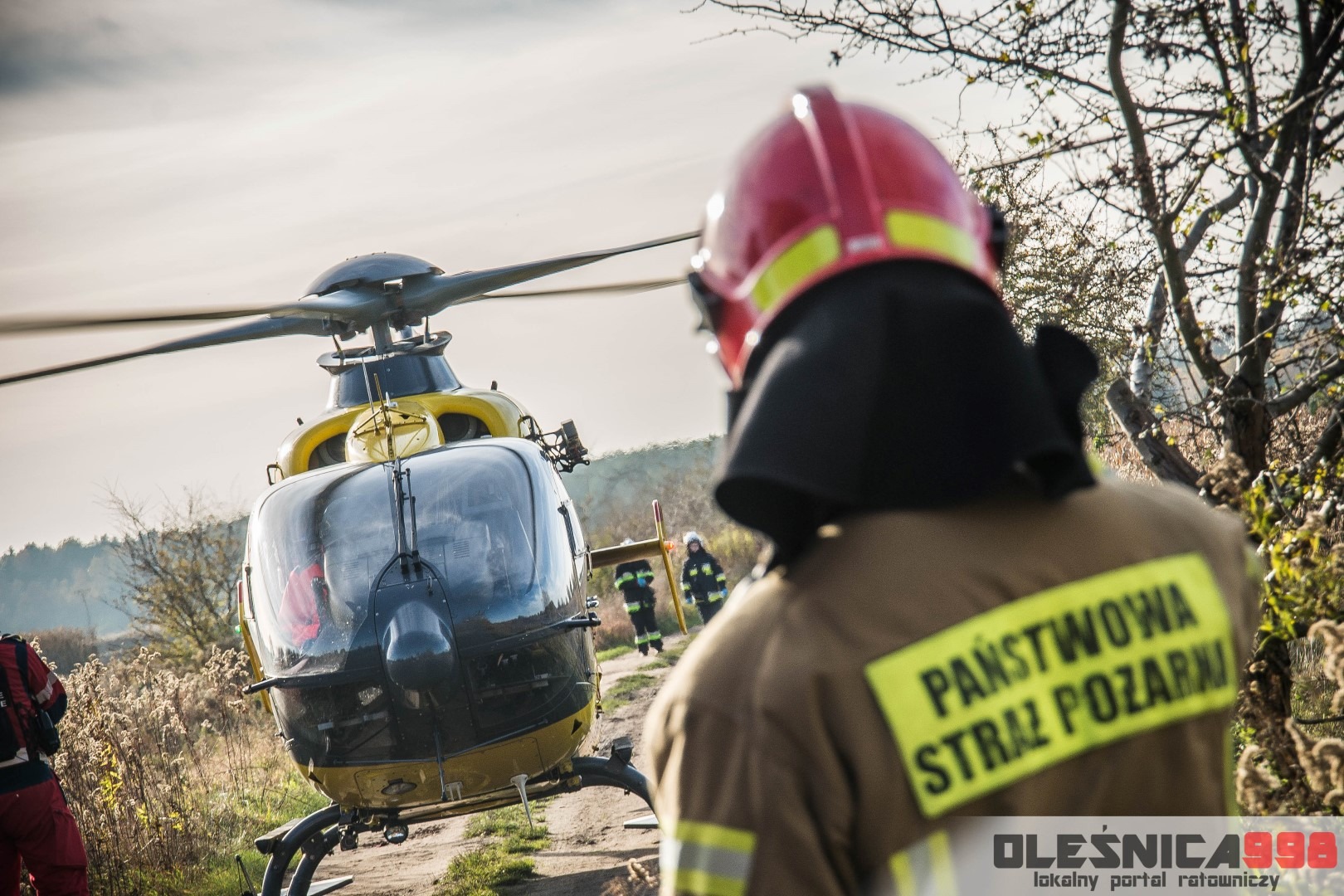 Dziś około południa, Dyżurny Operacyjny Stanowiska Kierowania Komendanta Powiatowego Państwowej Straży Pożarnej w Oleśnicy odebrał zgłoszenie o groźnym wypadku komunikacyjnym z udziałem motocyklisty i ciągnika rolniczego, do jakiego doszło na drodze wojewódzkiej nr 396 w miejscowości Karwiniec. Ze wstępnych informacji wynikało, że ciężko ranny został kierowca jednośladu. Na miejsce niezwłocznie zostały zadysponowane po dwa zastępy z Jednostki Ratowniczo- Gaśniczej z Oleśnicy oraz pobliskiej jednostki OSP w Bierutowie. Do zdarzenia skierowano również śmigłowiec Lotniczego Pogotowia Ratunkowego z Wrocławia i patrole Policji.