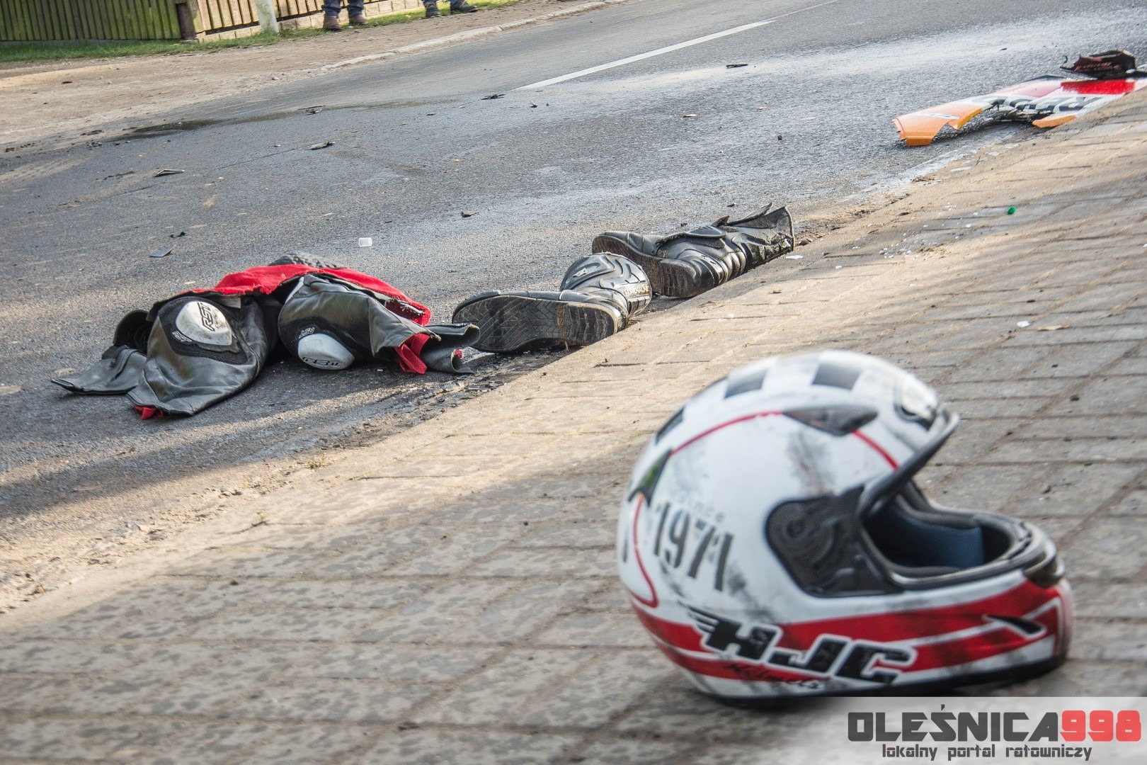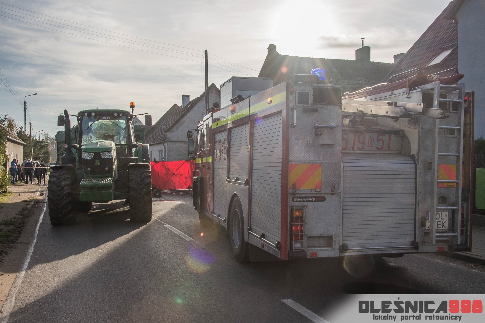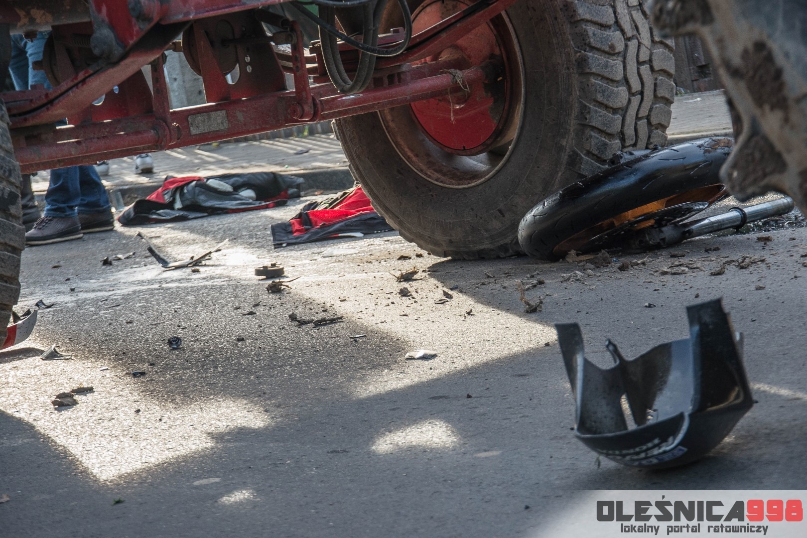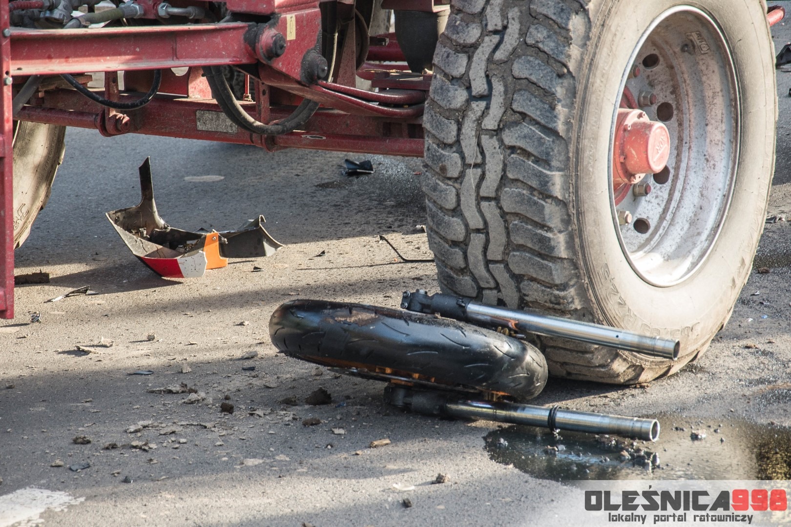 Dziś około południa, Dyżurny Operacyjny Stanowiska Kierowania Komendanta Powiatowego Państwowej Straży Pożarnej w Oleśnicy odebrał zgłoszenie o groźnym wypadku komunikacyjnym z udziałem motocyklisty i ciągnika rolniczego, do jakiego doszło na drodze wojewódzkiej nr 396 w miejscowości Karwiniec. Ze wstępnych informacji wynikało, że ciężko ranny został kierowca jednośladu. Na miejsce niezwłocznie zostały zadysponowane po dwa zastępy z Jednostki Ratowniczo- Gaśniczej z Oleśnicy oraz pobliskiej jednostki OSP w Bierutowie. Do zdarzenia skierowano również śmigłowiec Lotniczego Pogotowia Ratunkowego z Wrocławia i patrole Policji.