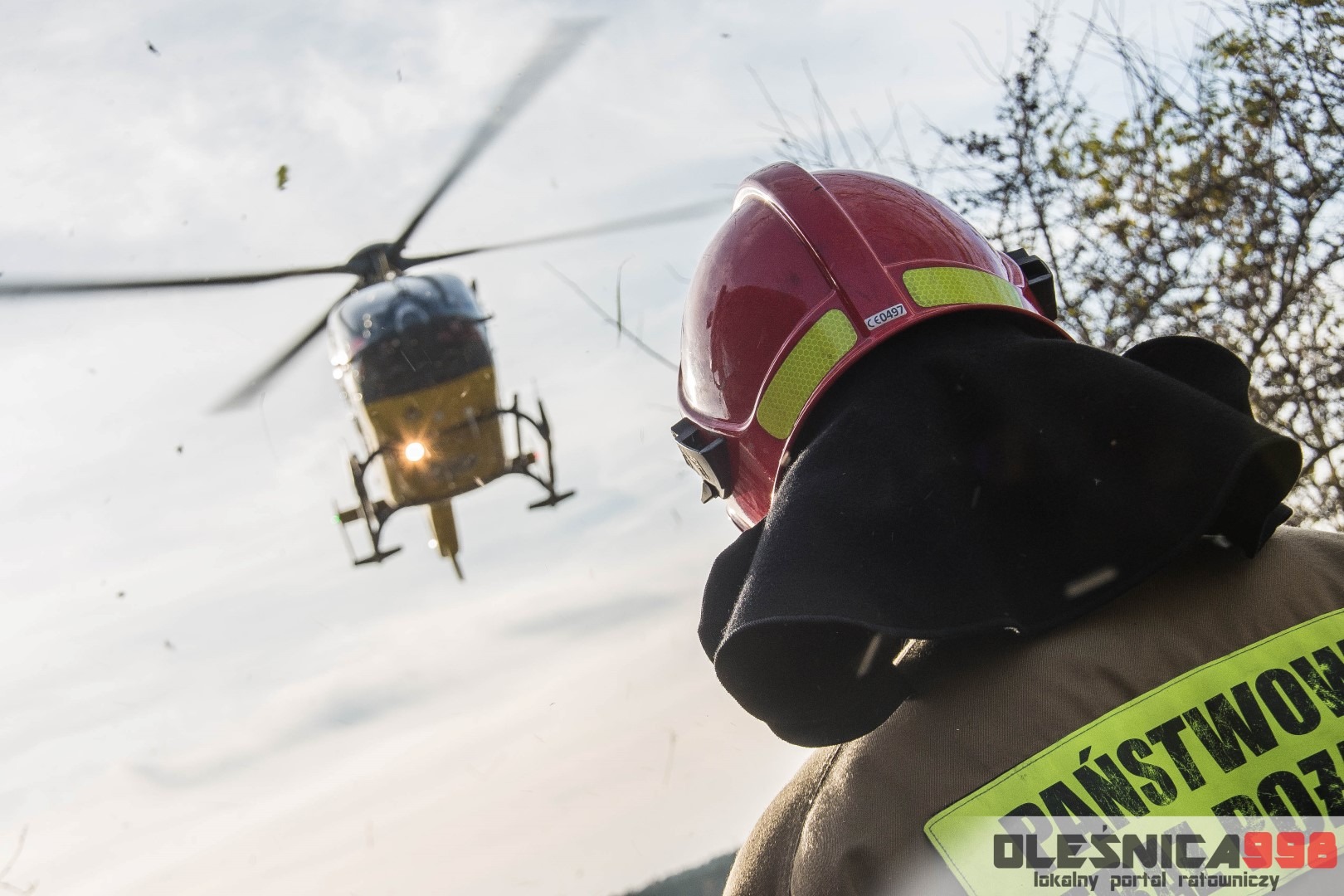 Wkrótce nad miejscem wypadku pojawił się śmigłowiec Lotniczego Pogotowia Ratunkowego – Ratownik 13, który przyziemił kilkadziesiąt metrów dalej. Maszyna wylądowała na polnej drodze prowadzącej do pól uprawnych, za terenem domostwa, na terenie którego znalazł się motocykl po zderzeniu. Załoga śmigłowca niezwłocznie przejęła poszkodowanego od Ratowników Straży, a następnie we współpracy z Mundurowymi kilkadziesiąt minut walczyła o życie mężczyzny. Jego stan udało się na tyle ustabilizować, że umożliwiło to transport drogą powietrzną do szpitala. Wspólnymi siłami Ratowników LPR oraz PSP i OSP, przeniesiono motocyklistę do śmigłowca. Wstępnie zaopatrzonego poszkodowanego przetransportowano do wrocławskiego Uniwersyteckiego Szpitala Klinicznego przy ulicy Borowskiej, gdzie załoga Centrum Urazowego walczy o jego życie. Jak wynika z naszych informacji, mężczyzna miał doznać bardzo poważnych i rozległych obrażeń ciała oraz poważnego urazu głowy. Nad bezpiecznym startem maszyny czuwali obecni na miejscu Strażacy.