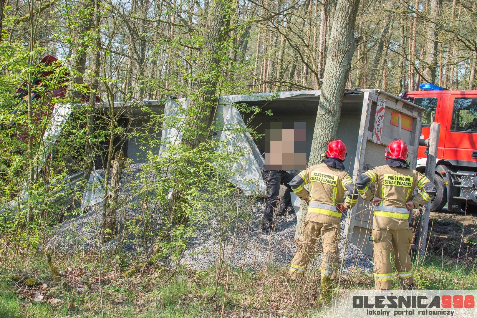 Po dotarciu na miejsce w wyniku przeprowadzonego rozpoznania ustalono, że w zdarzeniu na drodze pomiędzy miejscowościami Krzeczyn i Bystre udział biorą ciągnik siodłowy marki Scania wraz z naczepą przewożący kruszywo oraz samochód osobowy marki Citroen Berlingo. Pojazd ciężarowy po zderzeniu z osobówką wypadł z drogi a następnie przewrócił się na bok w przydrożnym rowie. Jego kierowca nie doznał żadnych obrażeń i ewakuował się z pojazdu o własnych siłach. W pojeździe osobowym poruszał się jedynie kierowca, który został poszkodowany i wskutek uszkodzenia pojazdu konieczne było wykonanie dostępu do jego wnętrza, poprzez usunięcie drzwi przy użyciu narzędzi hydraulicznych. Ranny kierowca został ewakuowany a następnie trafił pod opiekę przybyłego na miejsce ZRM, który po zaopatrzeniu na miejscu przetransportował go do szpitala celem dokładnej diagnostyki i ewentualnej hospitalizacji. Jak jednak ustaliliśmy, mężczyzna nie doznał poważnych obrażeń, które mogłyby zagrażać jego życiu.