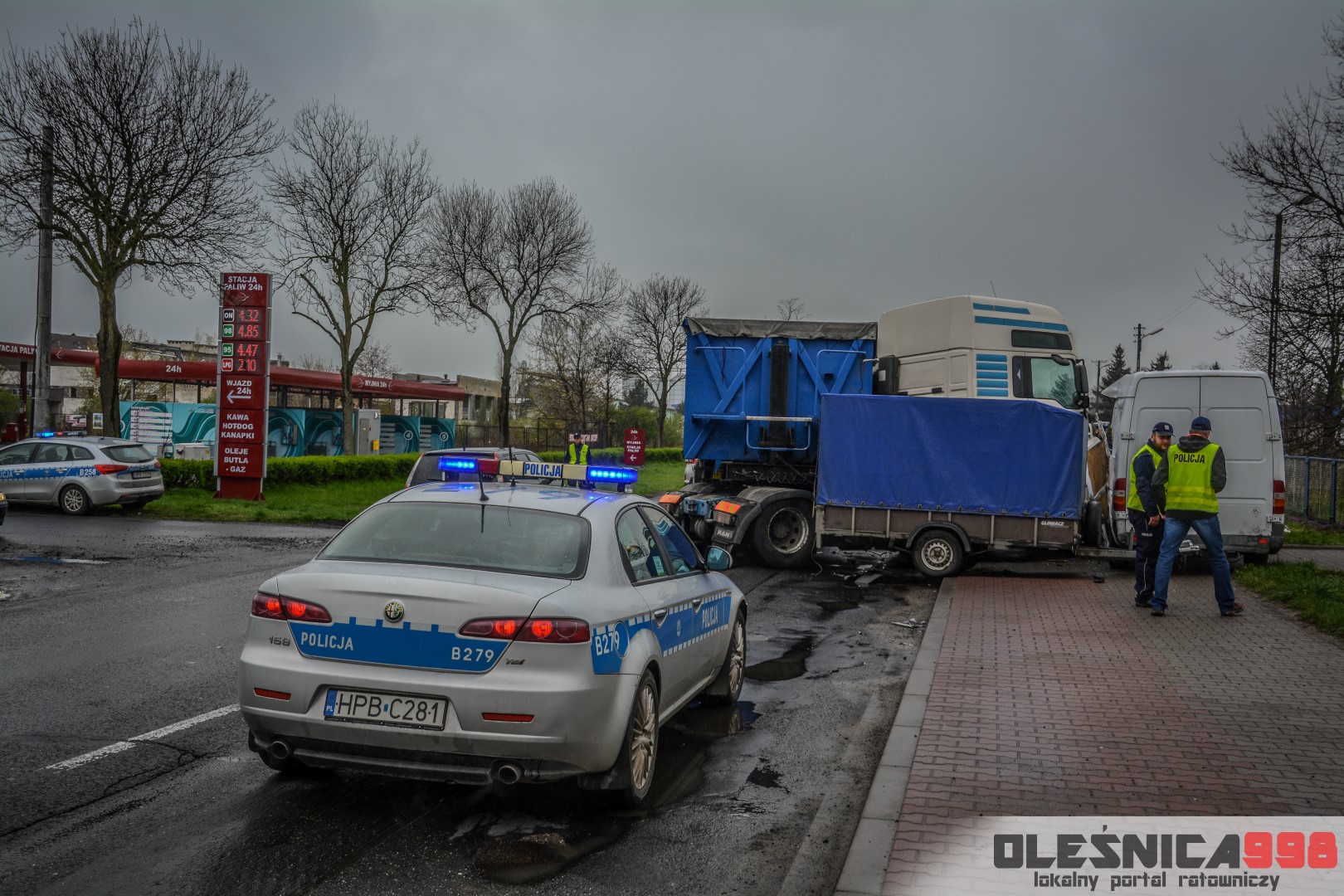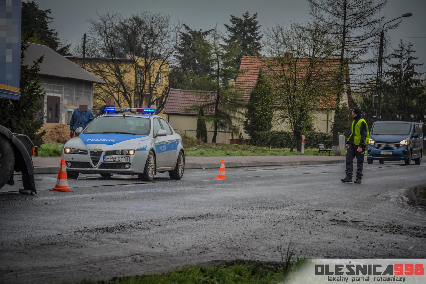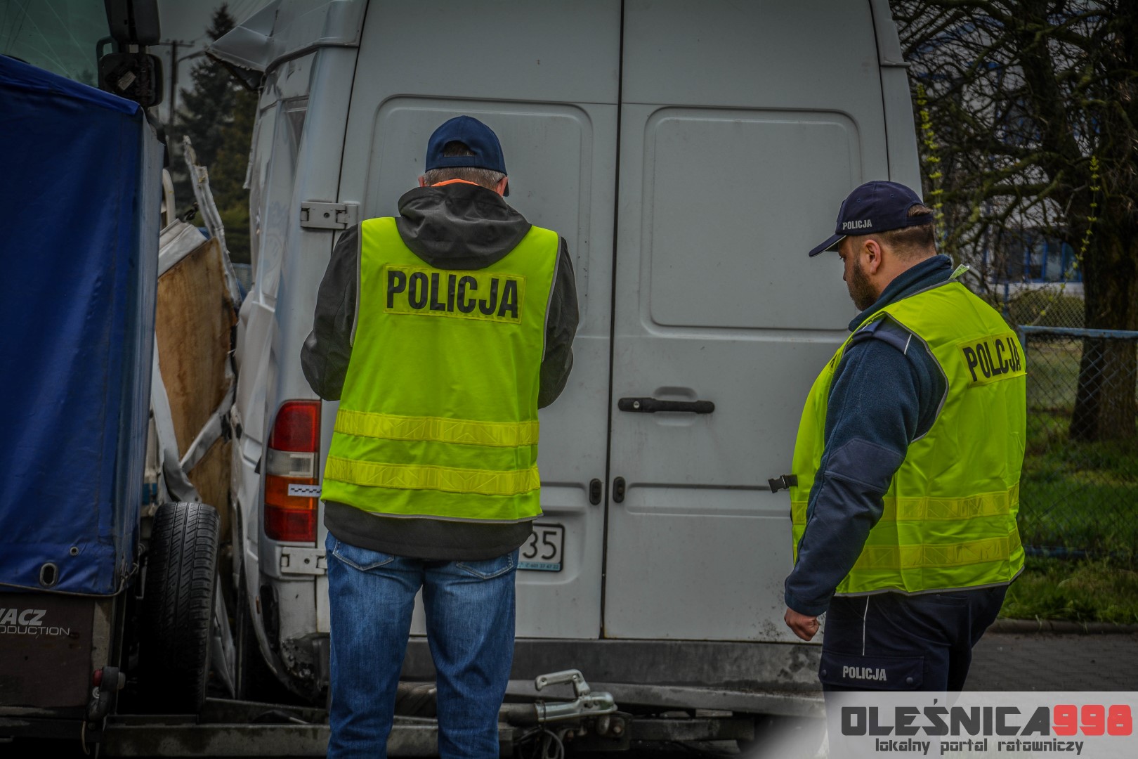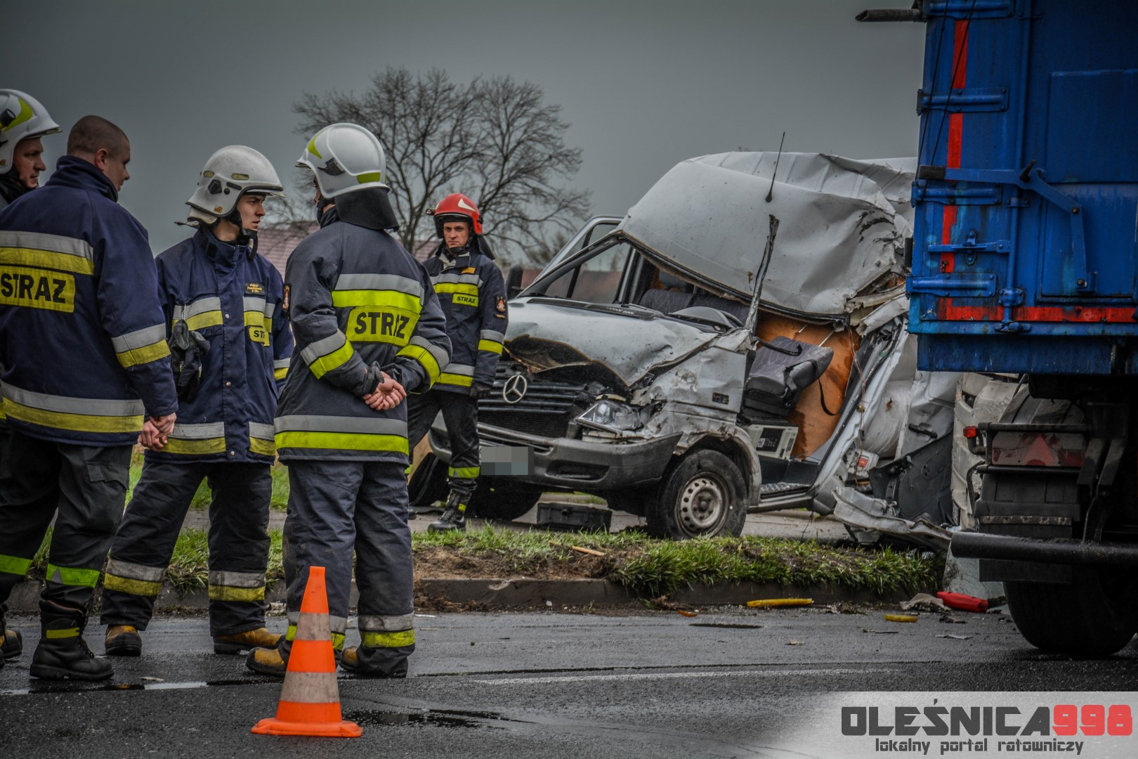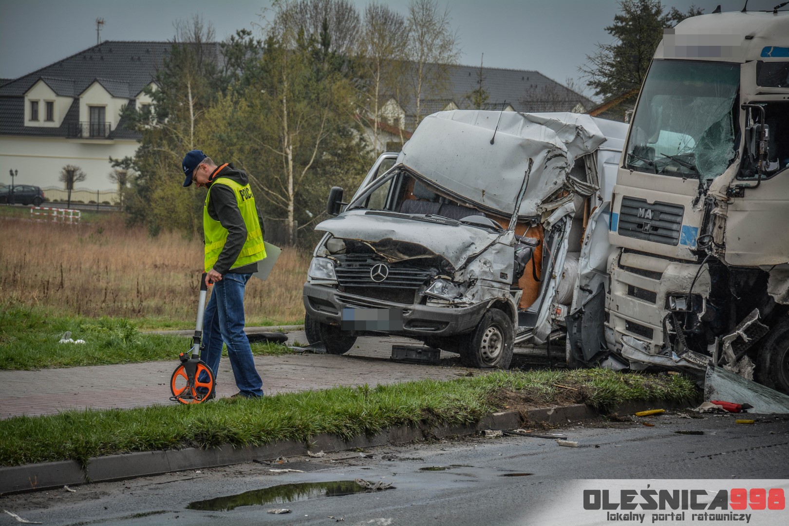 Czynności na miejscu wykonują Policjanci Wydziału Ruchu Drogowego oleśnickiej Komendy wraz z Funkcjonariuszami z Bierutowa. Obecna również była grupa dochodzeniowo – śledcza, wraz z technikiem kryminalistyki. Ze wstępnych ustaleń Mundurowych wynika, że mężczyzna kierujący Sprinterem, wyjeżdżając z drogi podporządkowanej, nie ustąpił pierwszeństwa przejazdu jadącemu od strony Oleśnicy, samochodowi ciężarowemu. Jego kierowca próbował jeszcze ratować się przed zderzeniem „uciekając” na przeciwny pas. Nie udało się jednak uniknąć zdarzenia.
