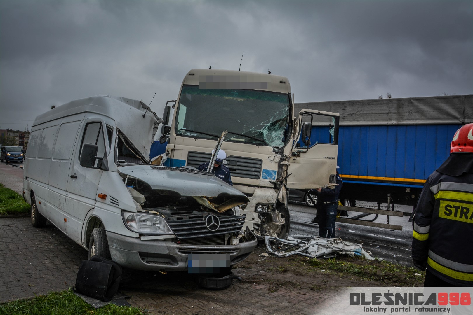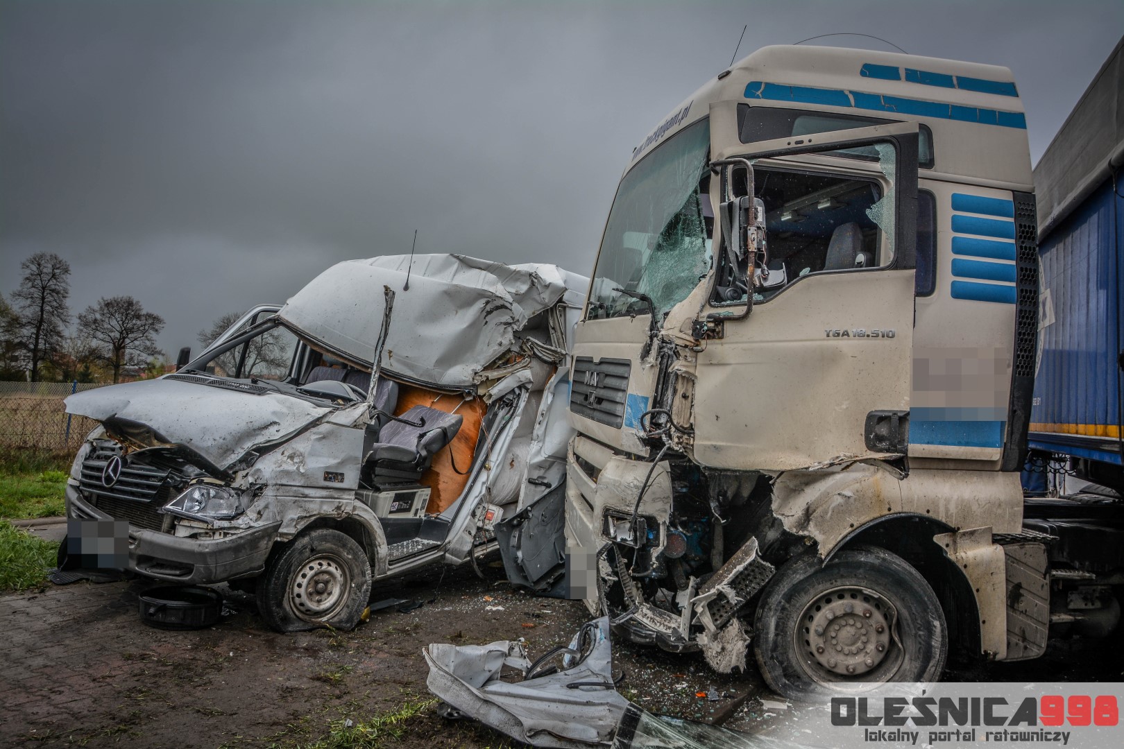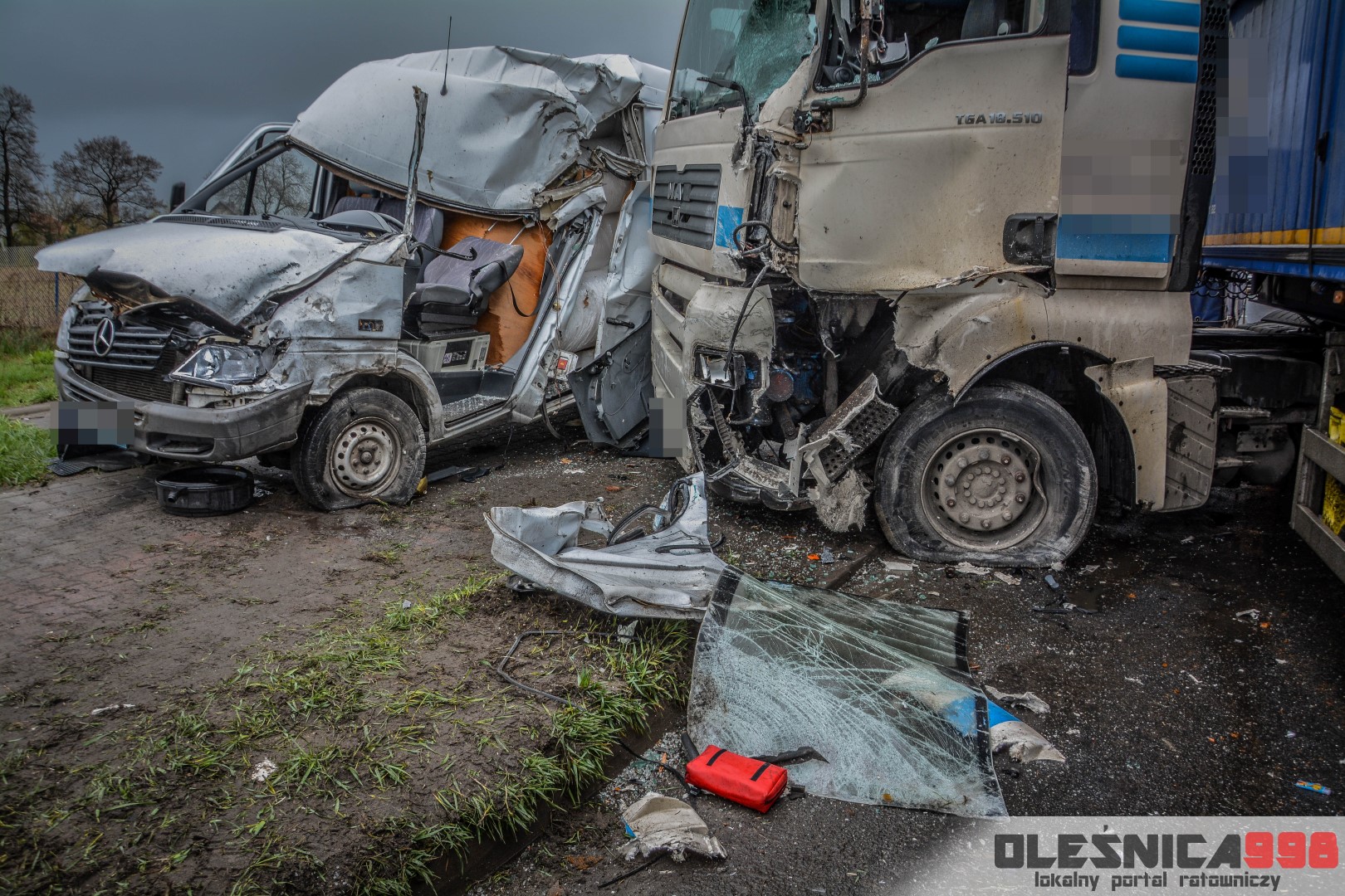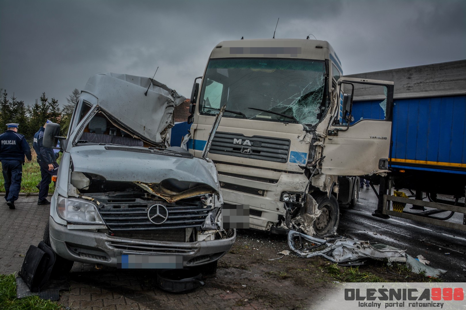 Groźny wypadek przed Bierutowem. Ciężarówka zmiażdżyła busa – FOTO, WIDEO