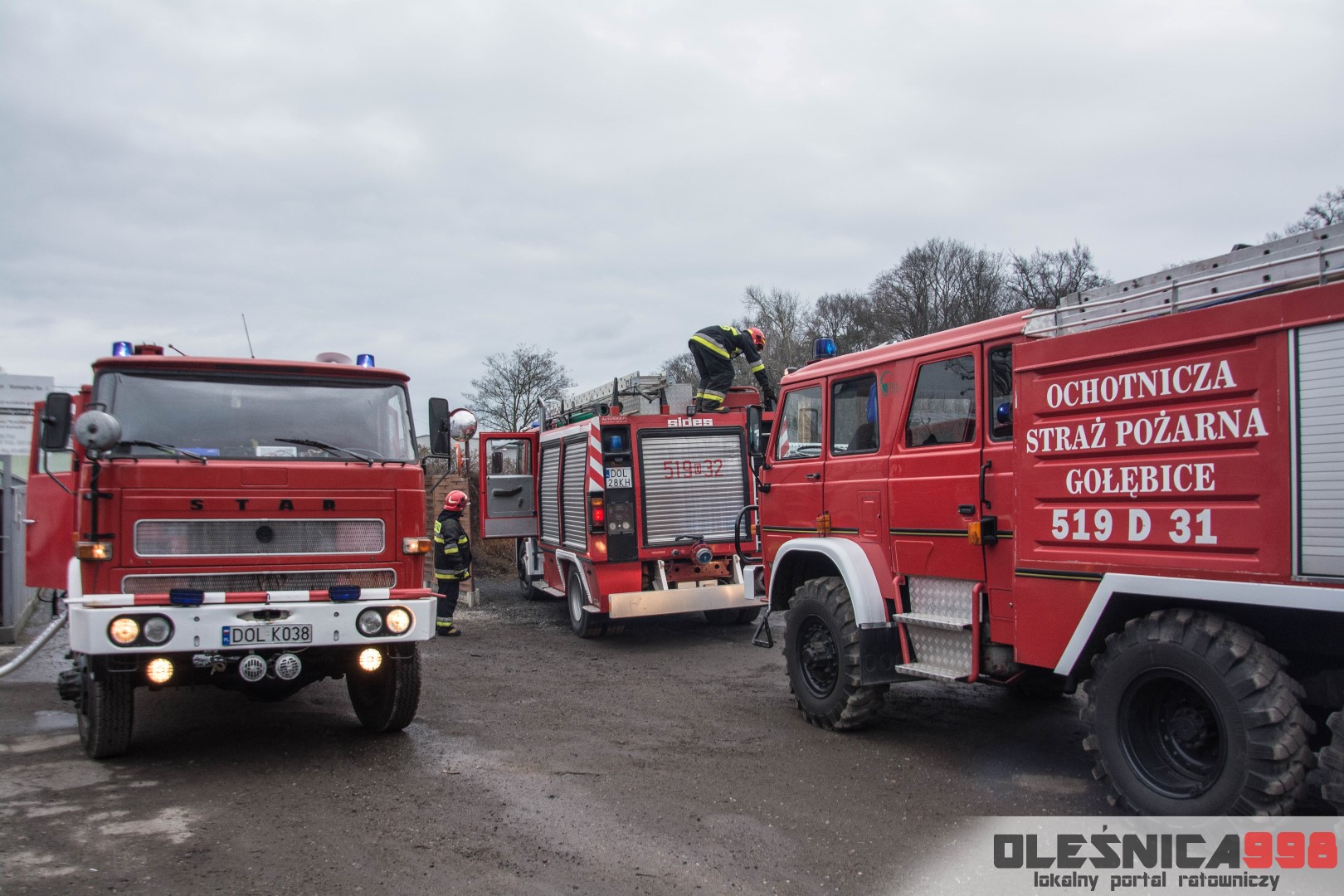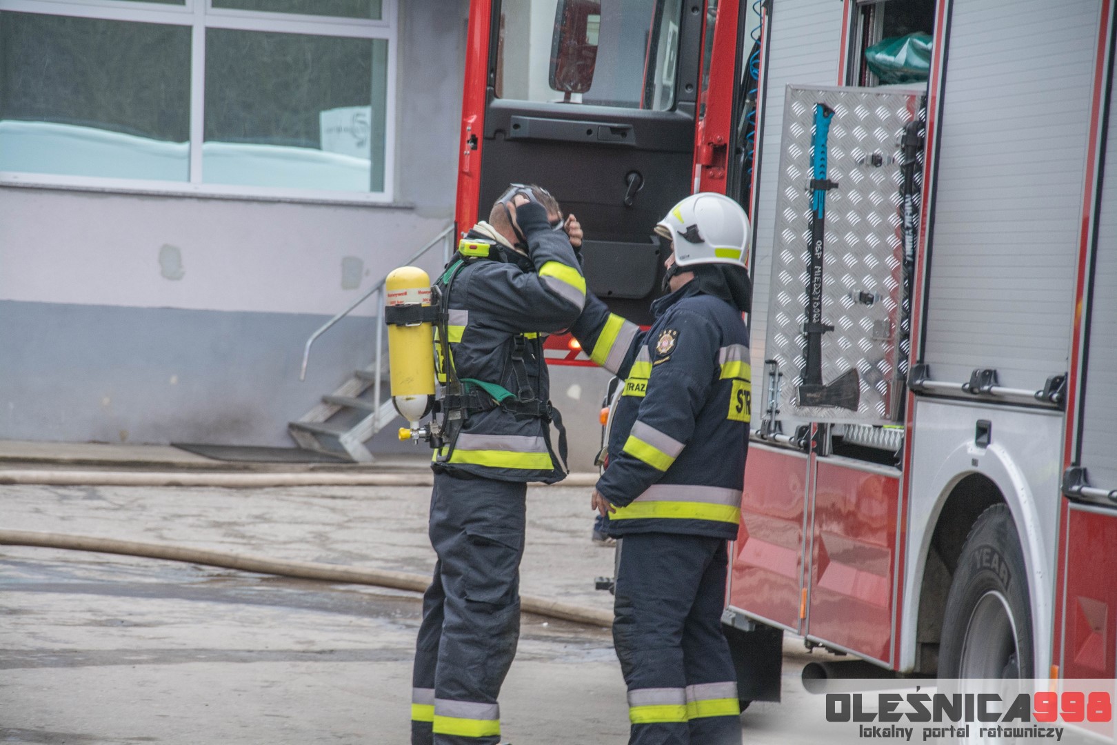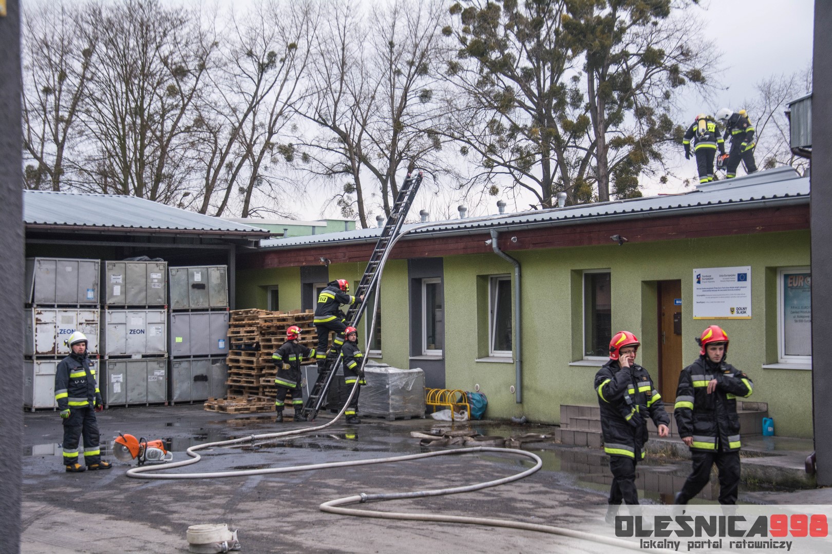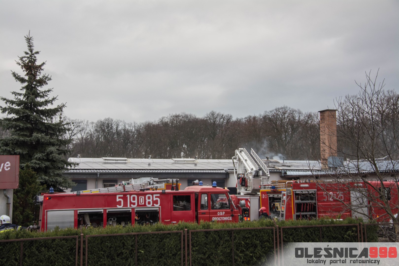 Na miejsce zadysponowane zostały siły i środki z JRG Oleśnica, OSP KSRG Międzybórz, Drołtowice oraz Gołębice, a także z OSP Syców i Stradomia Wierzchnia. W wyniku rozpoznania ustalono, że na dużej powierzchni dachu hali zajmującej się przetwórstwem wyrobów gumowych płonie papa oraz wełna w przestrzeni dachowej pod pokryciem wykonanym z blachy. Dodatkowo ogniem objęta została instalacja fotowoltaiczna.