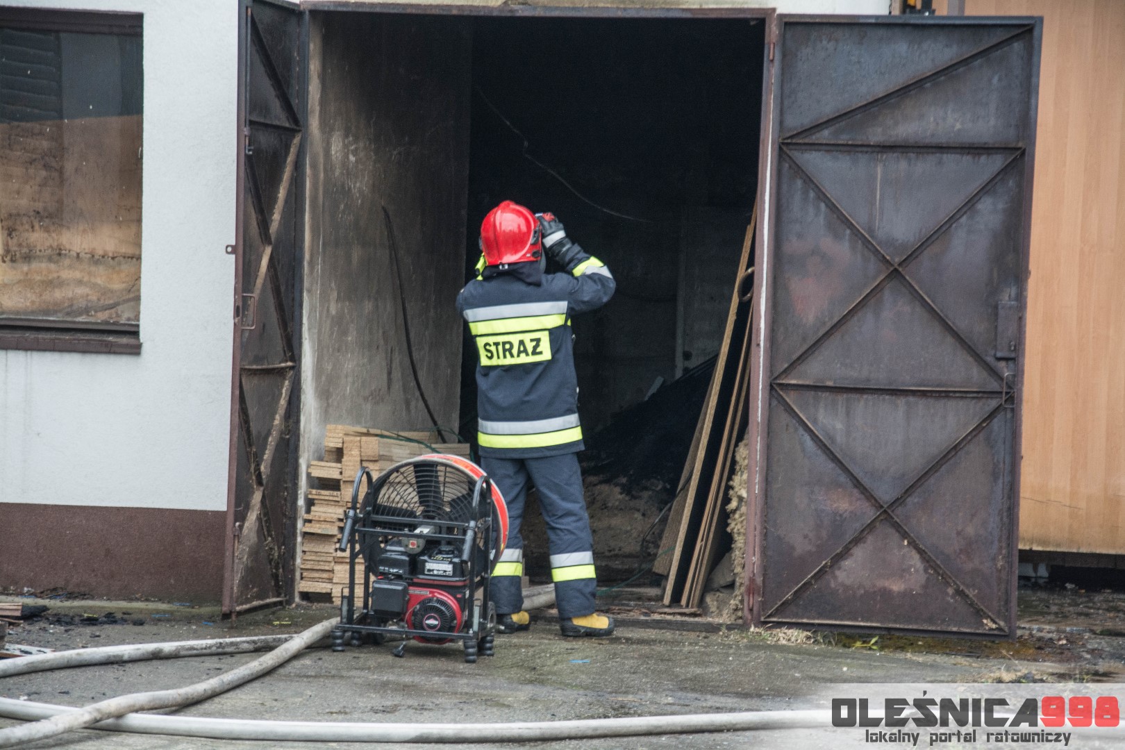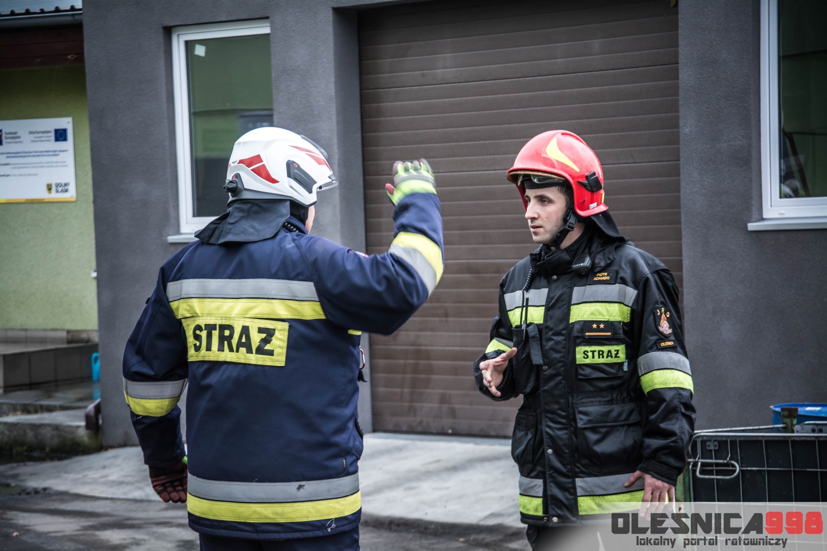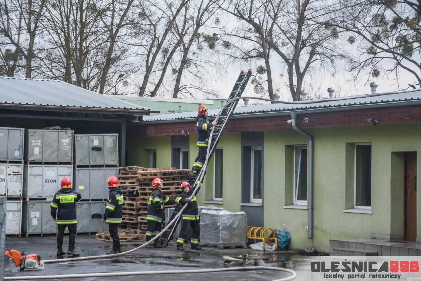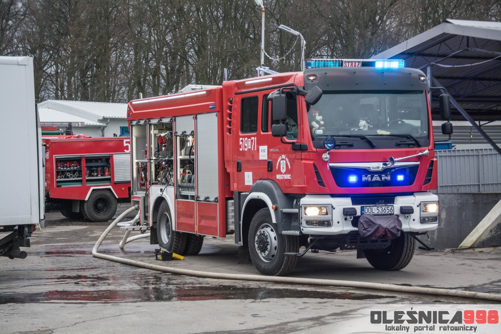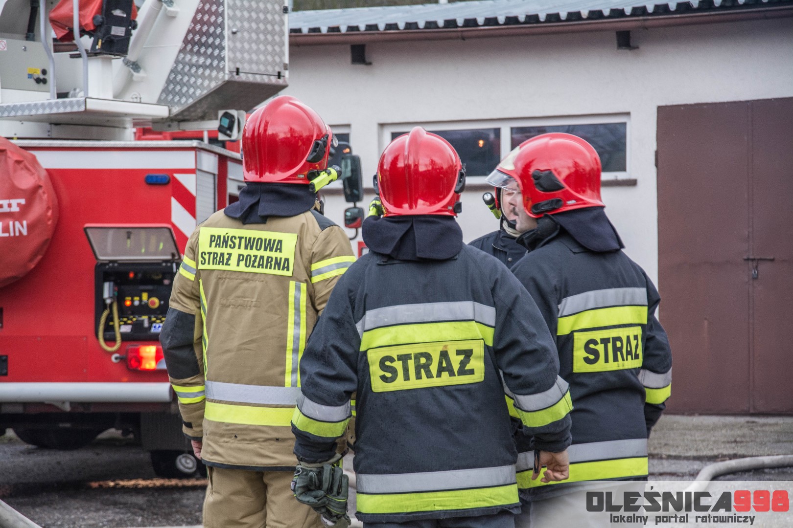 Na miejsce zadysponowane zostały siły i środki z JRG Oleśnica, OSP KSRG Międzybórz, Drołtowice oraz Gołębice, a także z OSP Syców i Stradomia Wierzchnia. W wyniku rozpoznania ustalono, że na dużej powierzchni dachu hali zajmującej się przetwórstwem wyrobów gumowych płonie papa oraz wełna w przestrzeni dachowej pod pokryciem wykonanym z blachy. Dodatkowo ogniem objęta została instalacja fotowoltaiczna.
