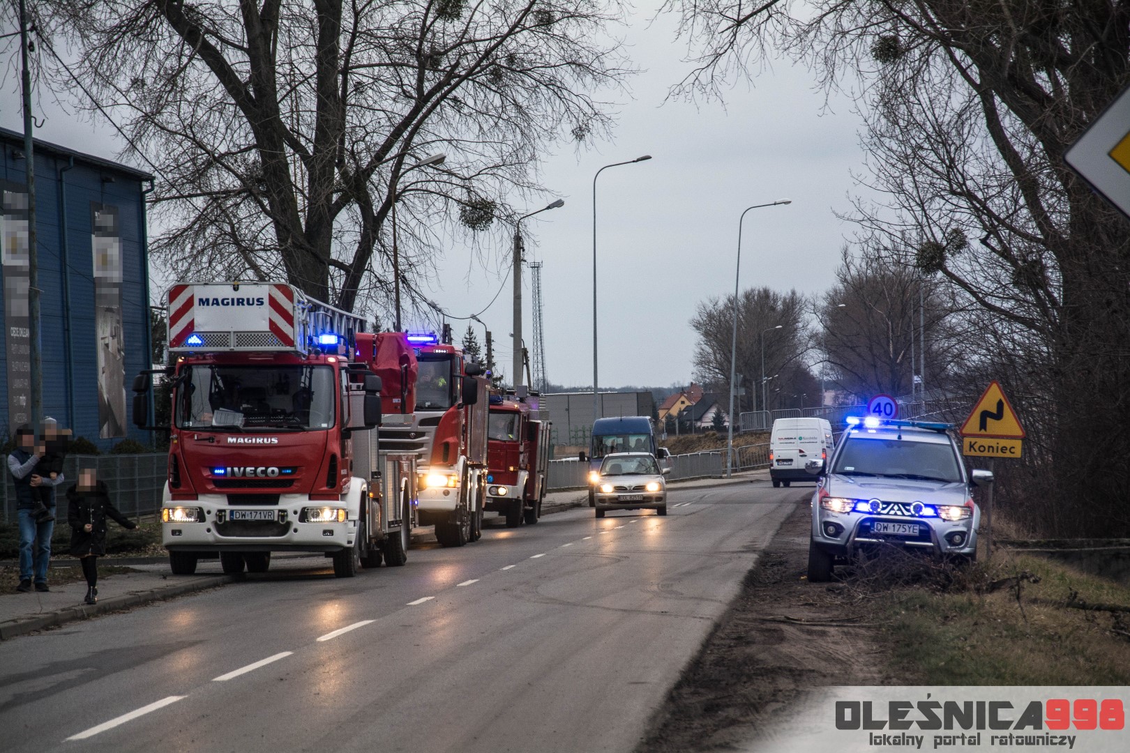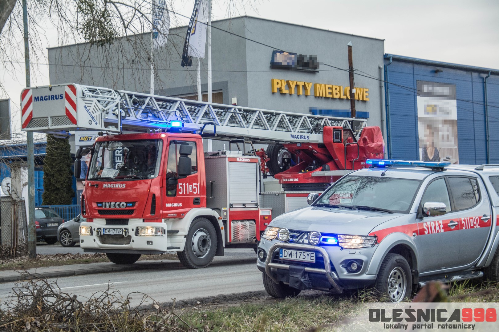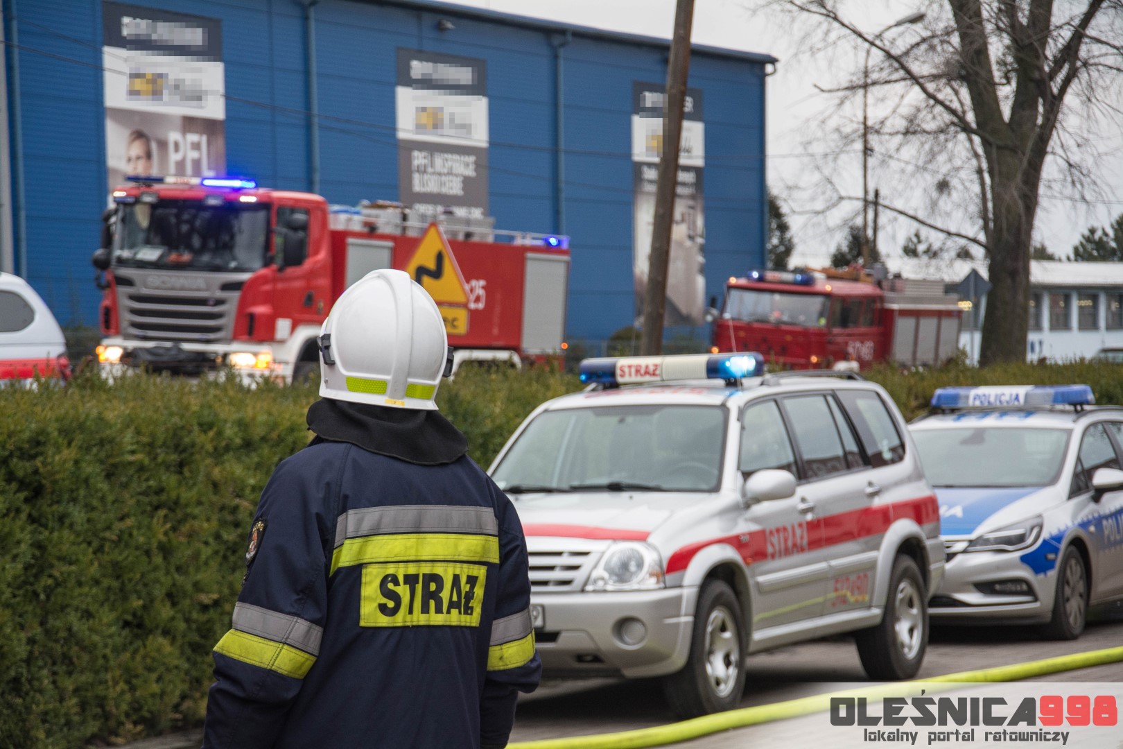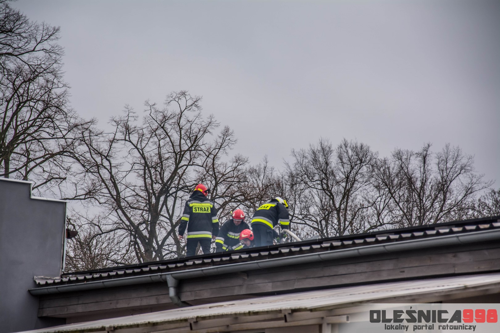 Na miejsce zadysponowane zostały siły i środki z JRG Oleśnica, OSP KSRG Międzybórz, Drołtowice oraz Gołębice, a także z OSP Syców i Stradomia Wierzchnia. W wyniku rozpoznania ustalono, że na dużej powierzchni dachu hali zajmującej się przetwórstwem wyrobów gumowych płonie papa oraz wełna w przestrzeni dachowej pod pokryciem wykonanym z blachy. Dodatkowo ogniem objęta została instalacja fotowoltaiczna.