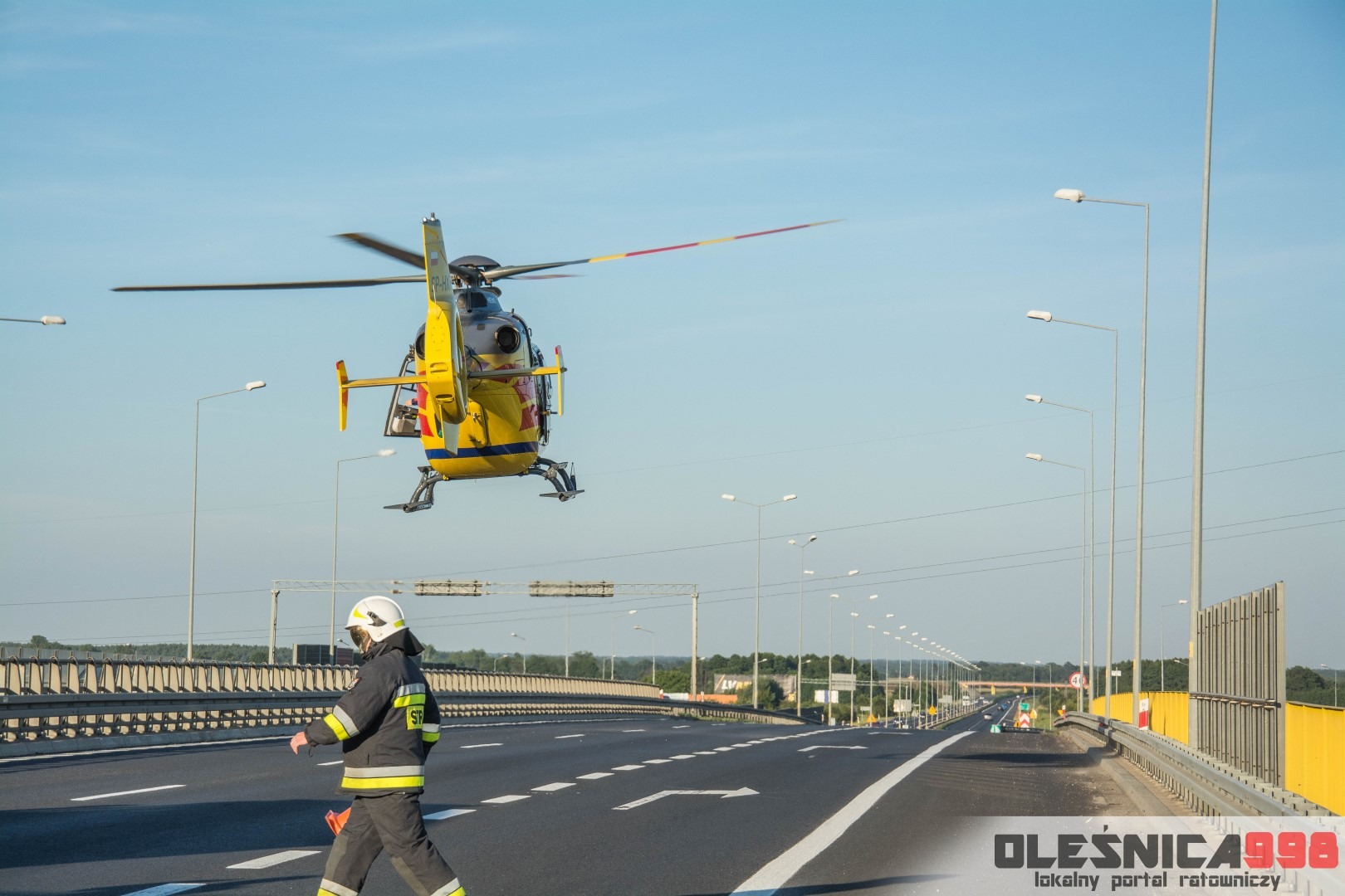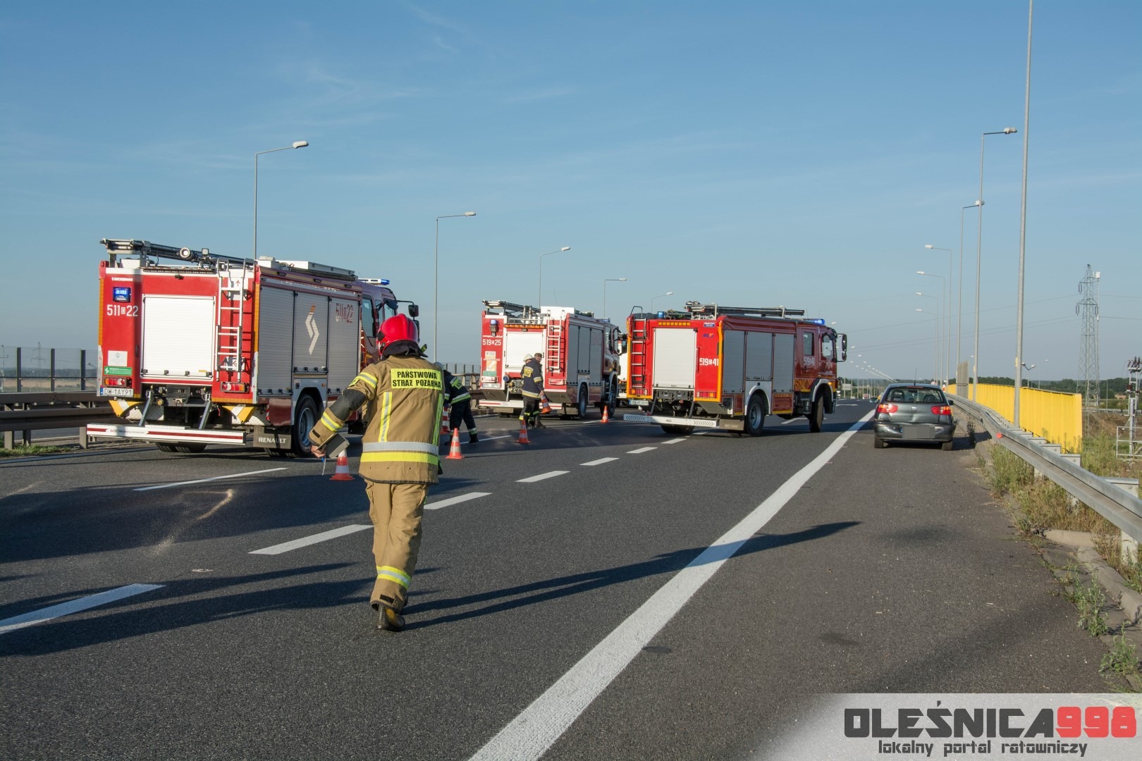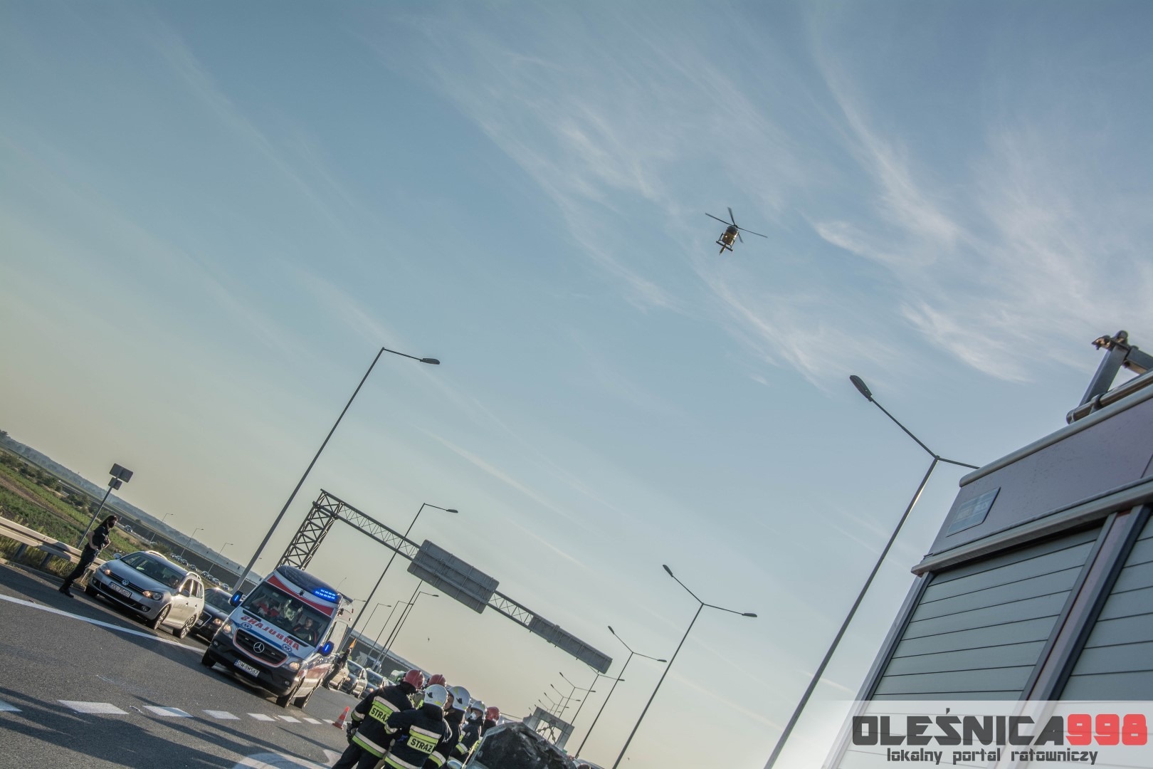 Dzisiejszego popołudnia, tuż przed godziną 18:00, Dyżurny Operacyjny Stanowiska Kierowania Komendanta Powiatowego Państwowej Straży Pożarnej w Oleśnicy odebrał zgłoszenie karambolu z udziałem 4 samochodów osobowych na węźle Oleśnica Zachód (Dąbrowa) na trasie S8 w kierunku Warszawy. Ze zgłoszenia wynikało, że po zderzeniu jeden z samochodów stanął w płomieniach. Na miejsce niezwłocznie zostały zadysponowane dwa zastępy z JRG Oleśnica, zastęp z JRG Syców, a także trzy zastępy OSP z jednostek w Dobroszycach i Ligocie Polskiej. Na miejsce skierowane zostały patrole Policji a także liczne siły i środki Państwowego Ratownictwa Medycznego – kilka zespołów naziemnych oraz śmigłowiec LPR.