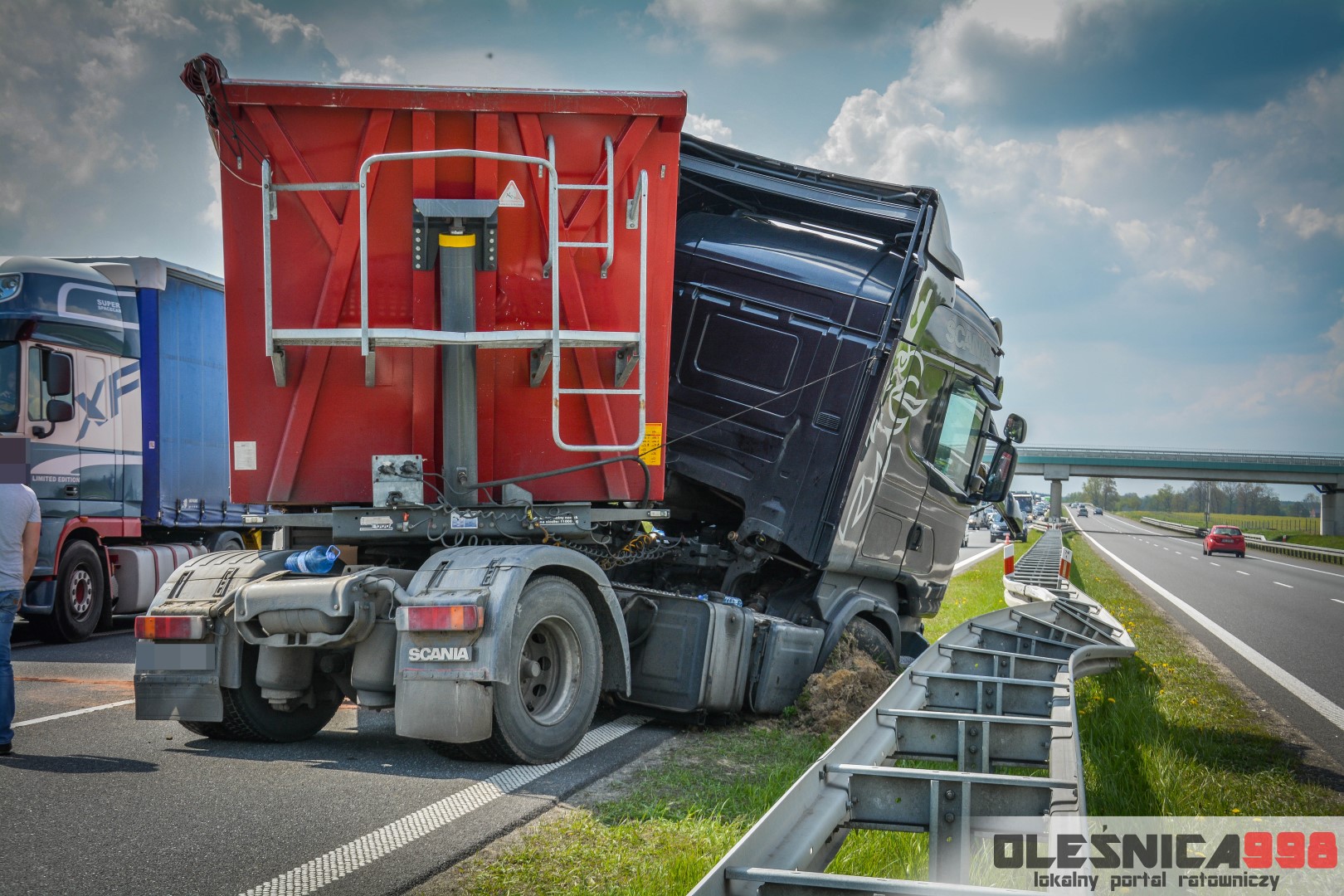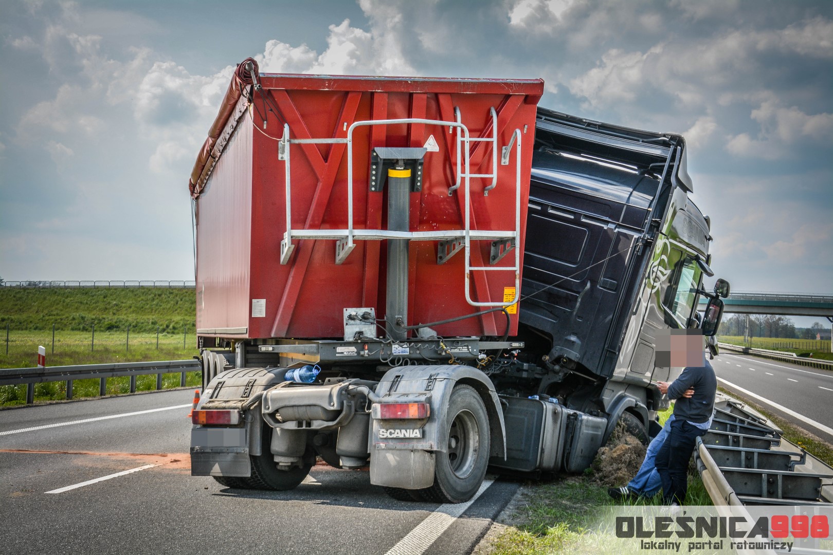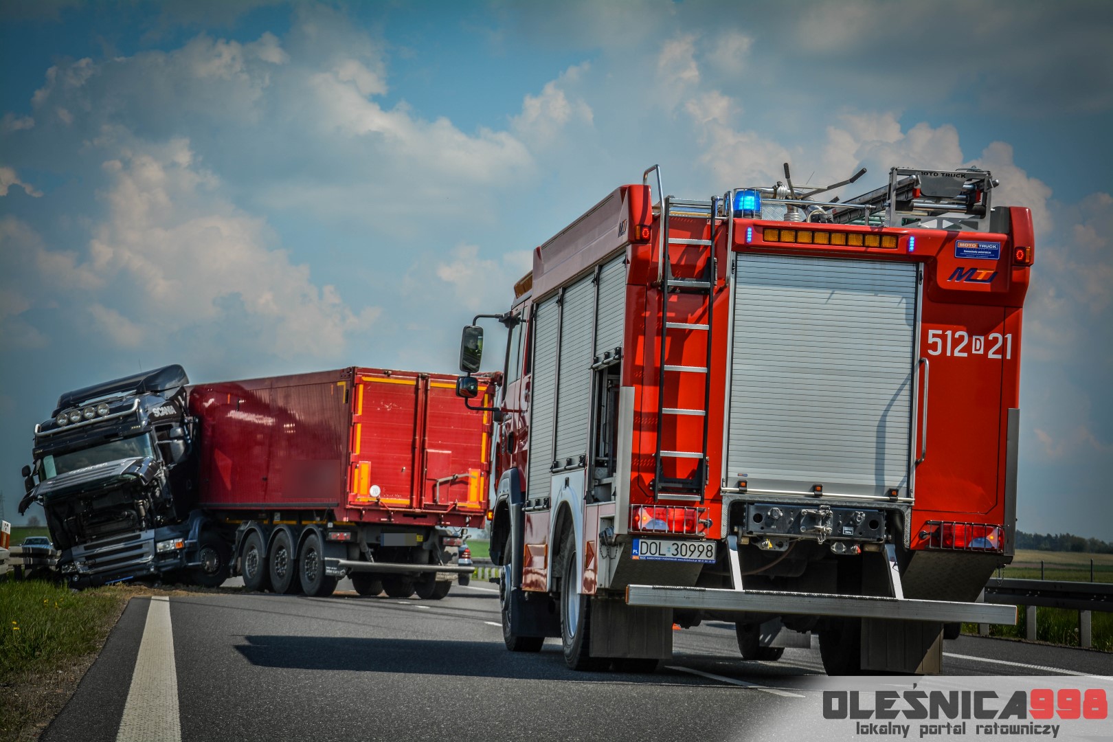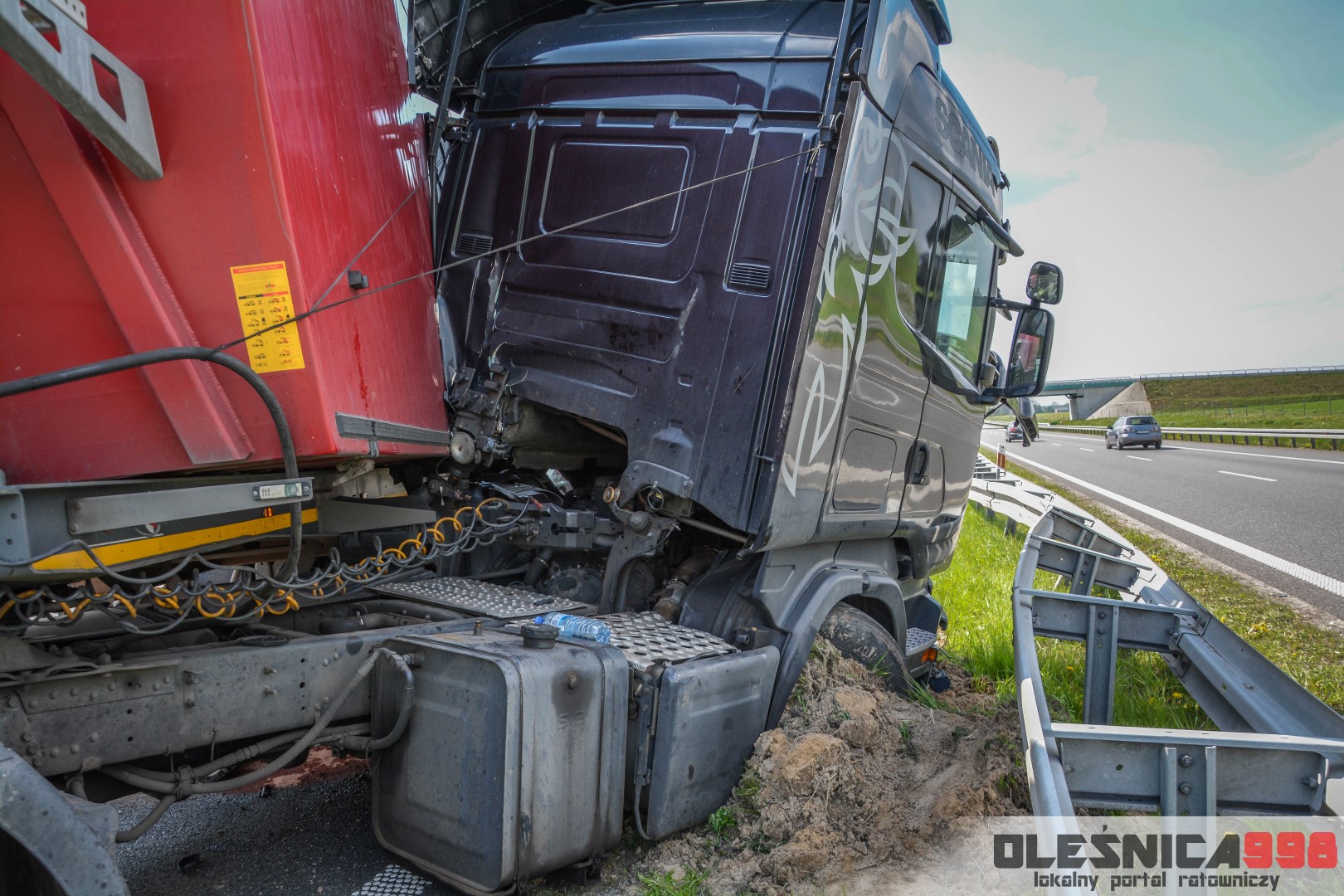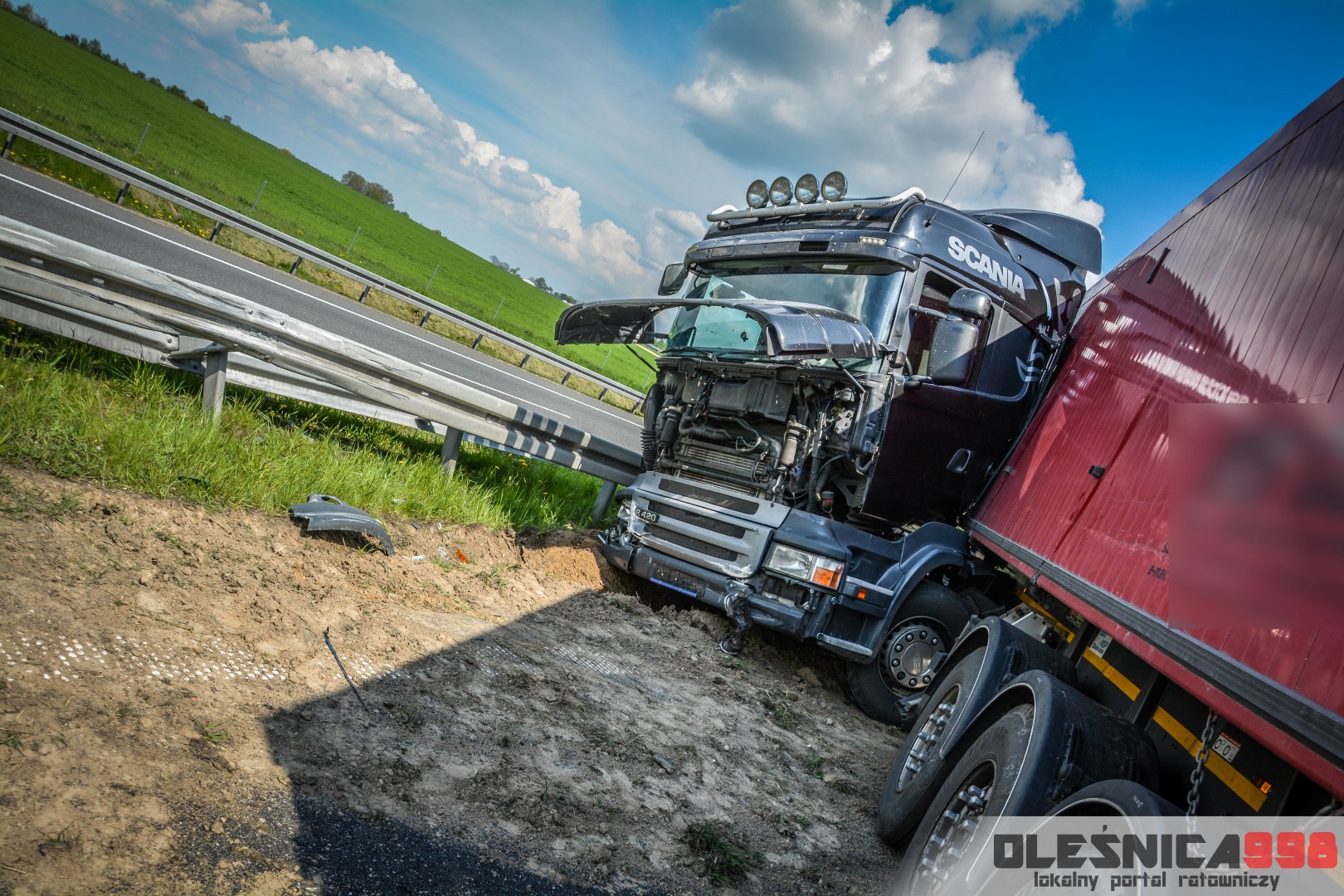 Kolejne zdarzenie z udziałem ciężarówki na S8. TIR „złamał się” i uderzył w bariery tuż przed węzłem Syców Zachód