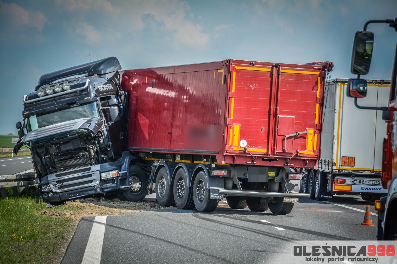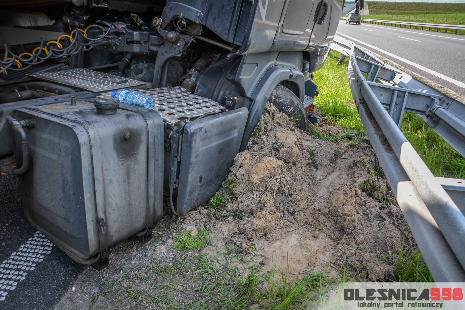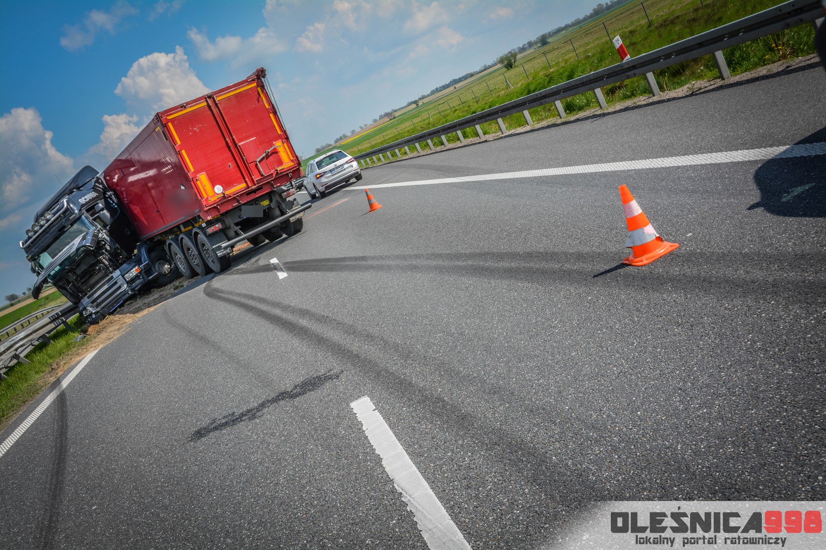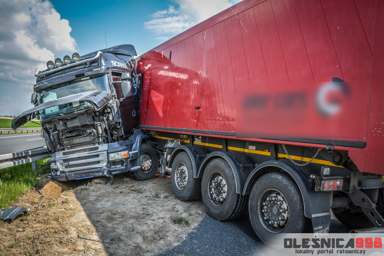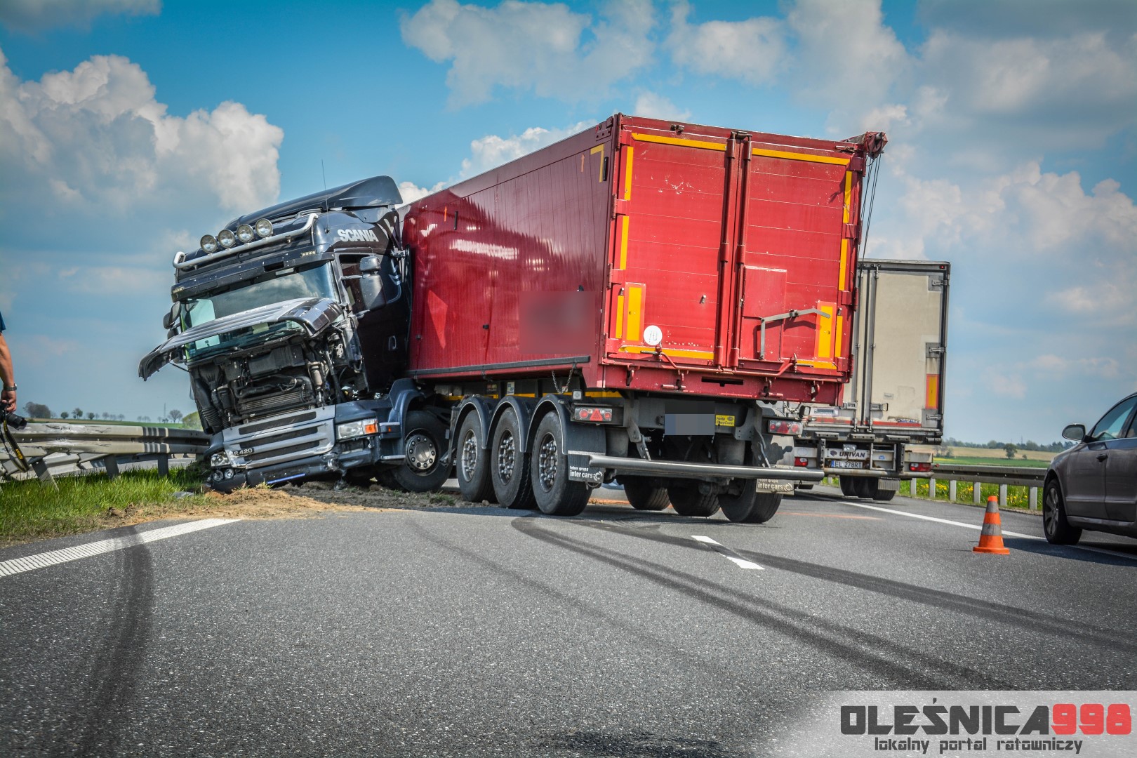 Kolejne zdarzenie z udziałem ciężarówki na S8. TIR „złamał się” i uderzył w bariery tuż przed węzłem Syców Zachód