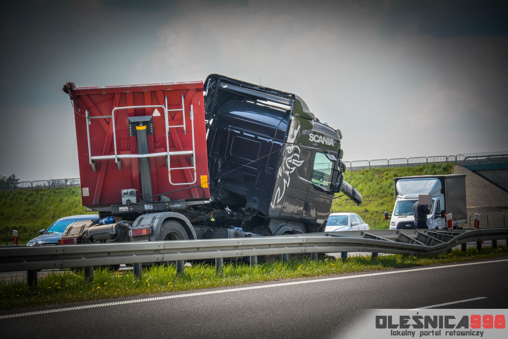 Dzisiaj, w godzinach popołudniowych, na 74 kilometrze trasy S8, doszło do nietypowego zdarzenia. Samochód ciężarowy z naczepą „złamał się” a następnie wpadł na bariery energochłonne oddzielające pasy ruchu. Na miejscu interweniowały zastępy Straży Pożarnej z Sycowa, Policjanci Wydziału Ruchu Drogowego oraz służby drogowe.