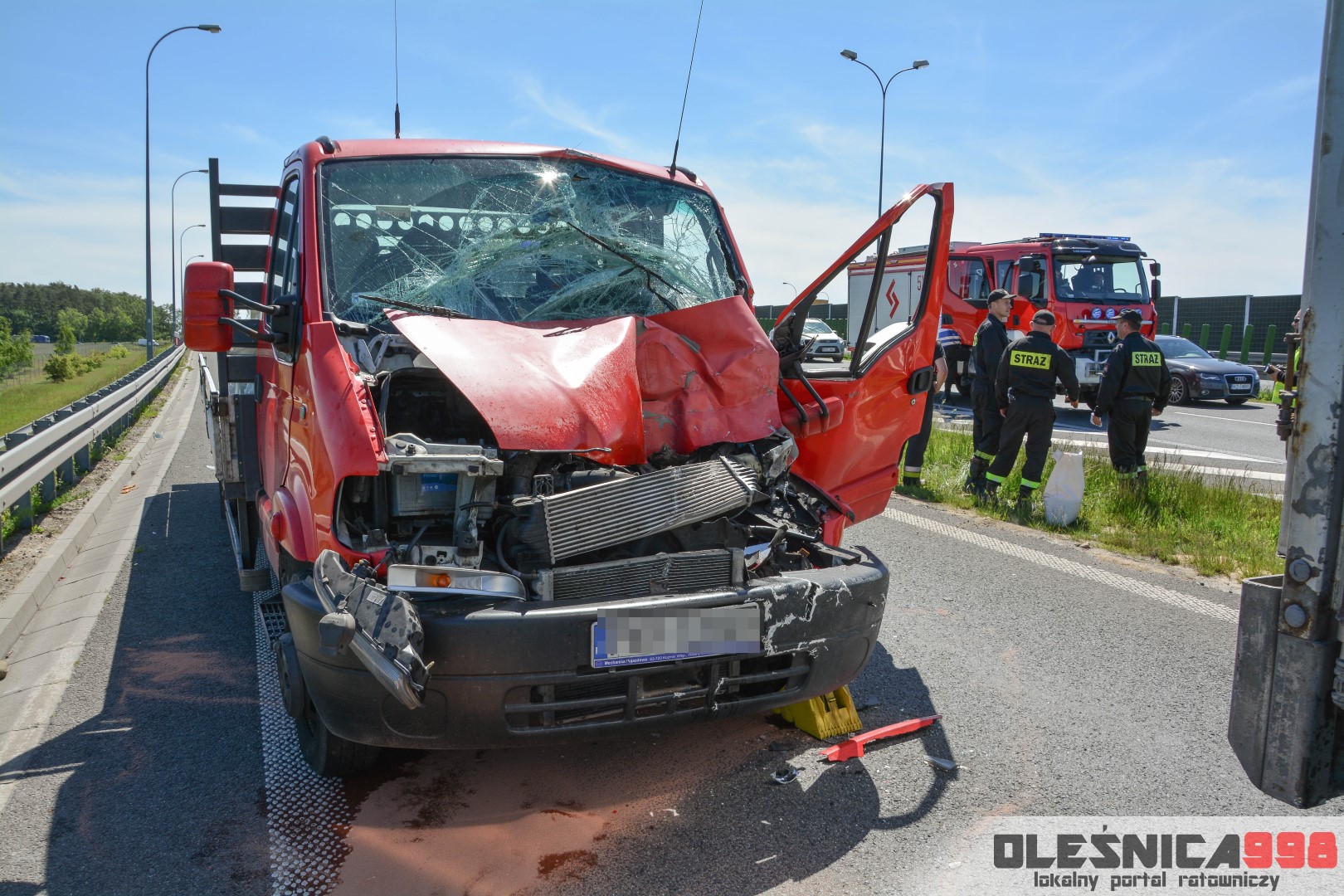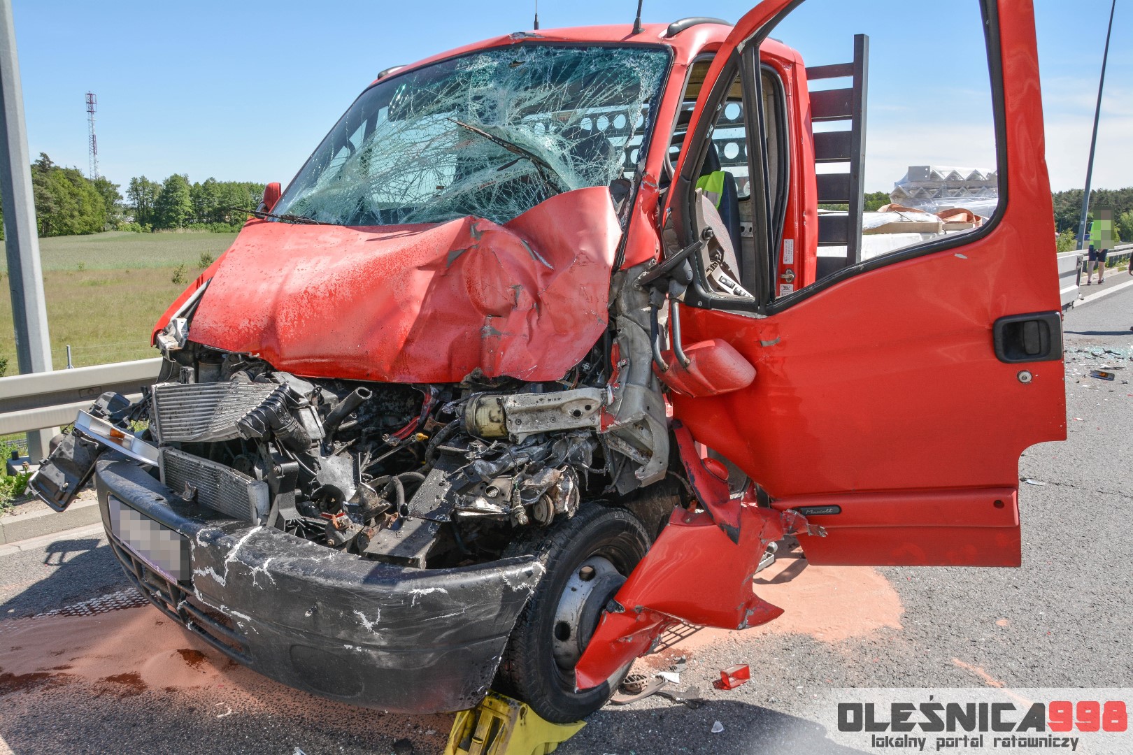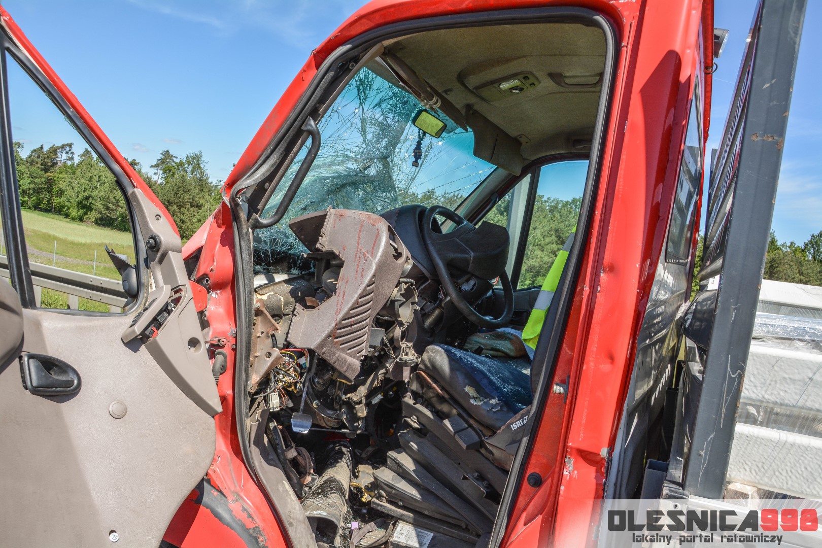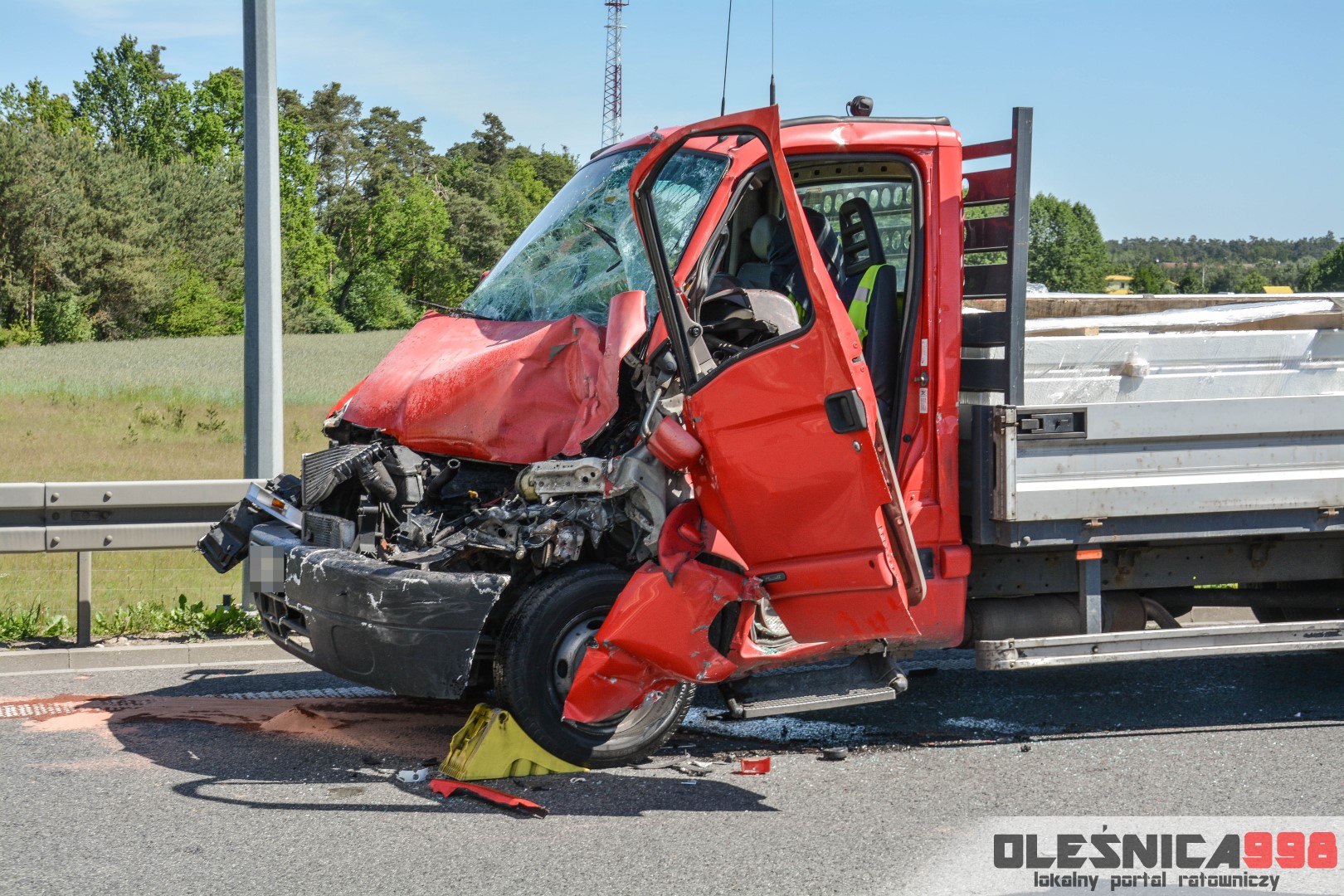 Po godzinie 10:30 na trasie S8 doszło do kolejnego poważnego w skutkach zdarzenia drogowego. Tym razem na samym węźle Oleśnica Północ zderzyły się ciężarowe Volvo oraz dostawcze Renault, którego kierowca został ciężko ranny. Po otrzymaniu informacji o zdarzeniu, Dyżurny Stanowiska Kierowania przedysponował na miejsce dwa zastępy JRG Oleśnica działające przy poprzednim zdarzeniu, do którego doszło kilometr dalej a także ponownie zadysponował samochód ratownictwa technicznego z JRG Syców. Informację o konieczności interwencji przekazano również do wrocławskiej filii Lotniczego Pogotowia Ratunkowego. Na miejsce skierowano także patrol Policjantów Wydziału Ruchu Drogowego.
