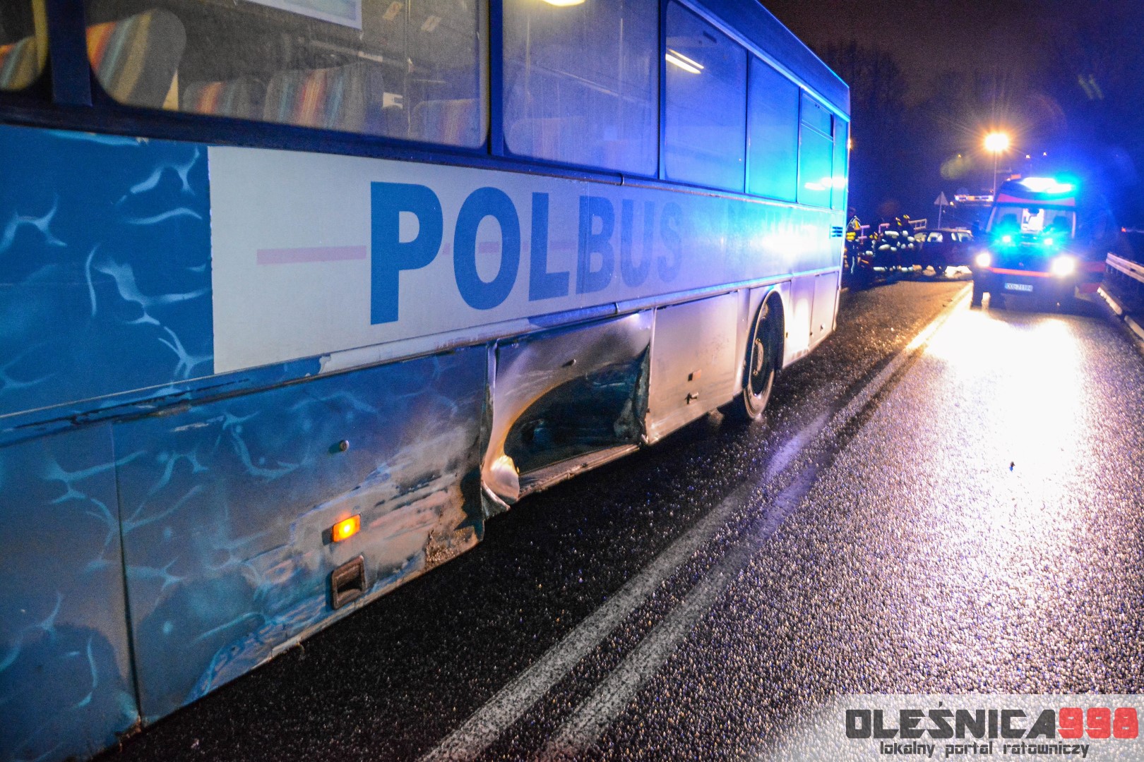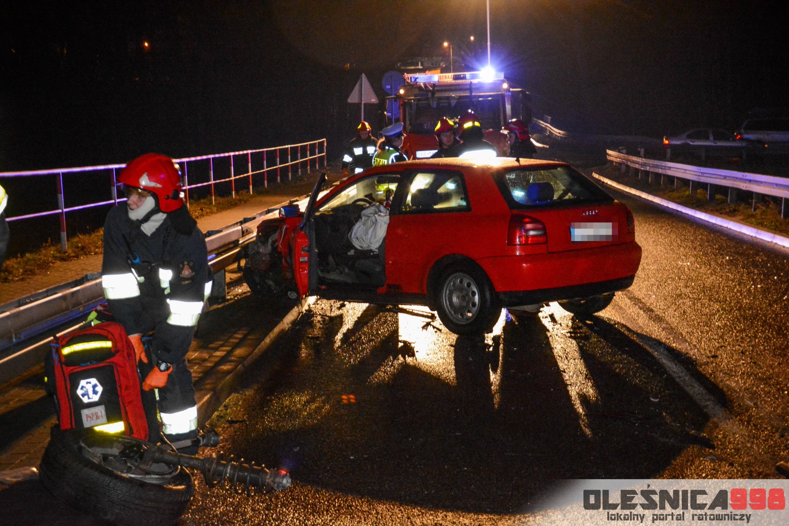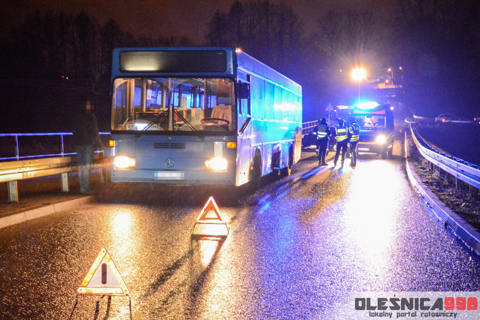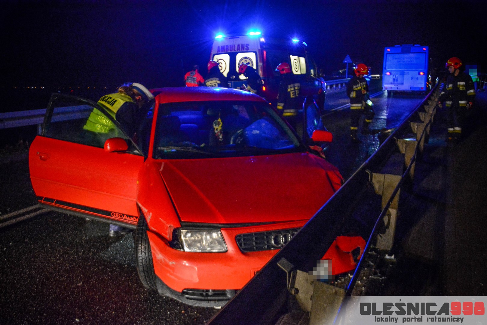 Pracujący na miejscu Mundurowi wstępnie ustalili, iż około 35-letni mężczyzna poruszając się pojazdem marki Audi A3 w kierunku Oleśnicy, na łuku wiaduktu najprawdopodobniej stracił panowanie nad pojazdem a następnie uderzył w bok jadącego z naprzeciwka autobusu. Jak wynika z naszych informacji, sprawca zdarzenia- kierujący osobówką, był nietrzeźwy a także nie posiadał uprawnień do prowadzenia pojazdów mechanicznych. Po udzieleniu pomocy przez ekipę Pogotowia trafił do oleśnickiego szpitala.