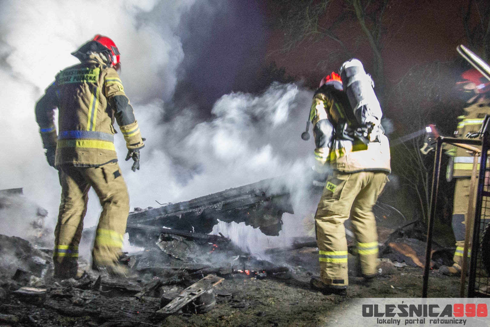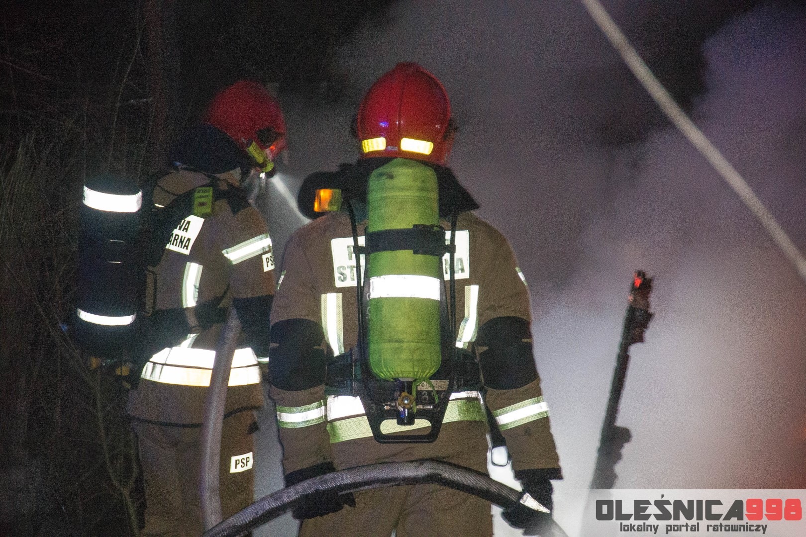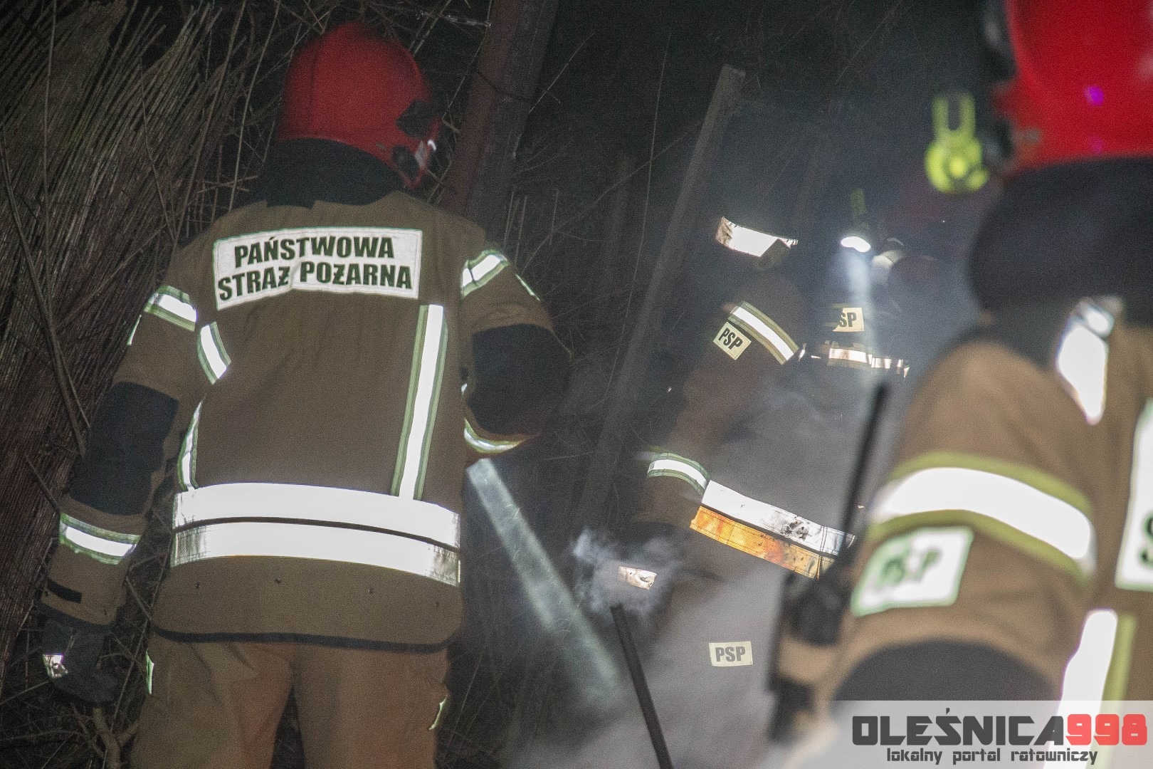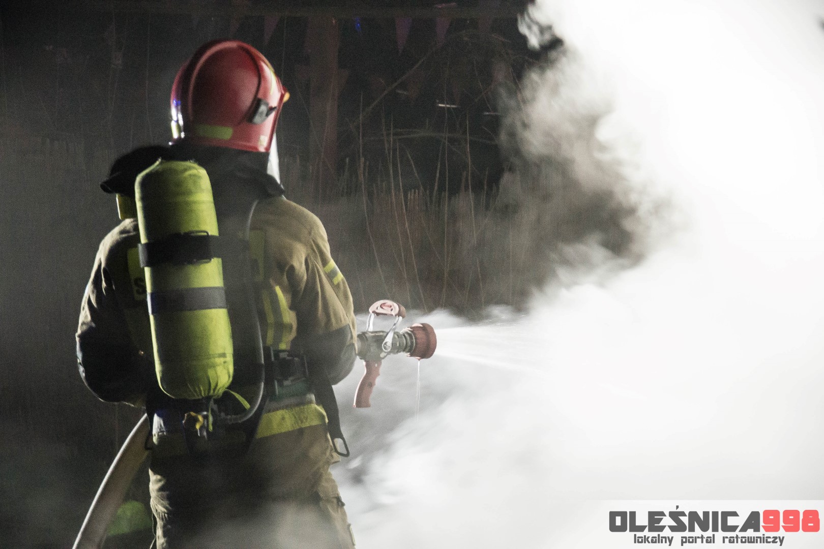 Po około 30 minutach pożar został zlokalizowany i przystąpiono do jego dogaszania wraz z równoległym przeszukiwaniem pogorzeliska pod kątem obecności osób poszkodowanych. Szczęśliwie, wewnątrz nie ujawniono nikogo. Altana jednak spłonęła doszczętnie. Dogaszanie pożaru trwało do późnych godzin nocnych. Zastępy po zatankowaniu środka gaśniczego do koszar powróciły około godziny 4:00. Obecni na miejscu Funkcjonariusze oleśnickiej Policji wykonywali czynności w kierunku ustalenia właściciela terenu oraz przyczyn i okoliczności zdarzenia.