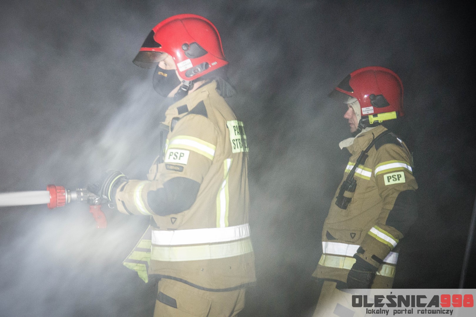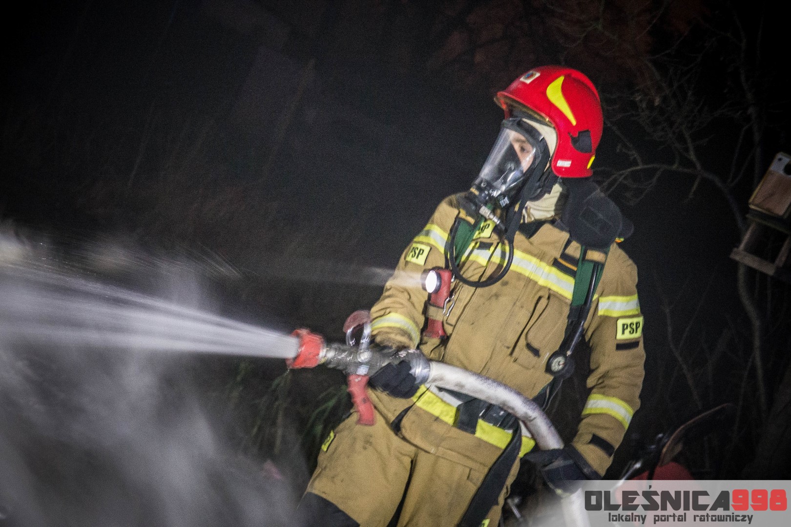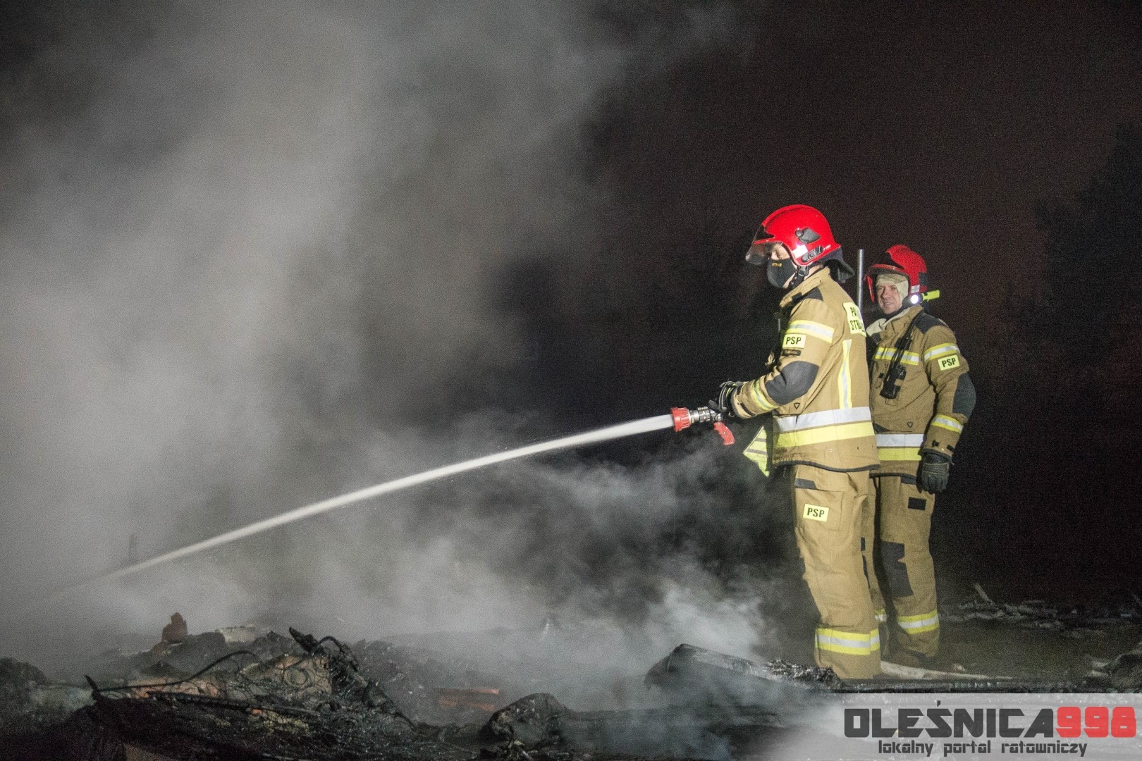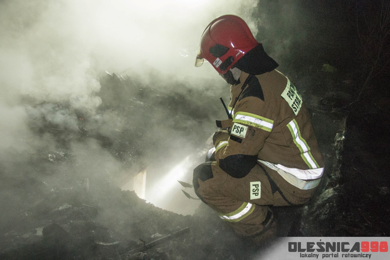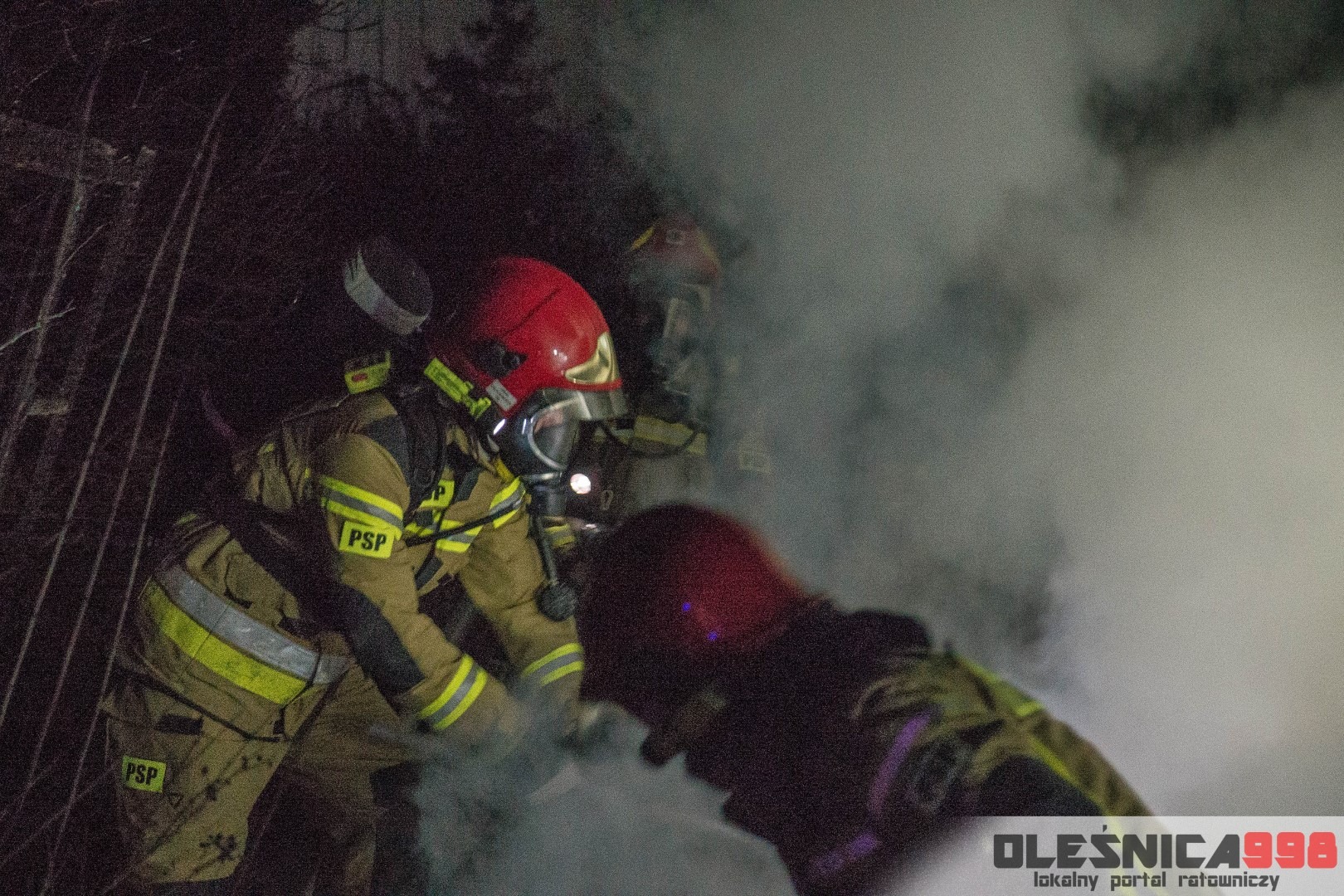 Po około 30 minutach pożar został zlokalizowany i przystąpiono do jego dogaszania wraz z równoległym przeszukiwaniem pogorzeliska pod kątem obecności osób poszkodowanych. Szczęśliwie, wewnątrz nie ujawniono nikogo. Altana jednak spłonęła doszczętnie. Dogaszanie pożaru trwało do późnych godzin nocnych. Zastępy po zatankowaniu środka gaśniczego do koszar powróciły około godziny 4:00. Obecni na miejscu Funkcjonariusze oleśnickiej Policji wykonywali czynności w kierunku ustalenia właściciela terenu oraz przyczyn i okoliczności zdarzenia.