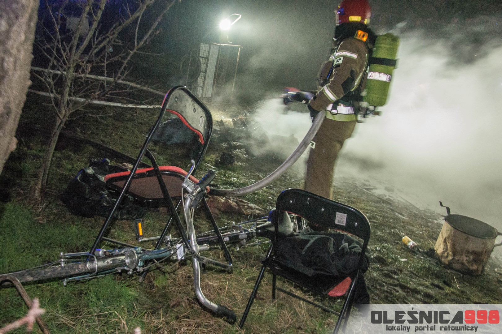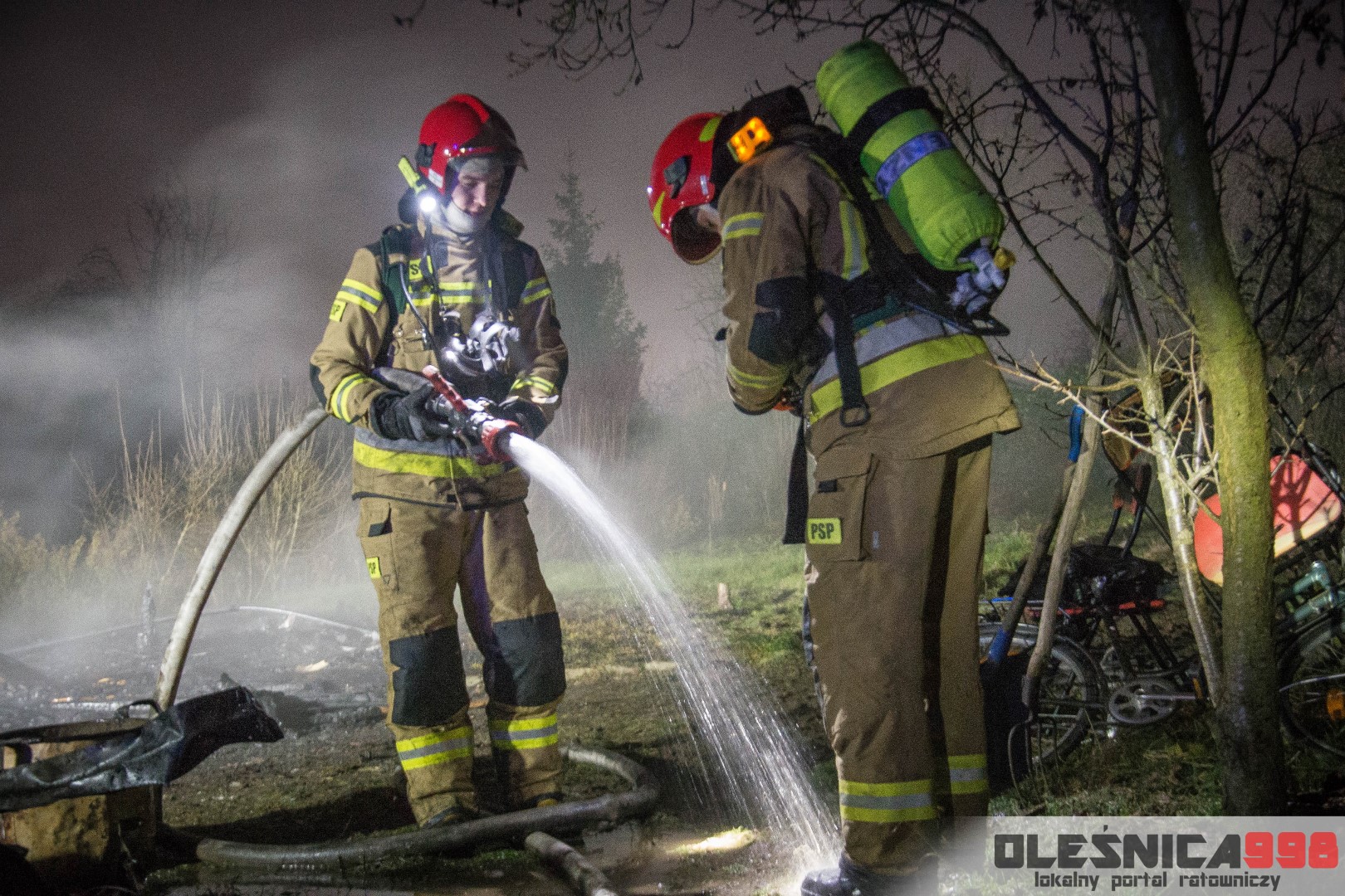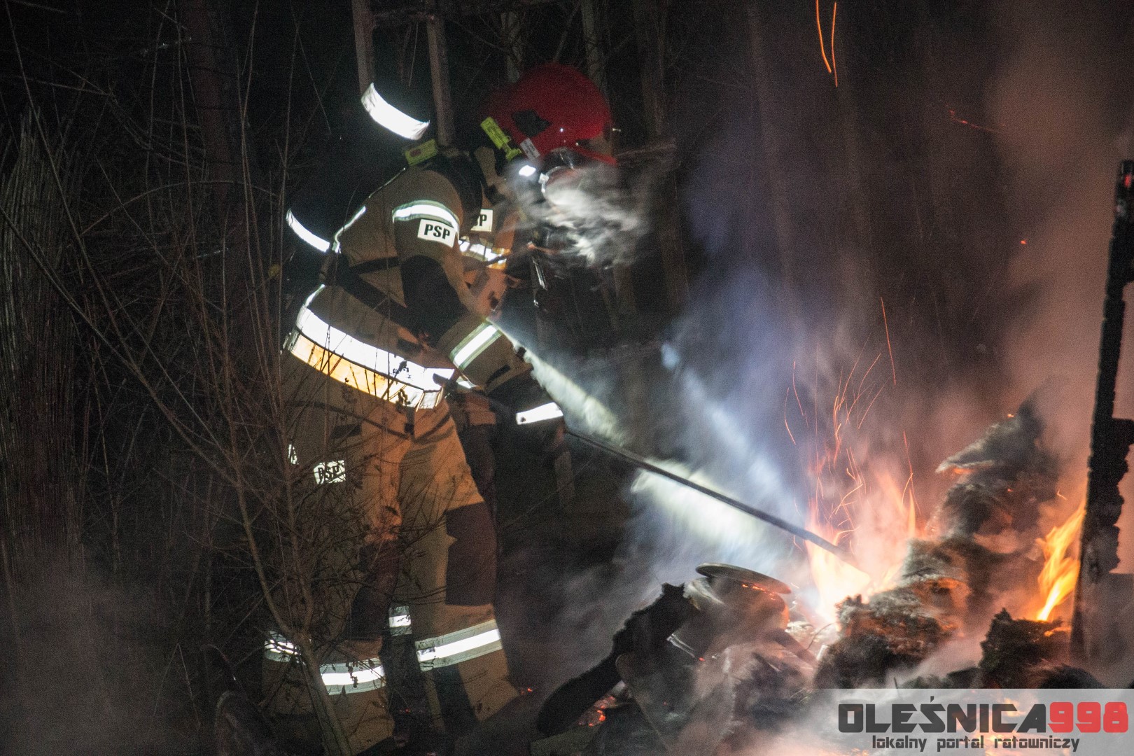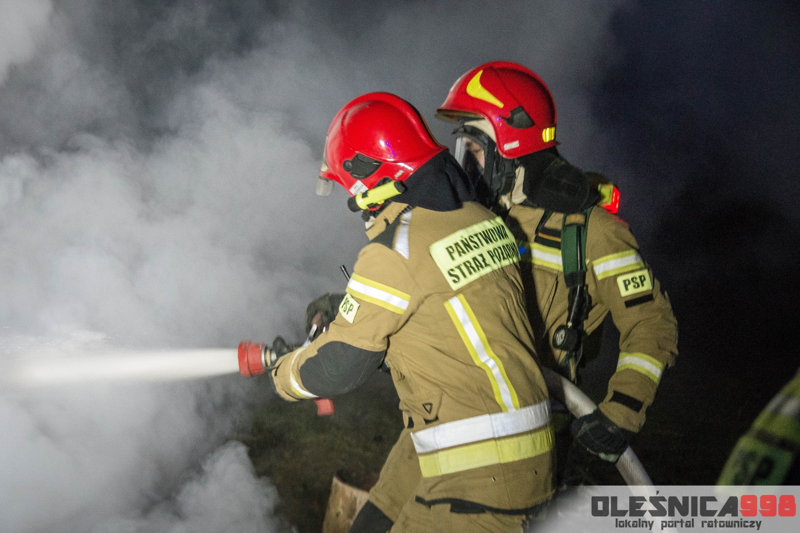 Po około 30 minutach pożar został zlokalizowany i przystąpiono do jego dogaszania wraz z równoległym przeszukiwaniem pogorzeliska pod kątem obecności osób poszkodowanych. Szczęśliwie, wewnątrz nie ujawniono nikogo. Altana jednak spłonęła doszczętnie. Dogaszanie pożaru trwało do późnych godzin nocnych. Zastępy po zatankowaniu środka gaśniczego do koszar powróciły około godziny 4:00. Obecni na miejscu Funkcjonariusze oleśnickiej Policji wykonywali czynności w kierunku ustalenia właściciela terenu oraz przyczyn i okoliczności zdarzenia.