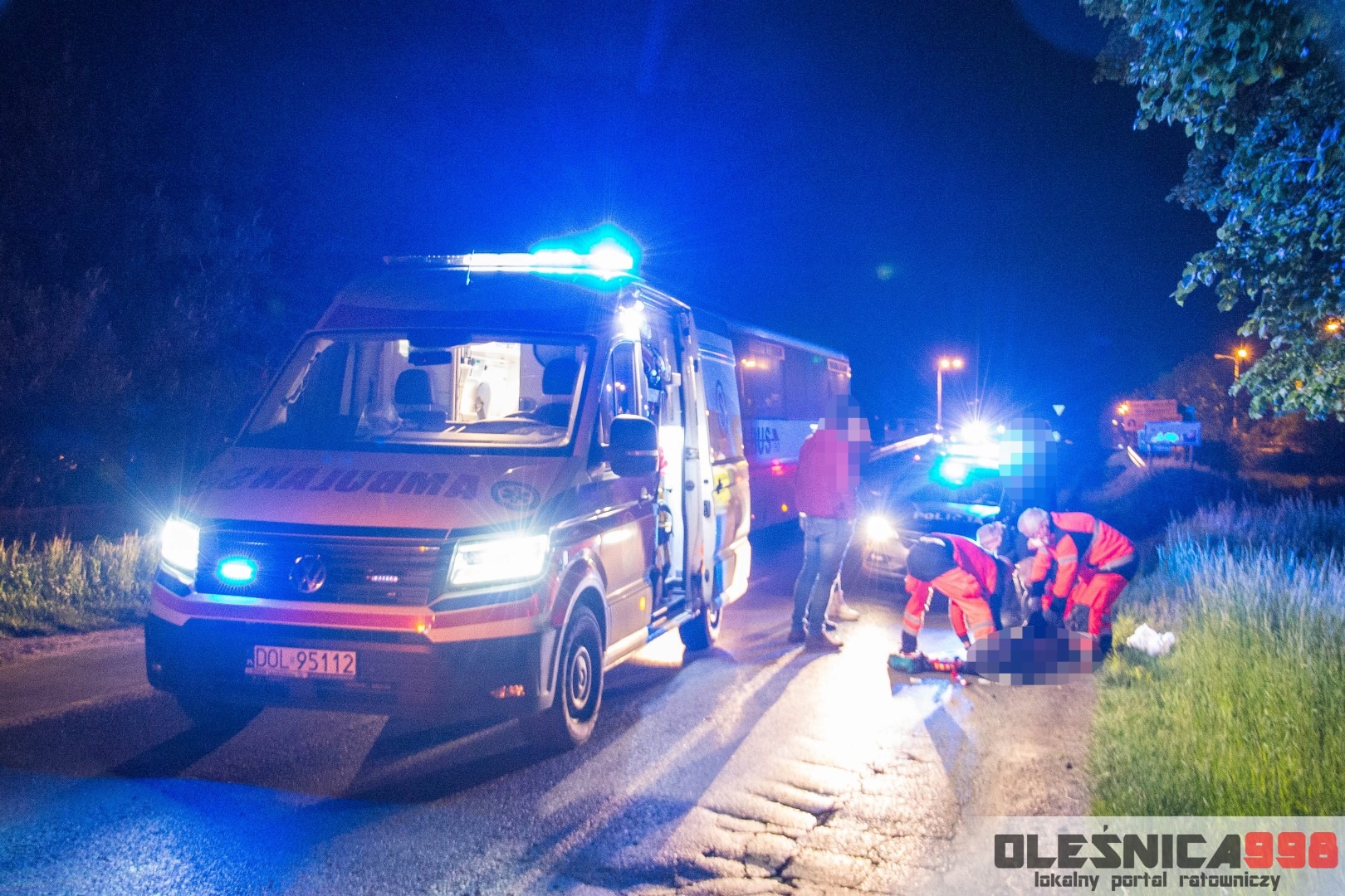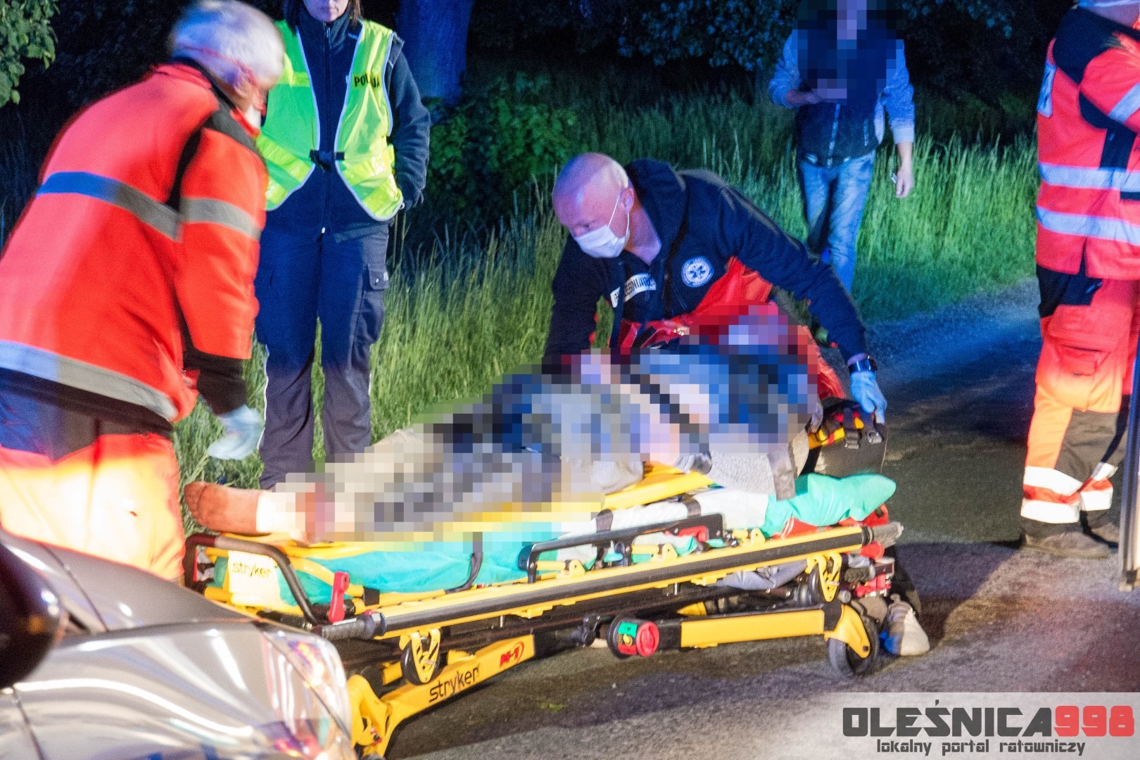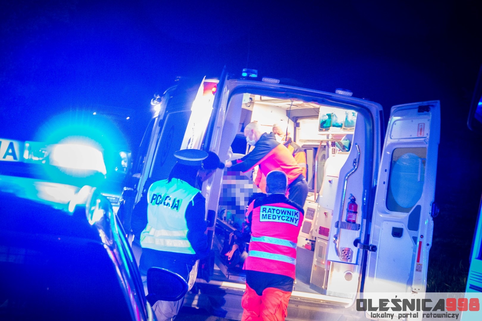 Jako pierwsi na miejscu pojawili się oleśniccy Mundurowi, którzy potwierdzili informację o zdarzeniu z udziałem samochodu osobowego i pieszego. Ranny mężczyzna znajdował się pod opieką osób postronnych. Po chwili na miejsce dotarł zespół Ratownictwa Medycznego, który przejął poszkodowanego. Po wstępnej ocenie stanu rannego, kierownik zespołu podjął decyzję o wezwaniu na miejsce śmigłowca Lotniczego Pogotowia Ratunkowego. Stan mężczyzny był bardzo ciężki – doznał on między innymi urazu głowy oraz złamania kończyny dolnej i przez cały czas pozostawał nieprzytomny.