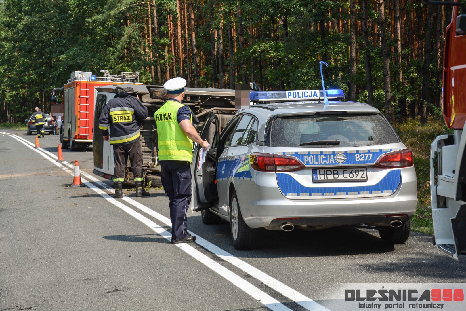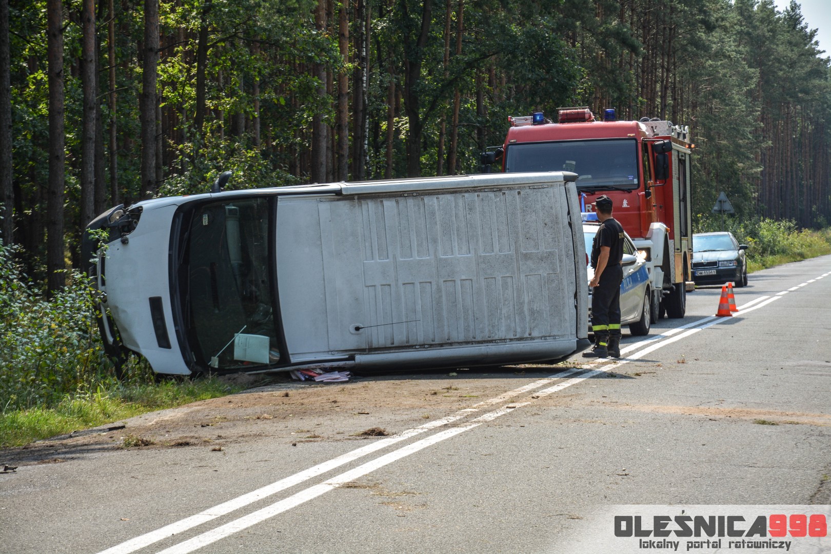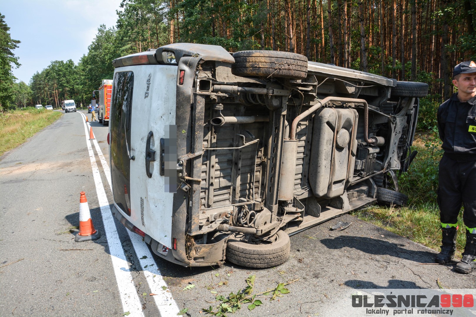 Jak udało nam się ustalić, do zdarzenia doszło zaraz za łukiem drogi, z którego najprawdopodobniej „wyniosło” dostawczego Renault, jadącego od strony Twardogóry w kierunku Oleśnicy. W tym samym czasie przeciwnym pasem miał poruszać się Volkswagen. Wskutek utraty panowania nad busem, ten uderzył w rozpędzonego Volkswagena, który wypadł z drogi i dachował. Pojazd sprawcy na sam koniec przewrócił się na bok. Na miejscu ruch odbywa się wahadłowo. Trwają czynności w miejscu zdarzenia, mające na celu wyjaśnienie okoliczności wypadku.