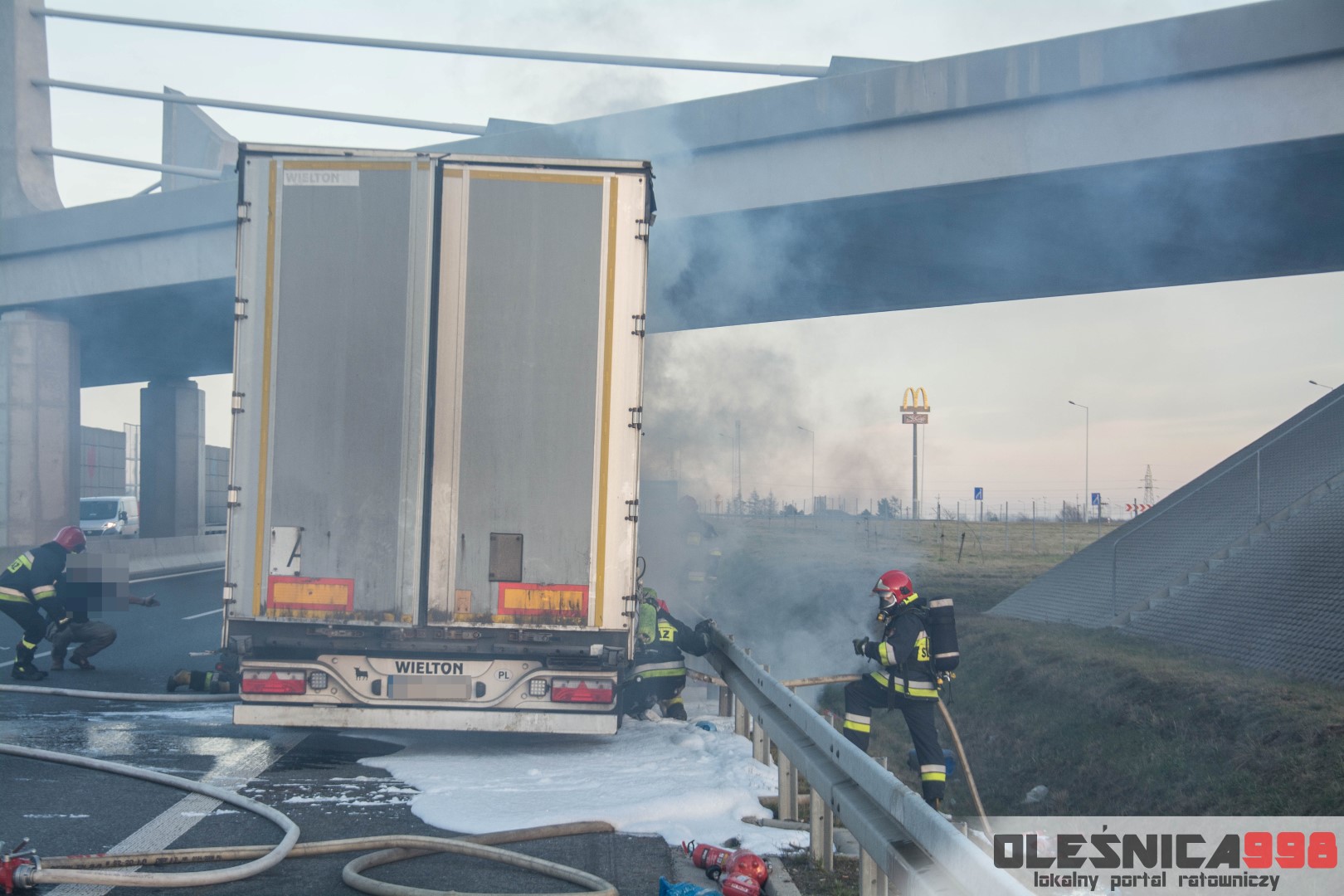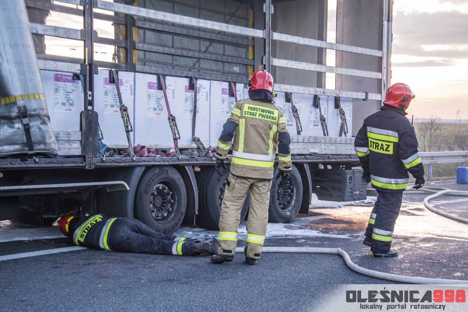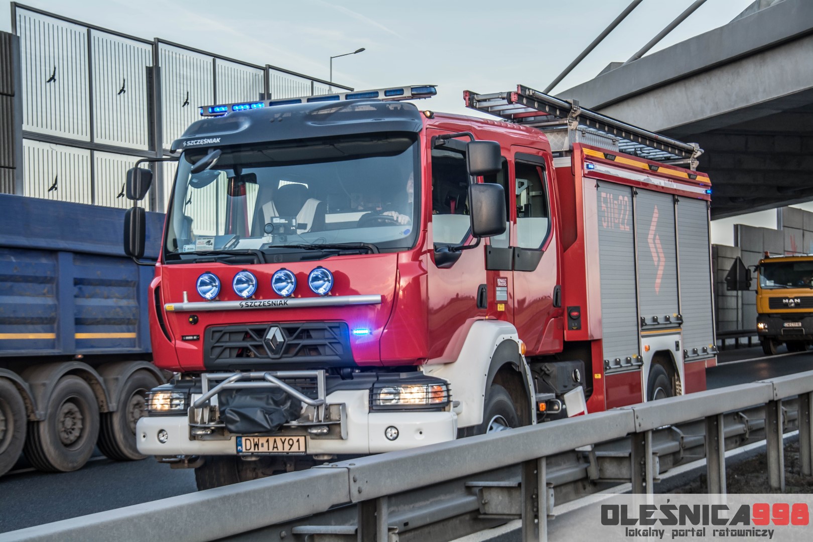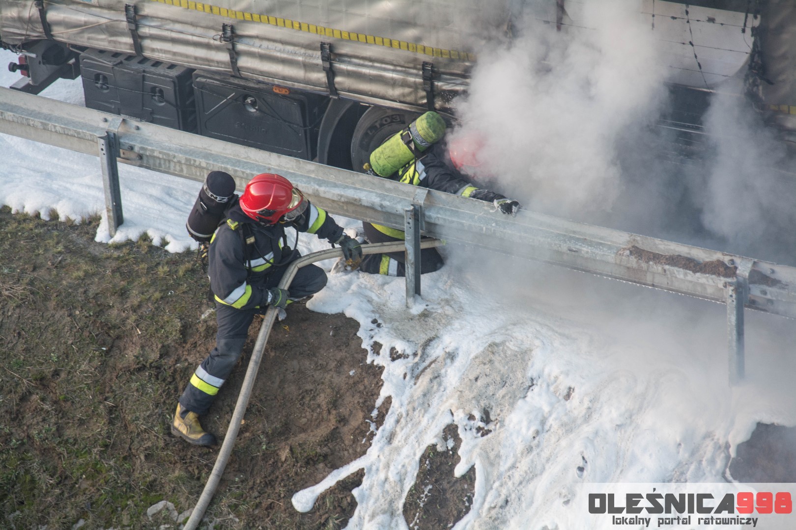 Dzisiejszego popołudnia, około kwadrans po godzinie 15:00, Dyżurny Operacyjny SK KP PSP w Oleśnicy odebrał zgłoszenie mówiące o pożarze samochodu ciężarowego na węźle drogowym Oleśnica Zachód na trasie S8. Na miejsce zadysponowane zostały dwa zastępy gaśnicze z oleśnickiej Jednostki Ratowniczo – Gaśniczej, a także samochód operacyjny. Informację o zdarzeniu otrzymał również Dyżurny Policji, który na miejsce zadysponował patrol Mundurowych z Wydziału Ruchu Drogowego.