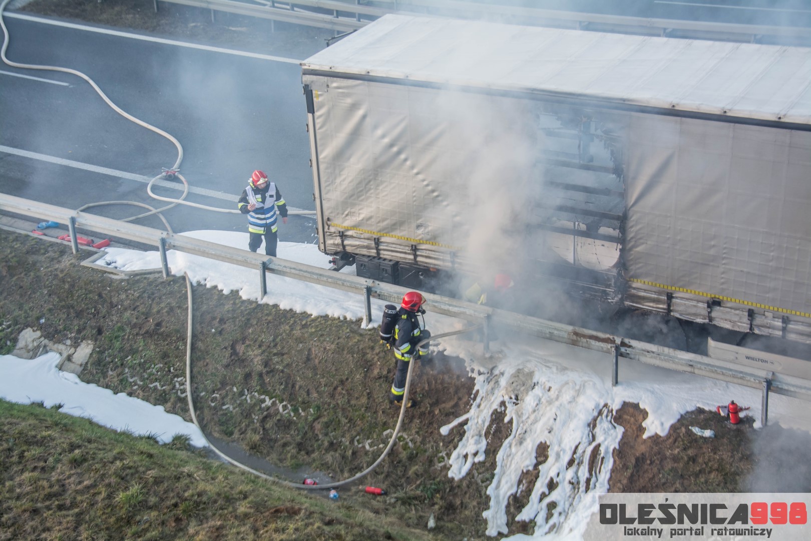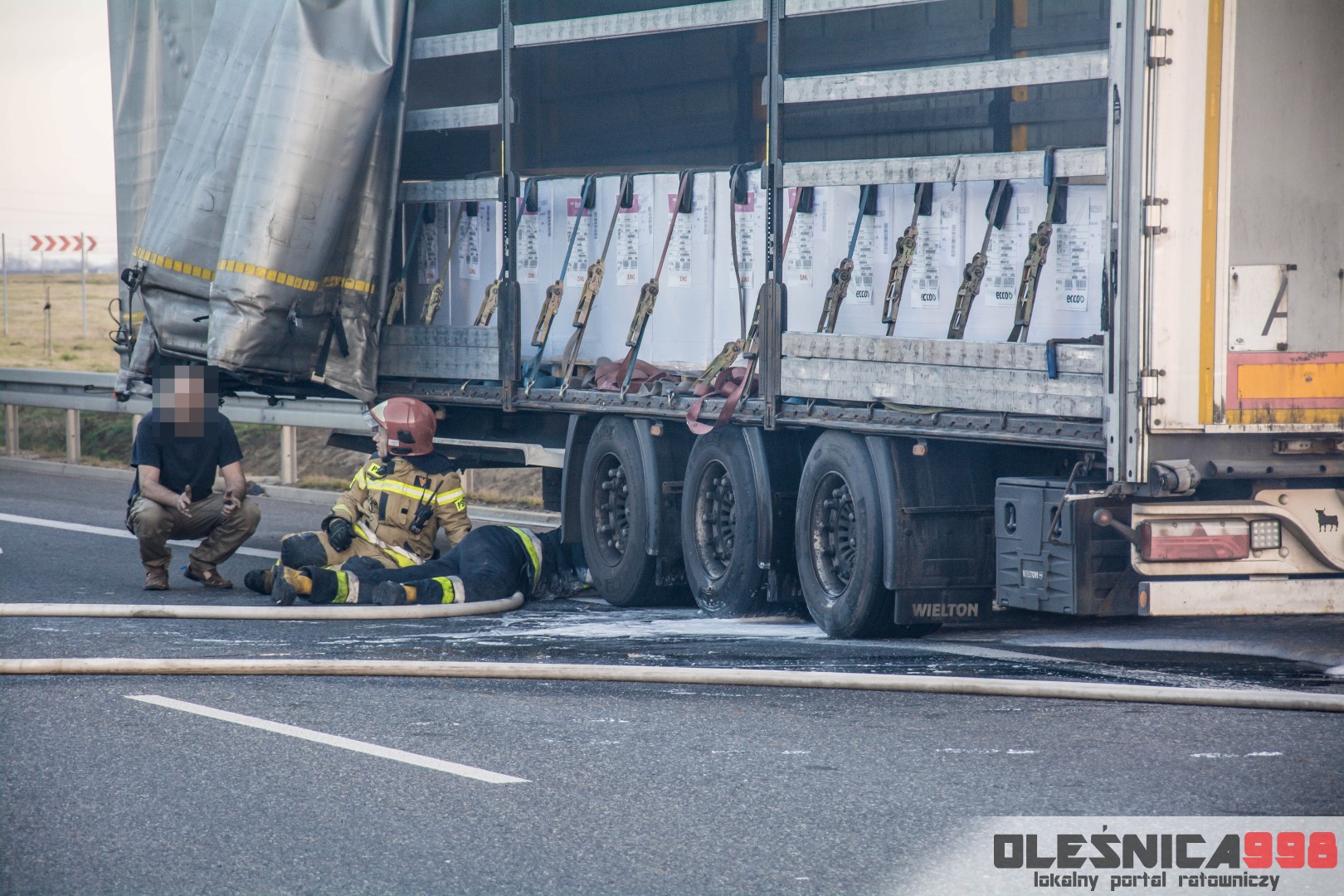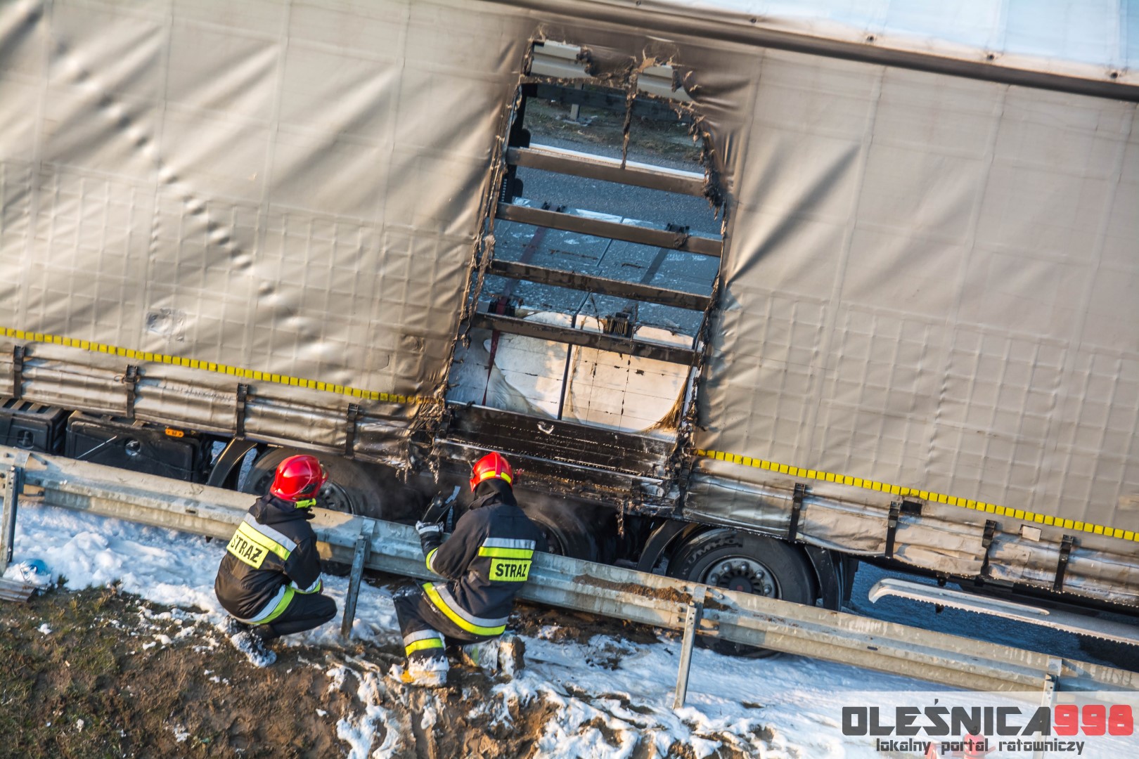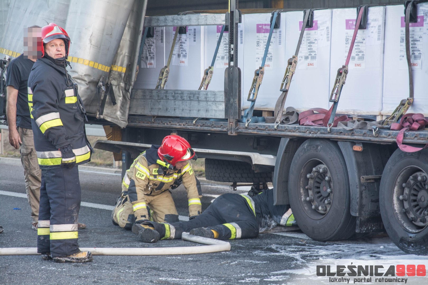 Dzisiejszego popołudnia, około kwadrans po godzinie 15:00, Dyżurny Operacyjny SK KP PSP w Oleśnicy odebrał zgłoszenie mówiące o pożarze samochodu ciężarowego na węźle drogowym Oleśnica Zachód na trasie S8. Na miejsce zadysponowane zostały dwa zastępy gaśnicze z oleśnickiej Jednostki Ratowniczo – Gaśniczej, a także samochód operacyjny. Informację o zdarzeniu otrzymał również Dyżurny Policji, który na miejsce zadysponował patrol Mundurowych z Wydziału Ruchu Drogowego.