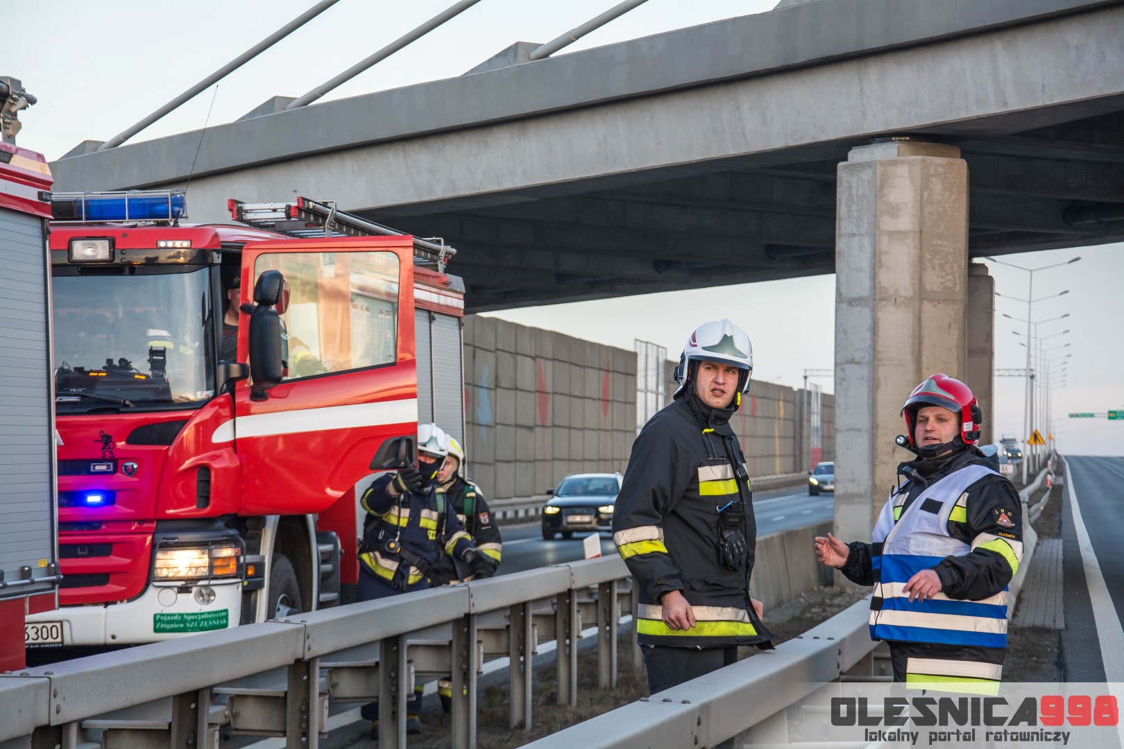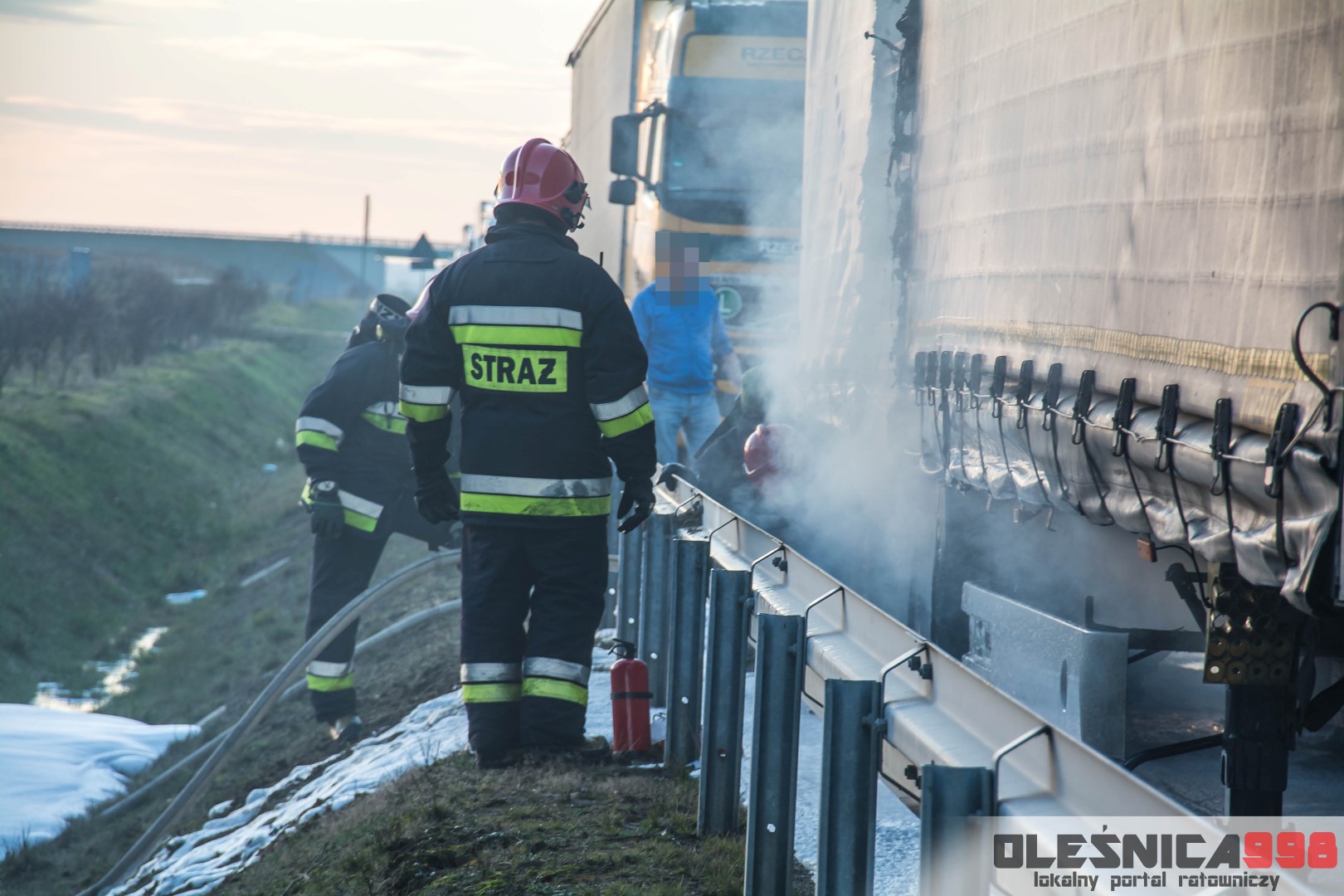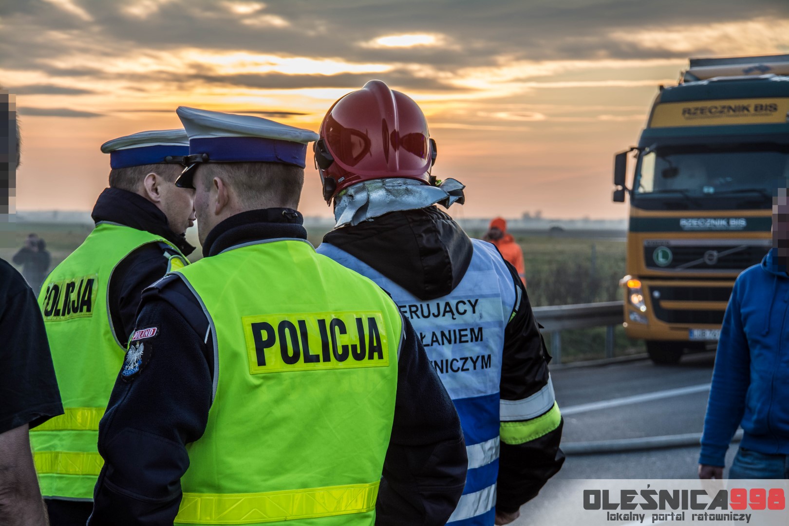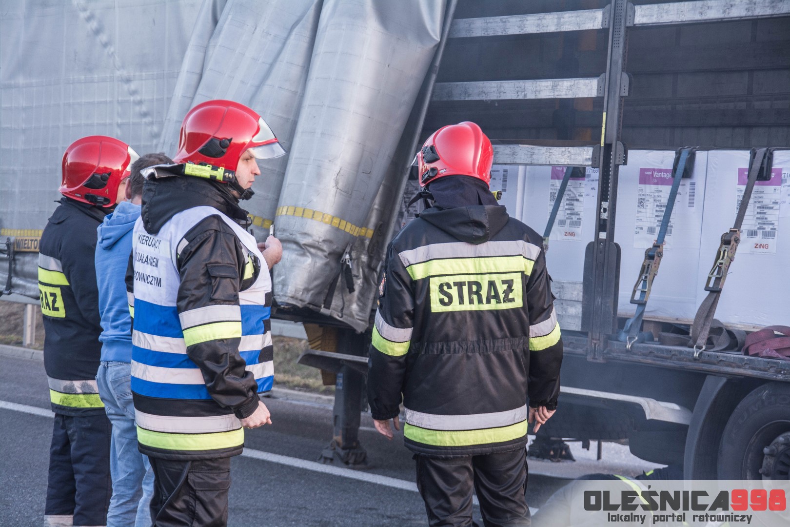 Dzisiejszego popołudnia, około kwadrans po godzinie 15:00, Dyżurny Operacyjny SK KP PSP w Oleśnicy odebrał zgłoszenie mówiące o pożarze samochodu ciężarowego na węźle drogowym Oleśnica Zachód na trasie S8. Na miejsce zadysponowane zostały dwa zastępy gaśnicze z oleśnickiej Jednostki Ratowniczo – Gaśniczej, a także samochód operacyjny. Informację o zdarzeniu otrzymał również Dyżurny Policji, który na miejsce zadysponował patrol Mundurowych z Wydziału Ruchu Drogowego.