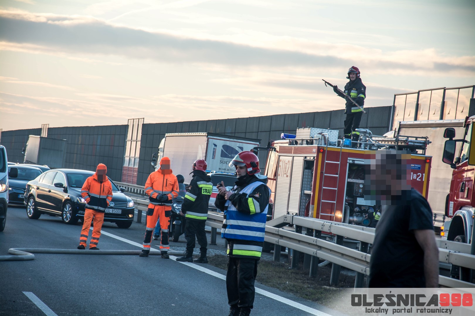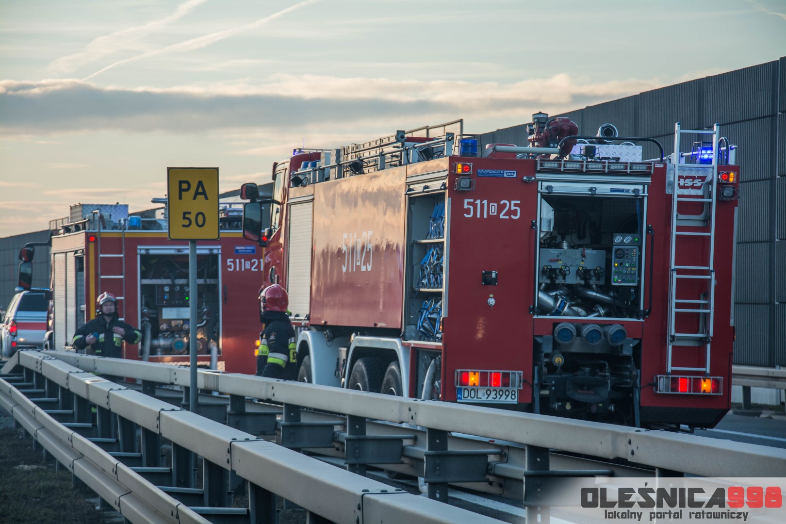 Po dotarciu pierwszego zastępu na miejsce zdarzenia i rozpoznaniu stwierdzono, że tuż przed węzłem Oleśnica Zachód (Dąbrowa), na pasie w kierunku Warszawy, płonie naczepa samochodu ciężarowego. W wyniku zdarzenia nikt nie został poszkodowany. Przystąpiono do podawania prądów wody w natarciu na objętą ogniem naczepę. W toku prowadzonych działań KDR przekazał informację do SK KP o potrzebie zadysponowania na miejsce dodatkowych sił i środków. Do zdarzenia skierowane zostały dodatkowo dwa zastępy Straży Pożarnej – ciężki samochód z OSP Dobroszyce oraz średni wóz z JRG Oleśnica.