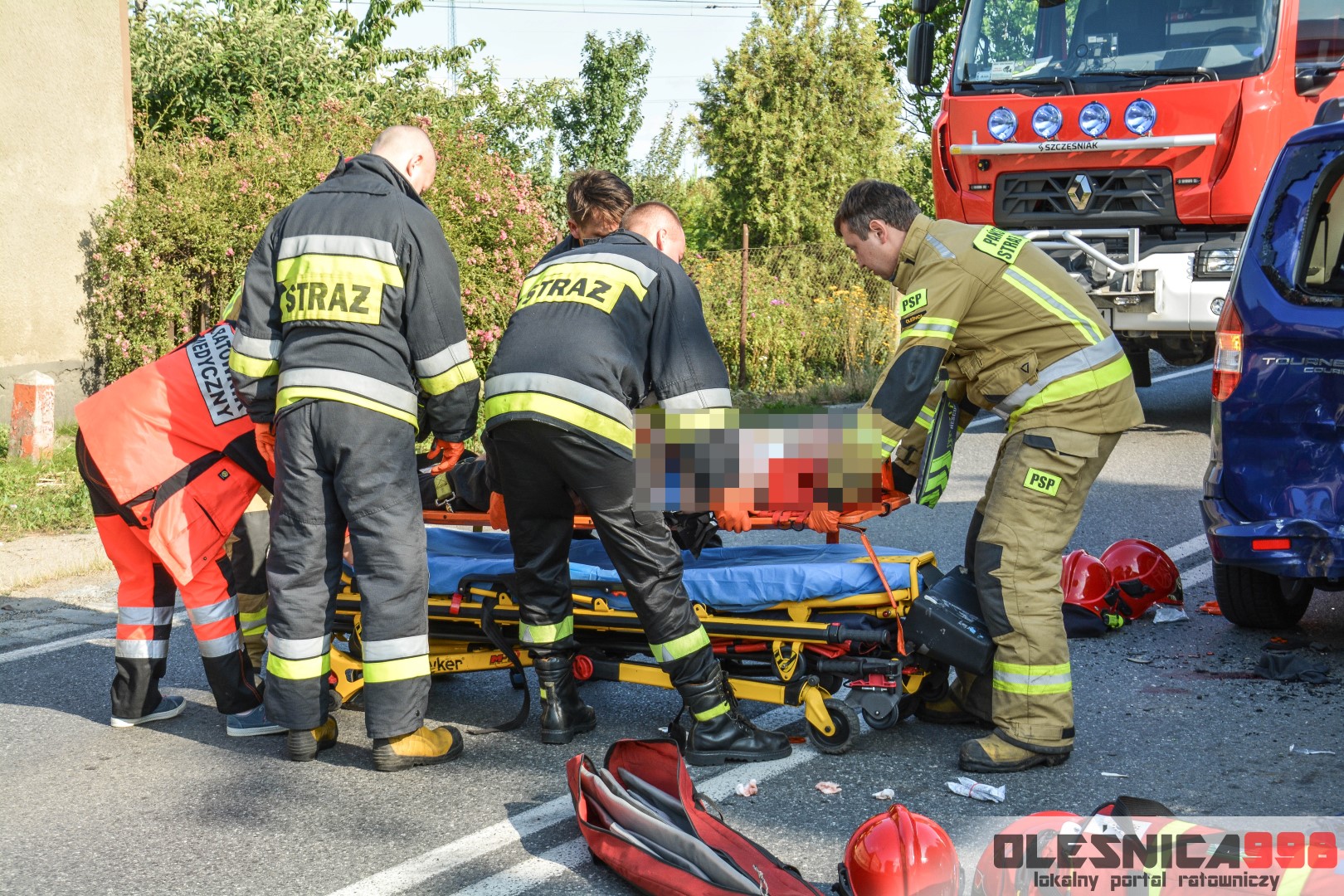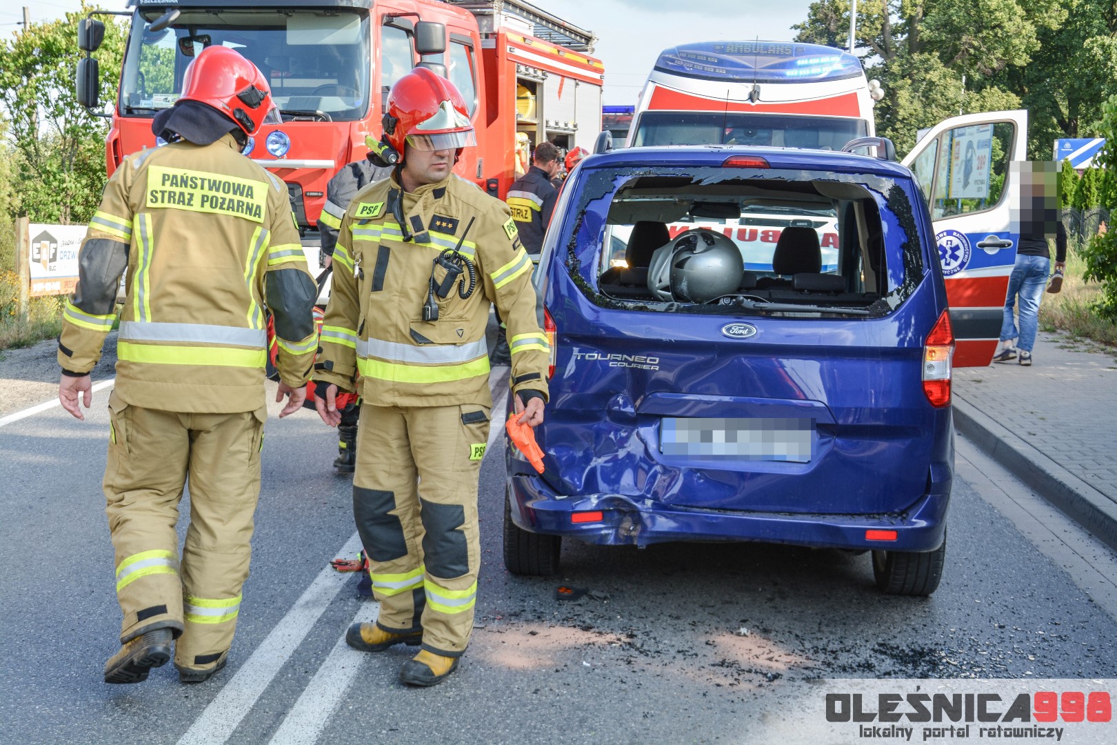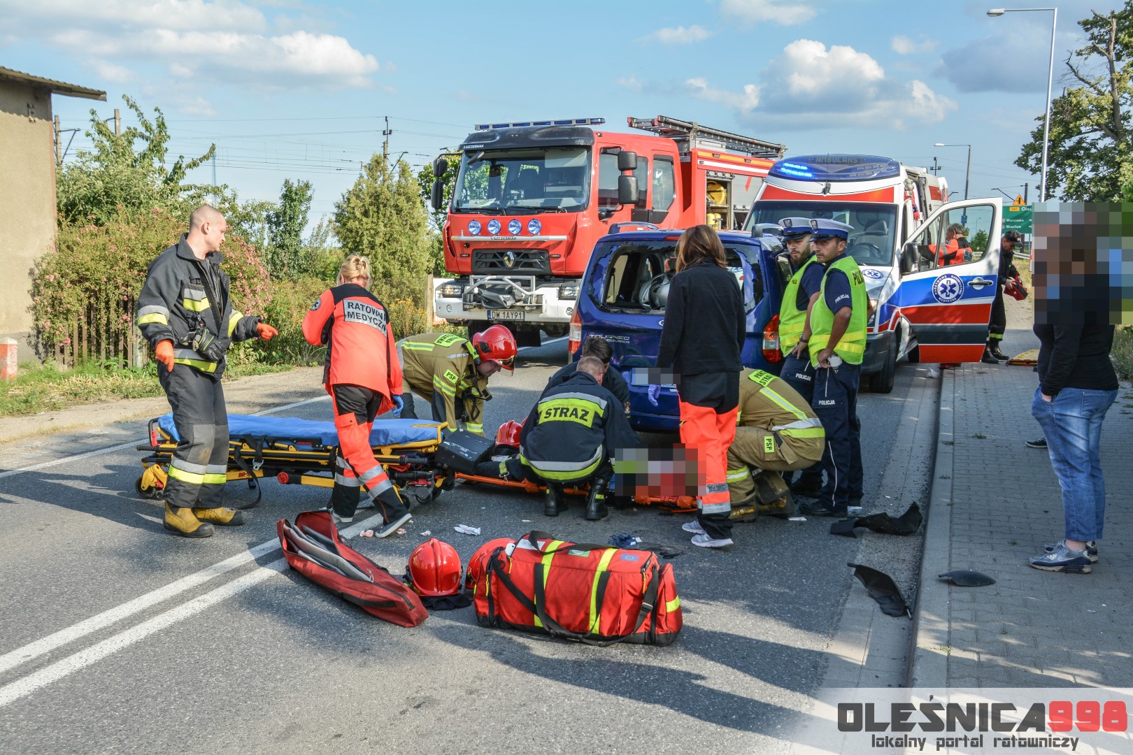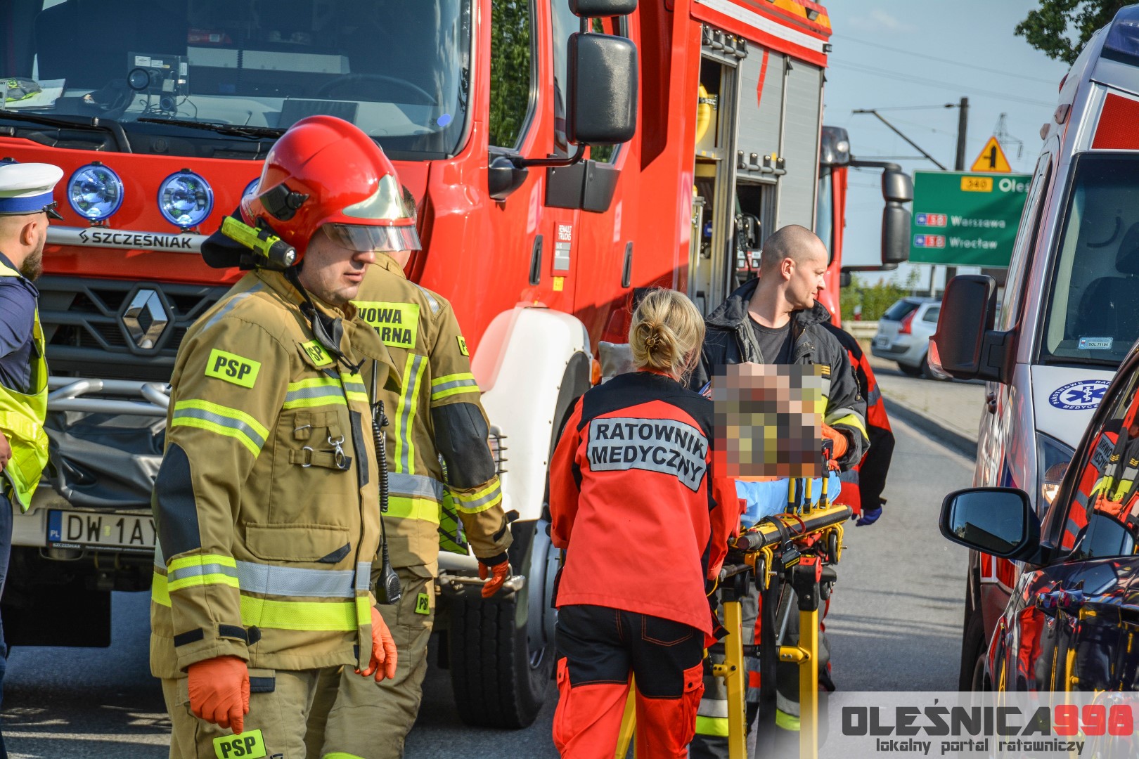 Jako pierwszy na miejsce dotarł zastęp oleśnickich Strażaków wracający z interwencji w Smardzowie. Strażacy w wyniku rozpoznania potwierdzili treść zgłoszenia o zderzeniu jednośladu z samochodem osobowym. W jego wyniku poszkodowany został około 25-letni mężczyzna kierujący jednośladem. Doznał on złamania podudzia jak i również urazu szyi, spowodowanego uderzeniem o rozbitą szybę samochodu. Do czasu dojazdu zespołu Ratownictwa Medycznego rannemu pomocy udzielali Ratownicy Straży.