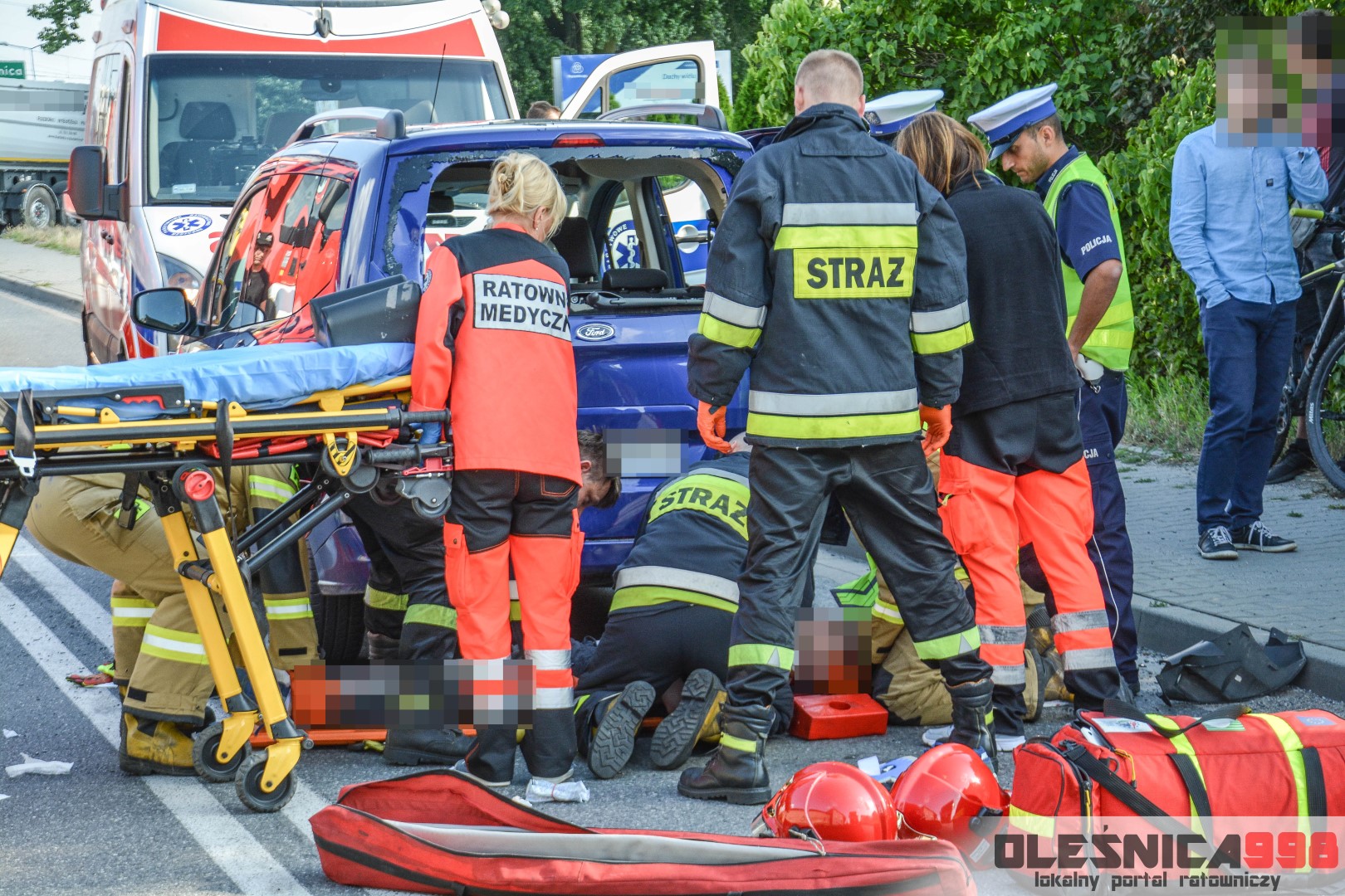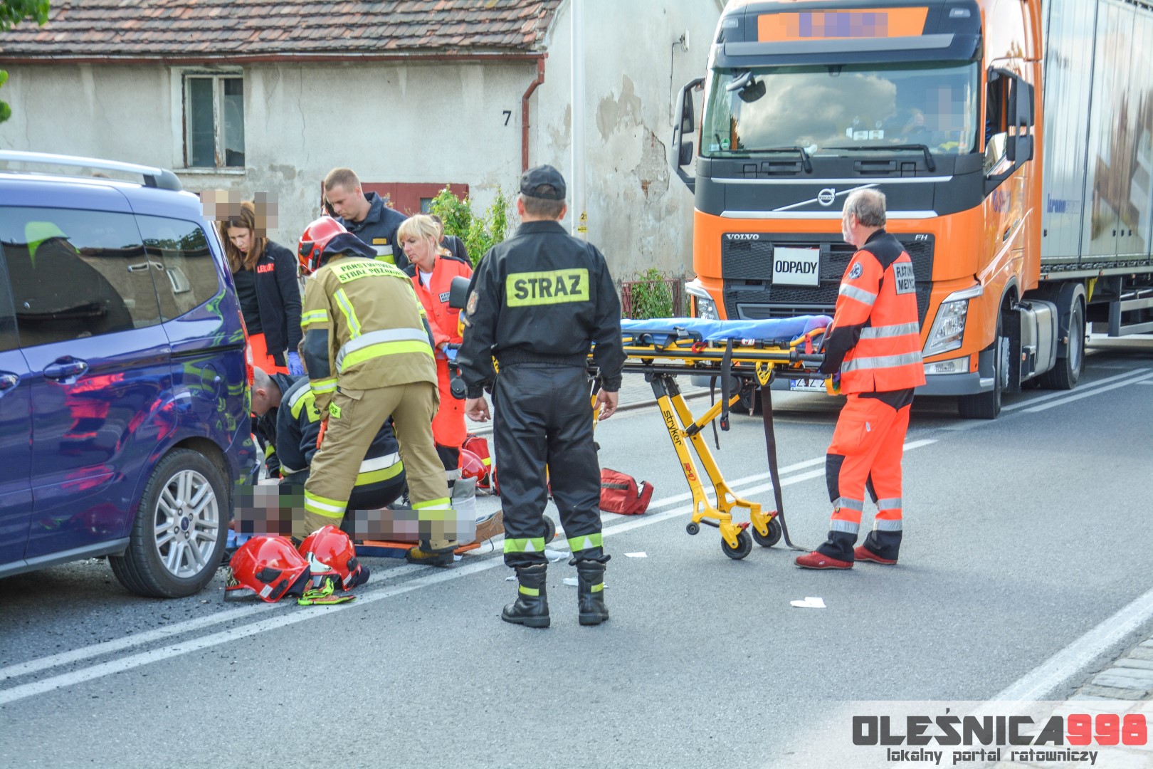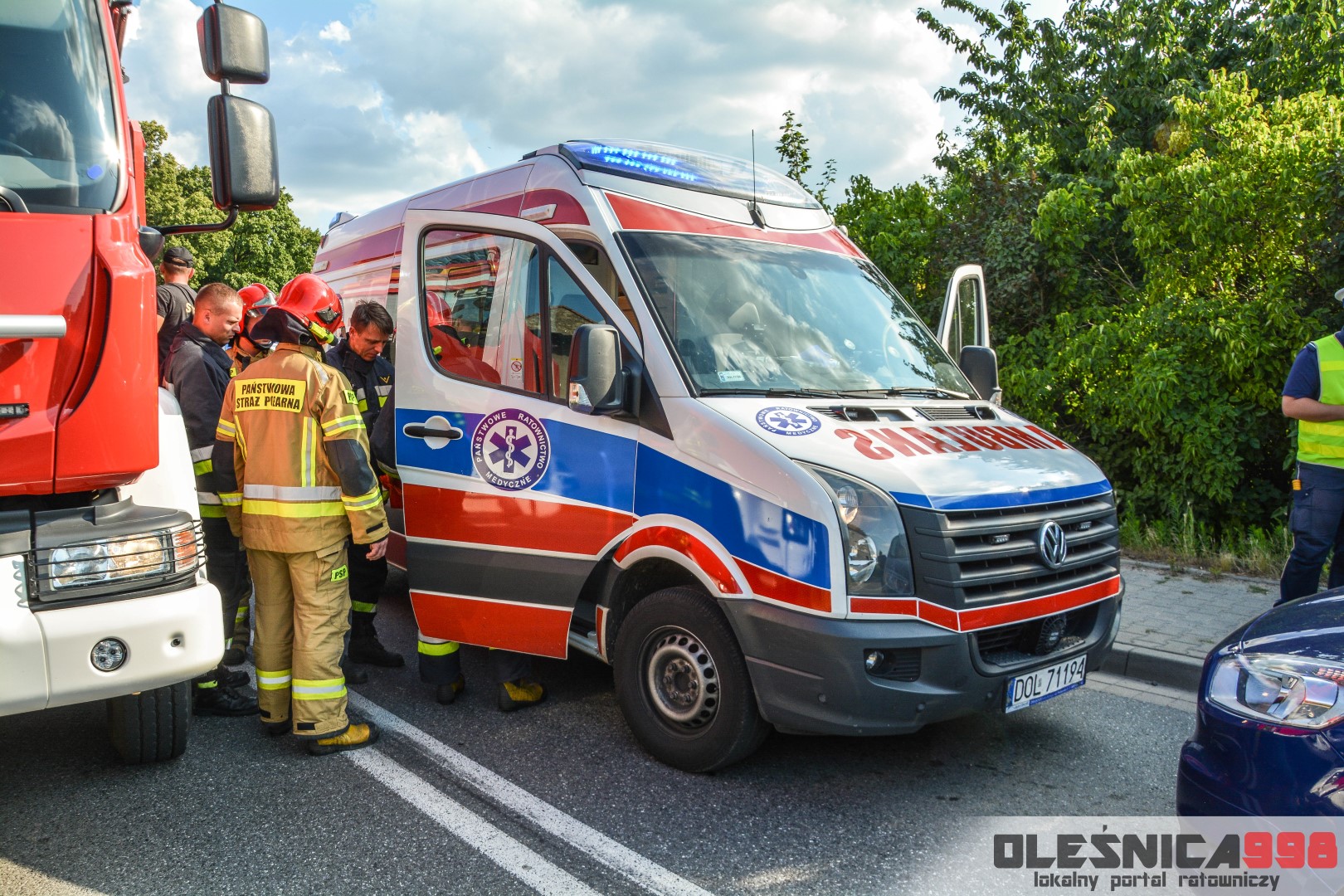 Jako pierwszy na miejsce dotarł zastęp oleśnickich Strażaków wracający z interwencji w Smardzowie. Strażacy w wyniku rozpoznania potwierdzili treść zgłoszenia o zderzeniu jednośladu z samochodem osobowym. W jego wyniku poszkodowany został około 25-letni mężczyzna kierujący jednośladem. Doznał on złamania podudzia jak i również urazu szyi, spowodowanego uderzeniem o rozbitą szybę samochodu. Do czasu dojazdu zespołu Ratownictwa Medycznego rannemu pomocy udzielali Ratownicy Straży.