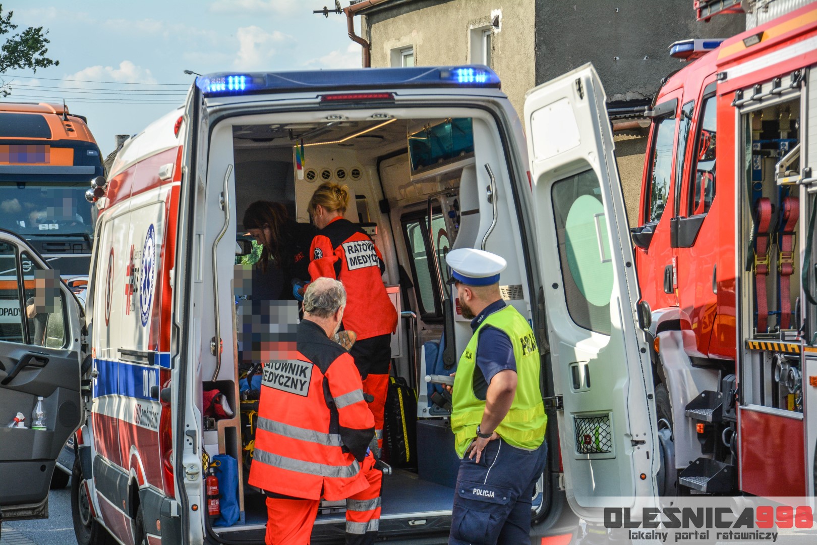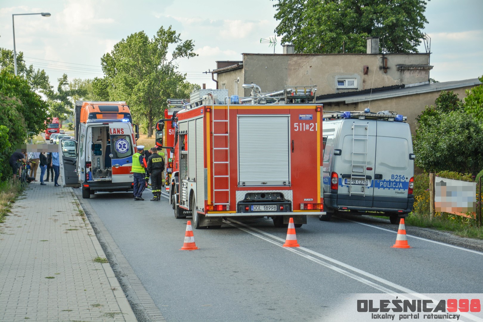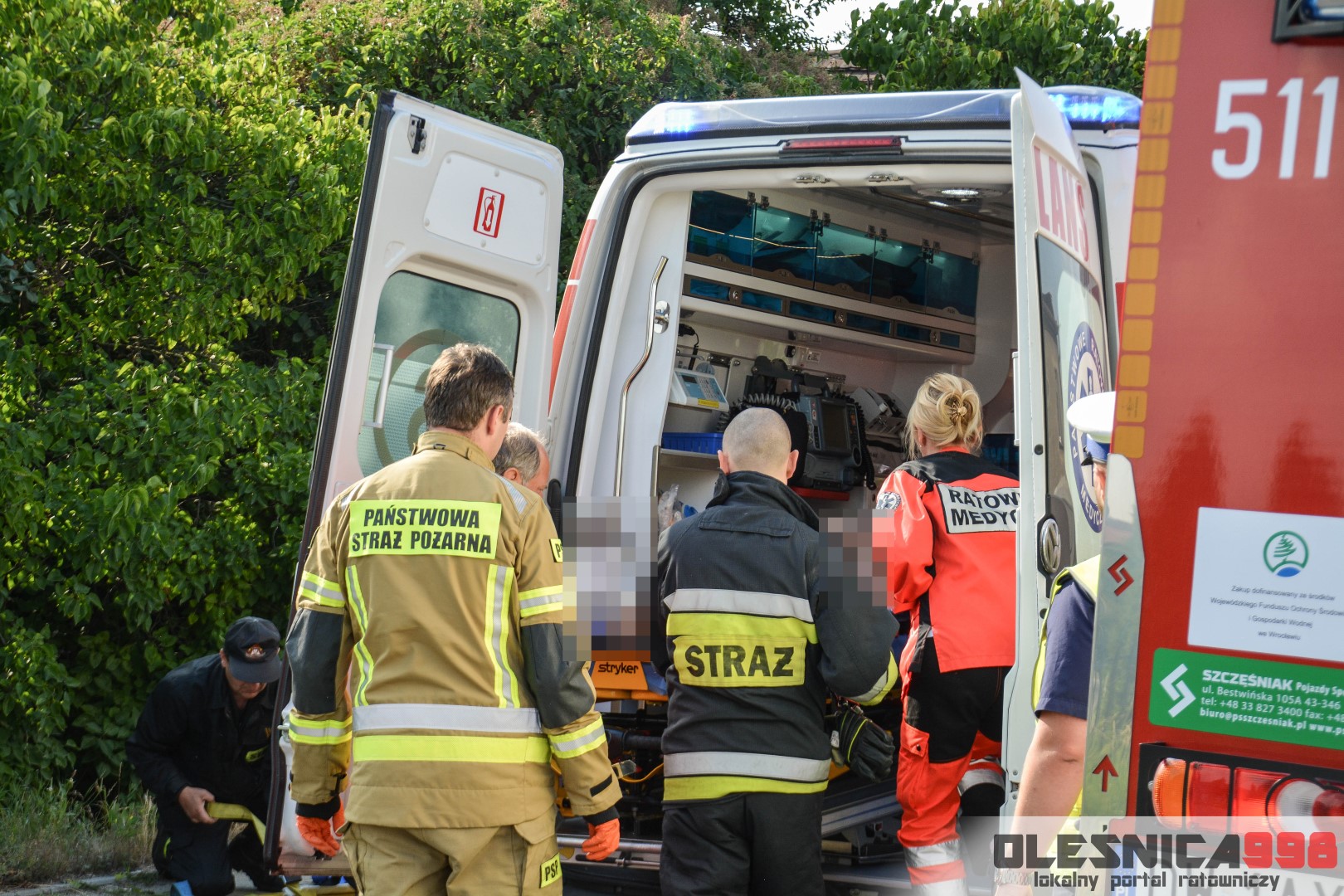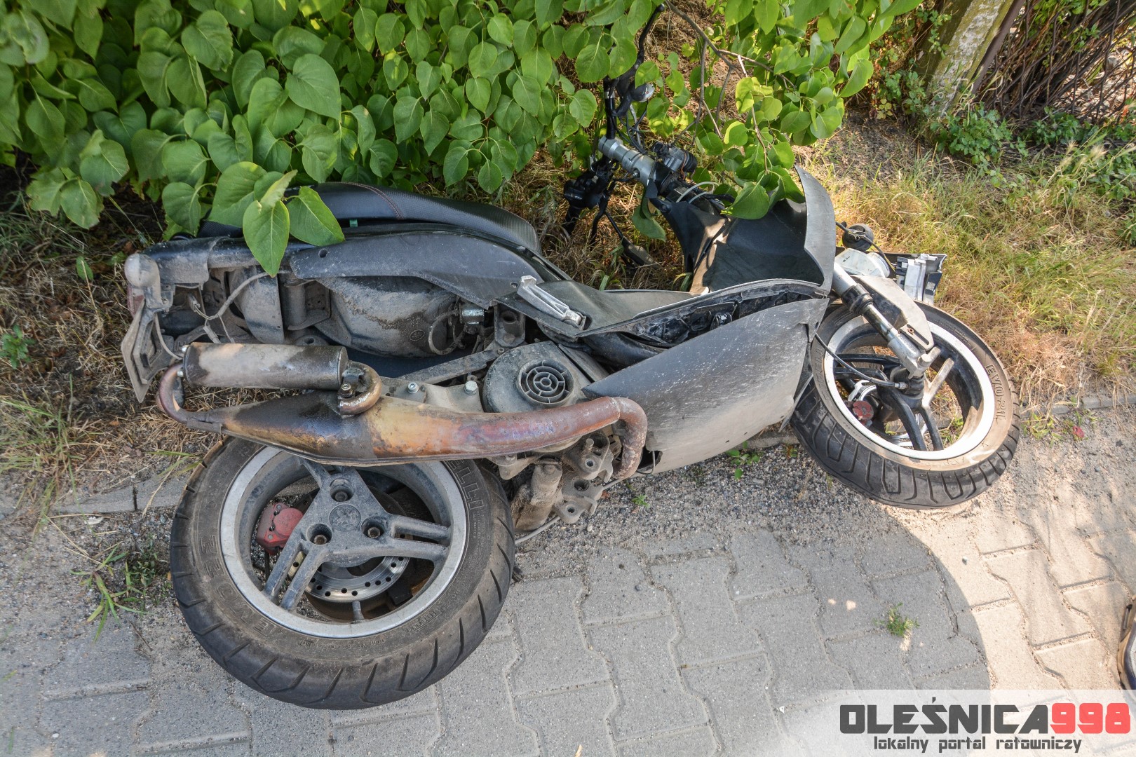 Jako pierwszy na miejsce dotarł zastęp oleśnickich Strażaków wracający z interwencji w Smardzowie. Strażacy w wyniku rozpoznania potwierdzili treść zgłoszenia o zderzeniu jednośladu z samochodem osobowym. W jego wyniku poszkodowany został około 25-letni mężczyzna kierujący jednośladem. Doznał on złamania podudzia jak i również urazu szyi, spowodowanego uderzeniem o rozbitą szybę samochodu. Do czasu dojazdu zespołu Ratownictwa Medycznego rannemu pomocy udzielali Ratownicy Straży.