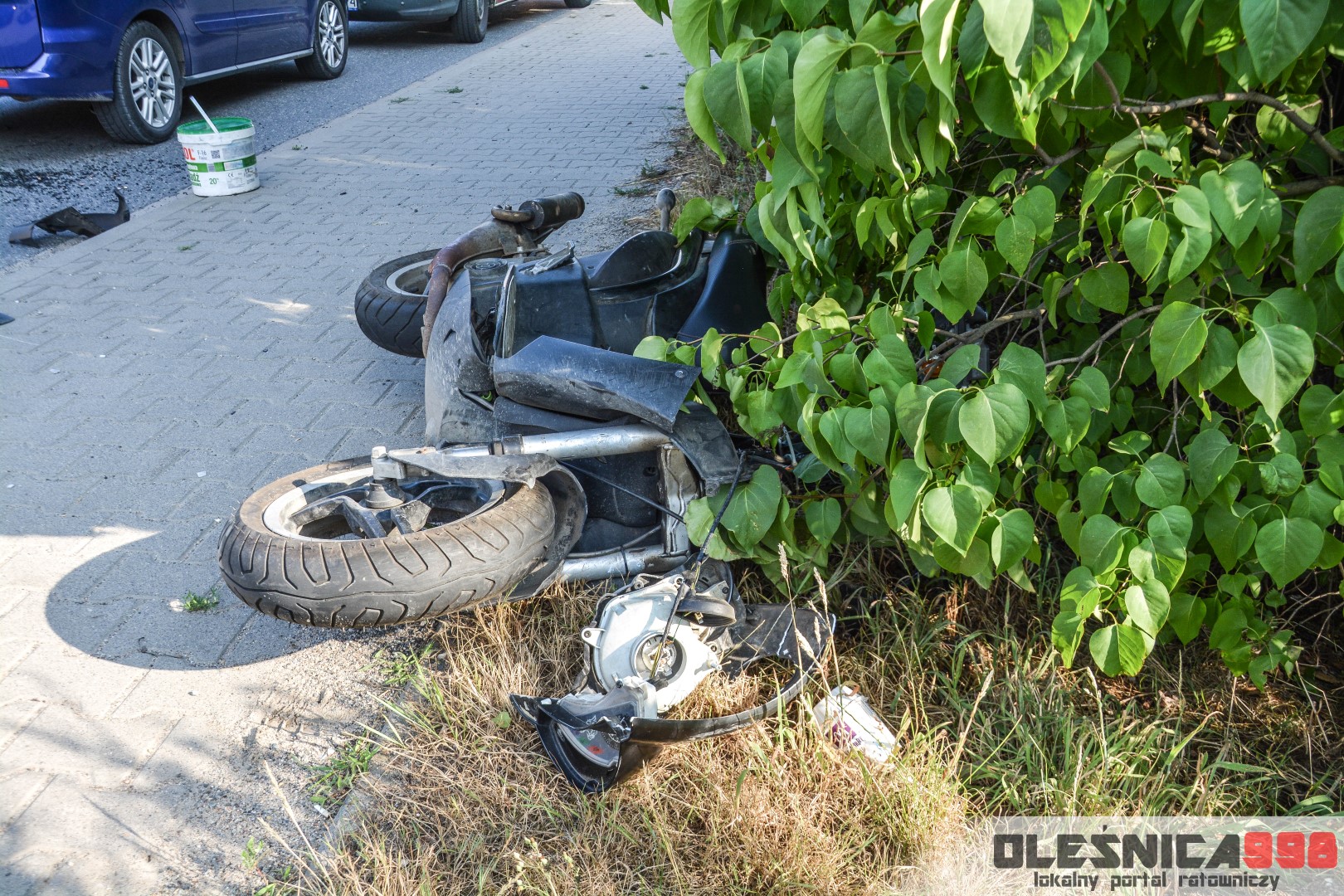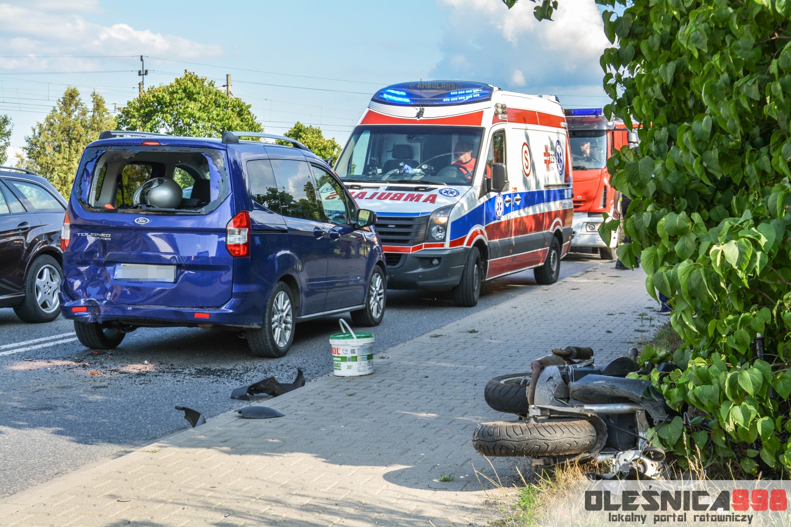 Na miejscu zdarzenia pracują Policjanci ustalający dokładne okoliczności zdarzenia. Miejsce wypadku zabezpiecza również zastęp oleśnickich Strażaków. Wstępnie udało nam się ustalić, że do zdarzenia miało dojść z winy kierującego skuterem, który uderzył w tył Forda. Dokładny przebieg będzie jednak ustalany w toku prowadzonego postępowania. Ruch na drodze został już przywrócony i odbywa się wahadłowo, jednym pasem. Utrudnienia potrwają do czasu zakończenia oględzin przez Policję.