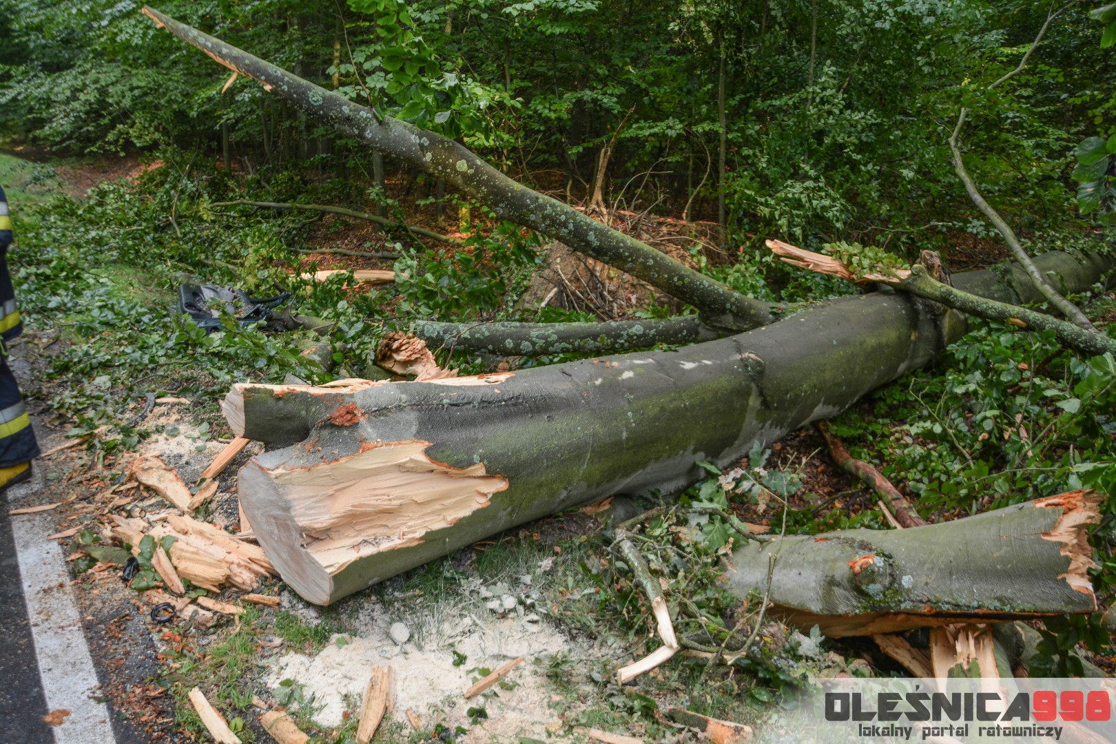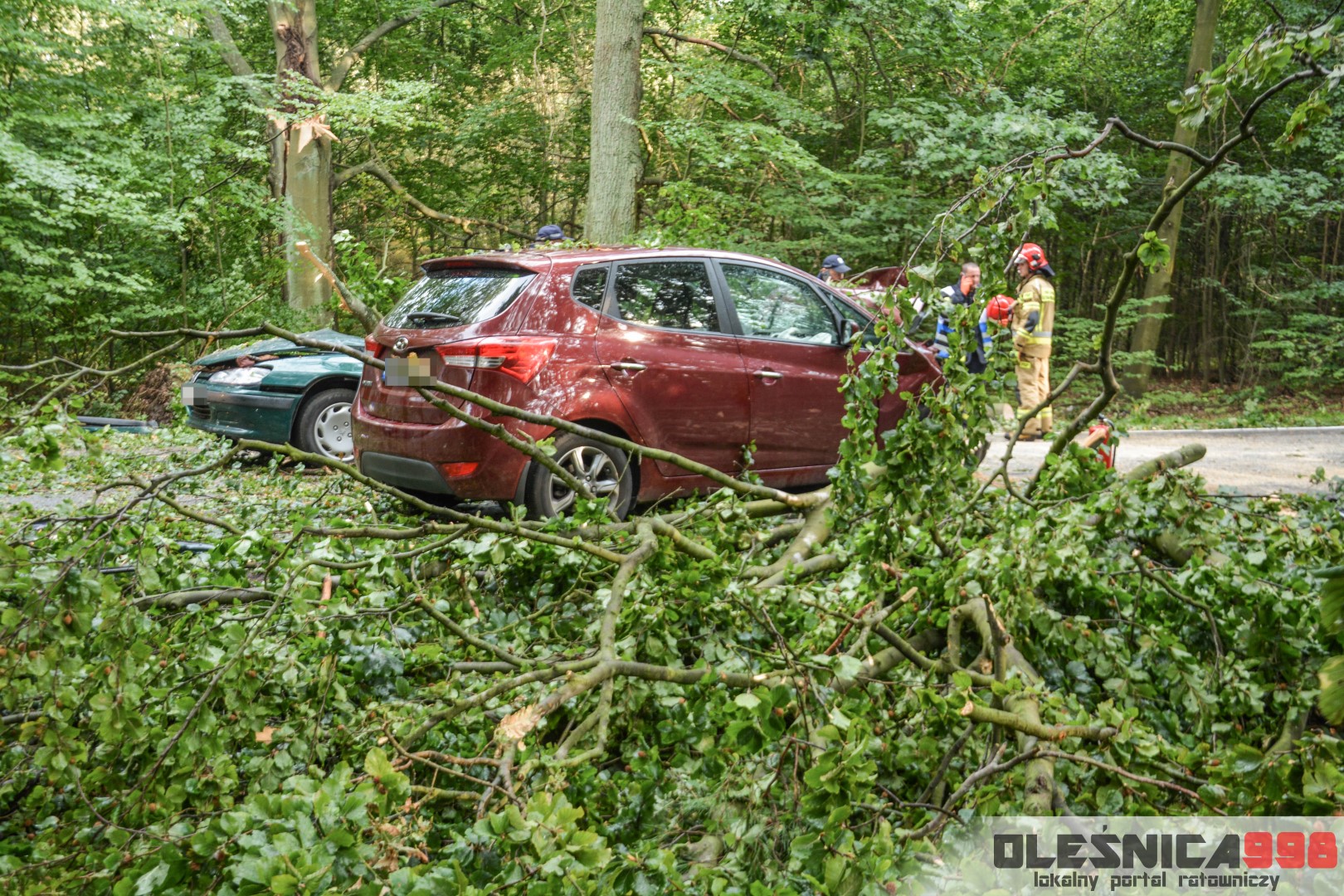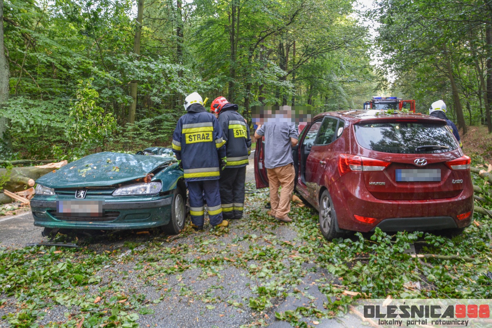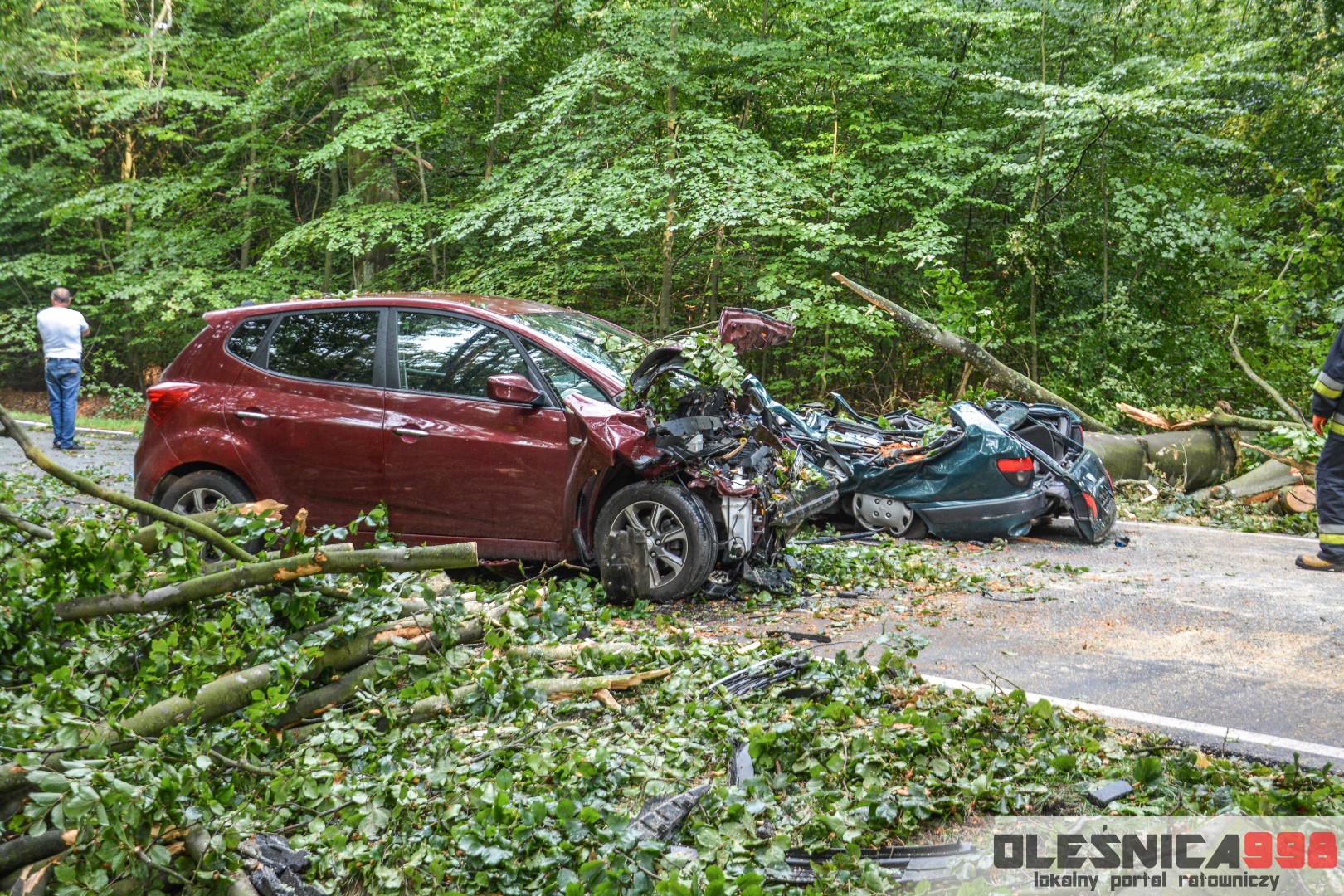 Na miejscu zdarzenia trwają policyjne oględziny. Trwa ustalanie dokładnego przebiegu zdarzenia. Wstępnie wiadomo, że wskutek silnego wiatru, który towarzyszył nagłej nawałnicy jaka przeszła przez północne rejony powiatu, ułamany został spory konar przydrożnego drzewa, który spadając na jezdnię przygniótł przejeżdżającego tamtędy Peugeota i Hyundaia. Droga jest nadal całkowicie zablokowana w obu kierunkach. Obecni na miejscu Strażacy zabezpieczają miejsce wypadku, do czasu usunięcia pojazdów z drogi. Kierowcy kierowani są objazdami przez okoliczne miejscowości. utrudnienia potrwają jeszcze kilka godzin.