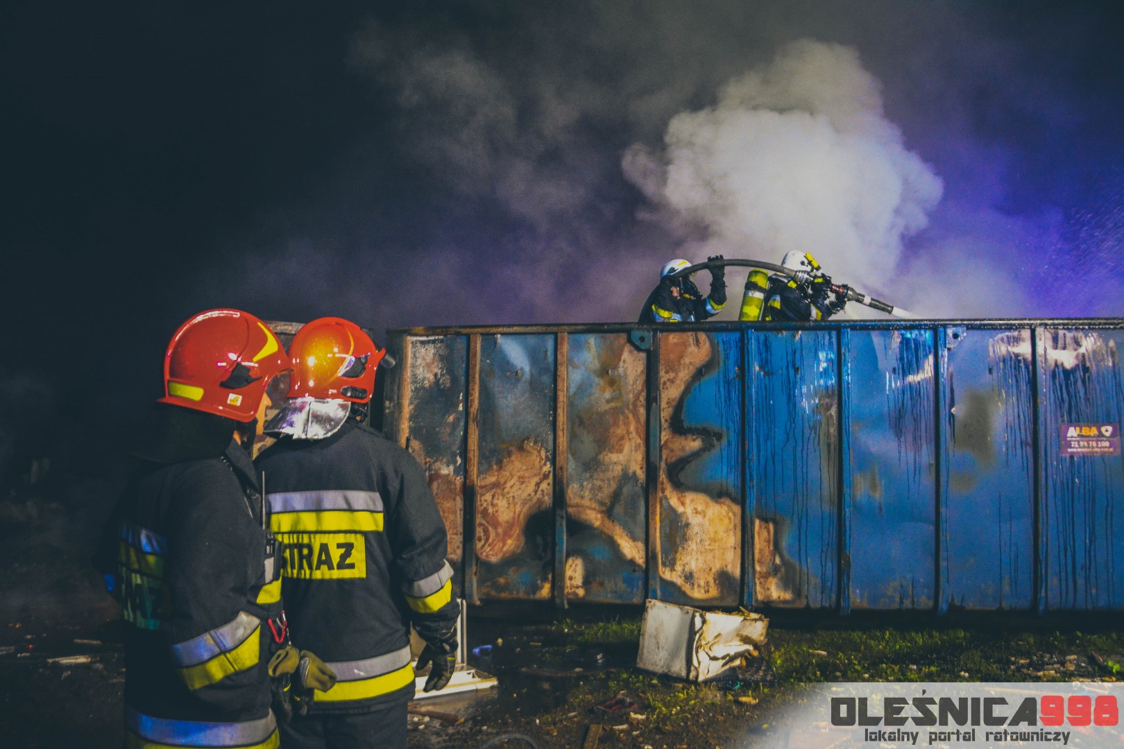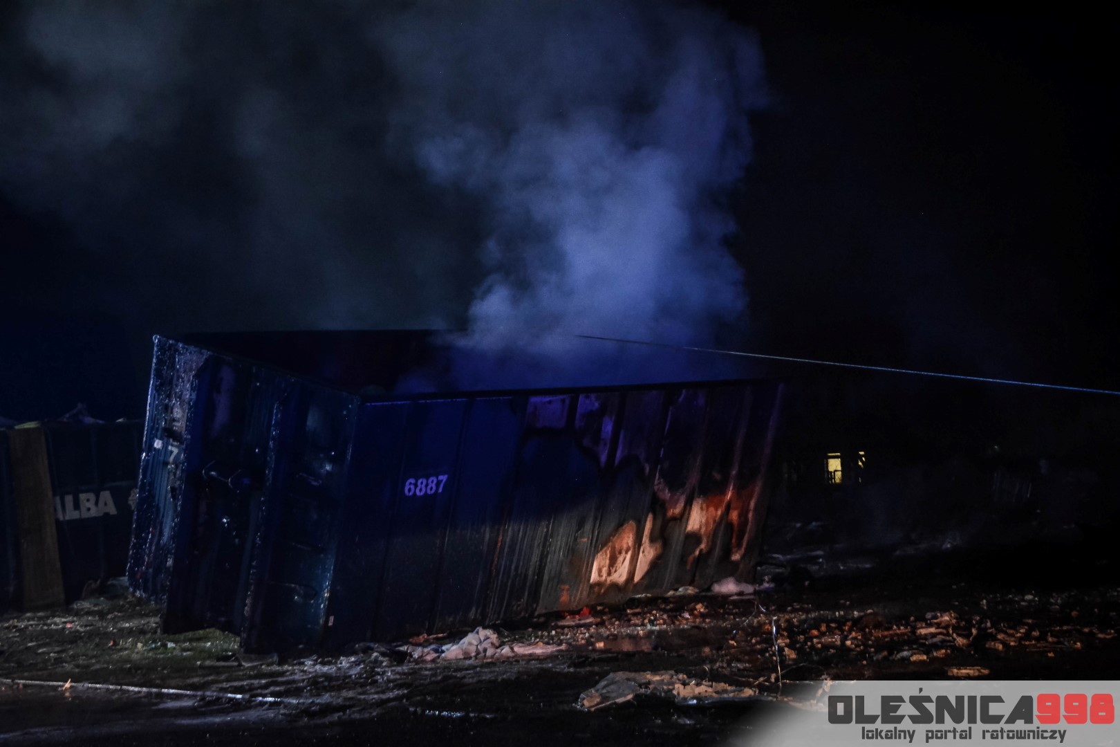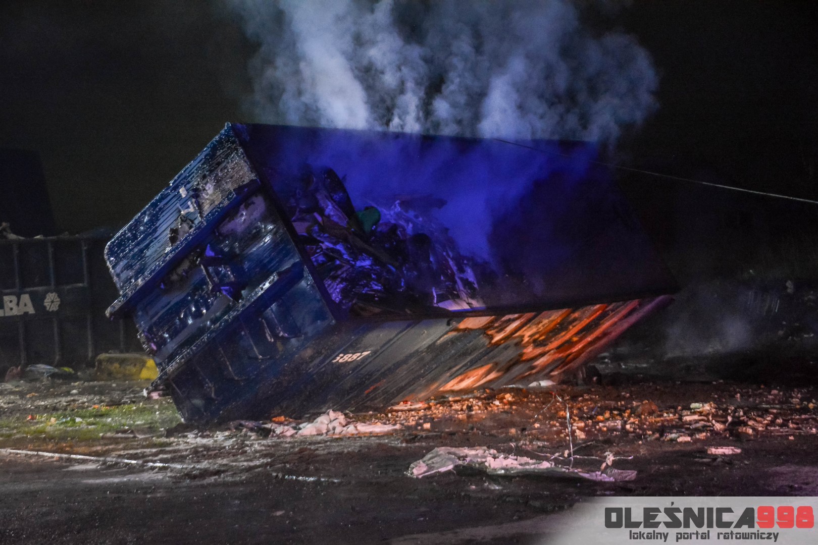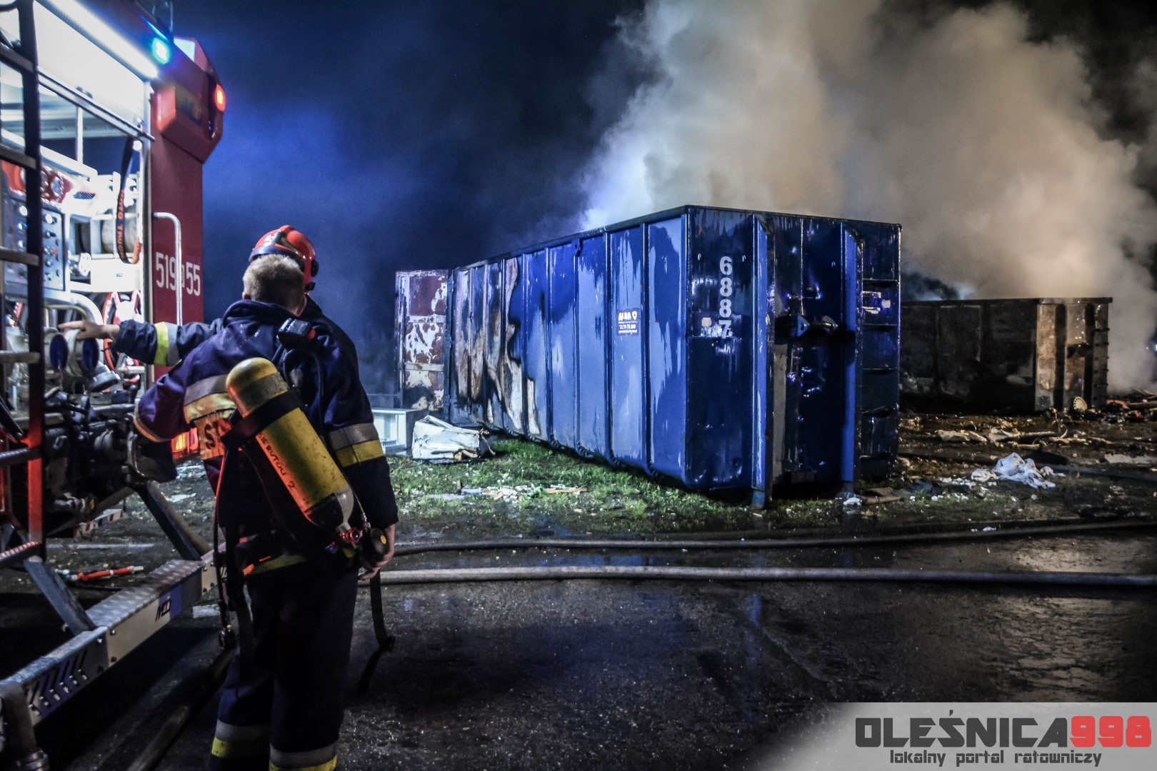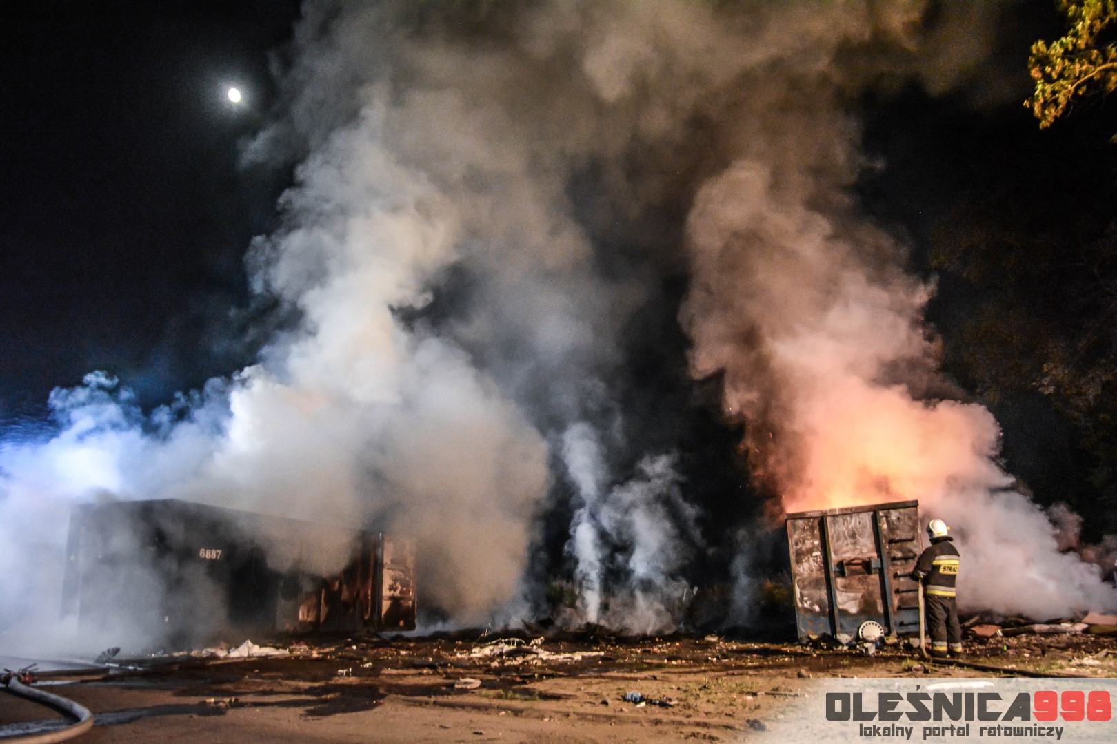 Strażacy po dojeździe na miejsce domniemanego wypalania trawy zastali mocno rozwinięty pożar składowiska śmieci. Ogniem objęte były dwa kontenery, a także zalegające na ziemi hałdy odpadów. Dowódca obecnego na miejscu zastępu polecił Dyżurnej Stanowiska Kierowania, zadysponowanie na miejsce dodatkowych sił i środków.