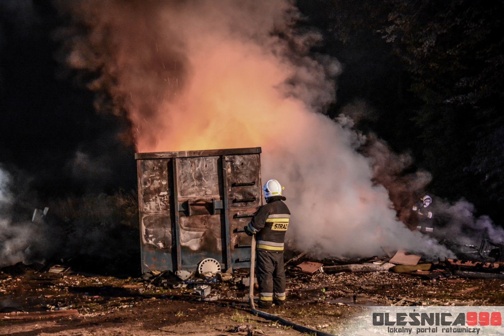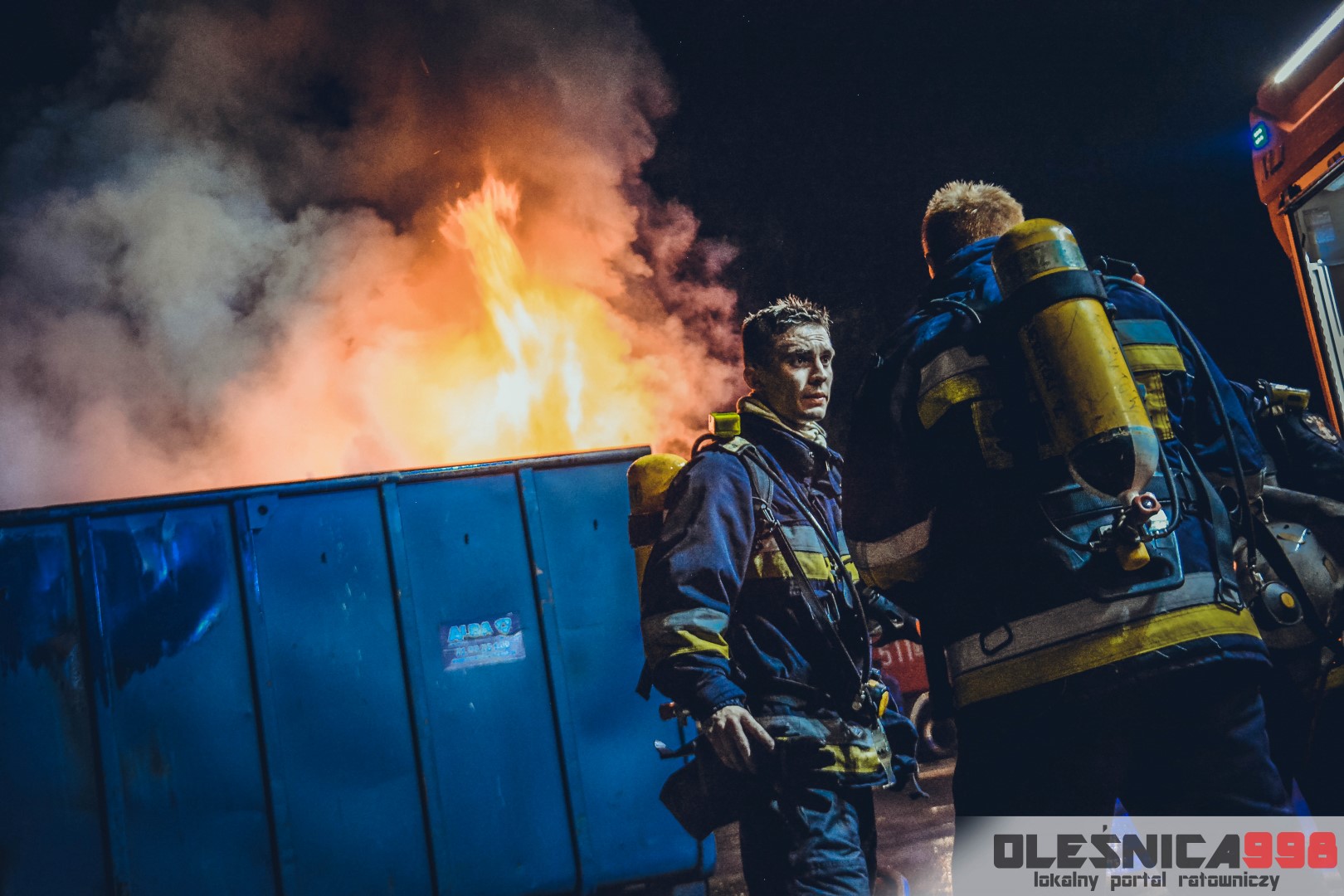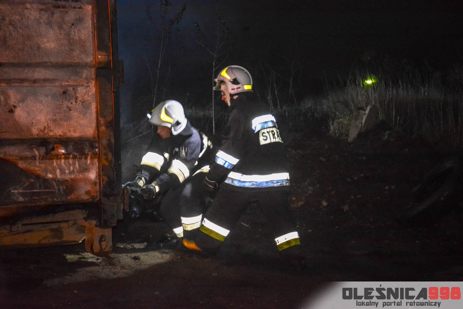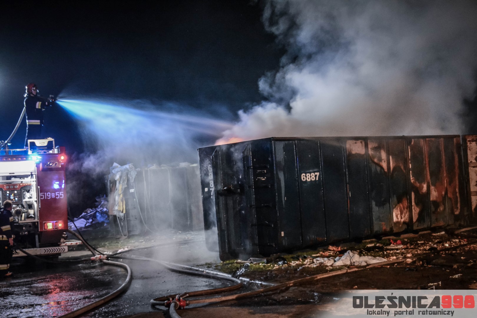 Strażacy po dojeździe na miejsce domniemanego wypalania trawy zastali mocno rozwinięty pożar składowiska śmieci. Ogniem objęte były dwa kontenery, a także zalegające na ziemi hałdy odpadów. Dowódca obecnego na miejscu zastępu polecił Dyżurnej Stanowiska Kierowania, zadysponowanie na miejsce dodatkowych sił i środków.