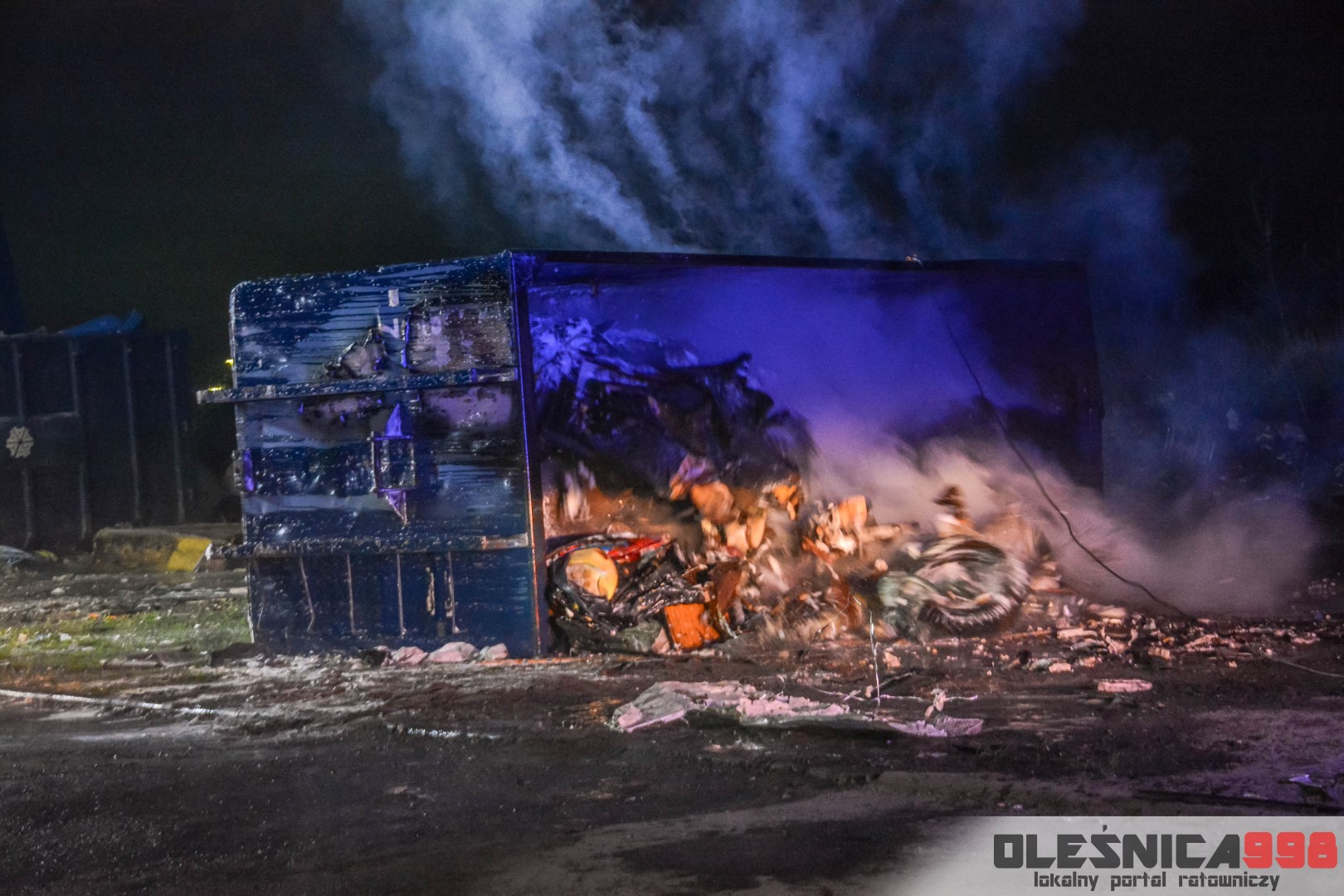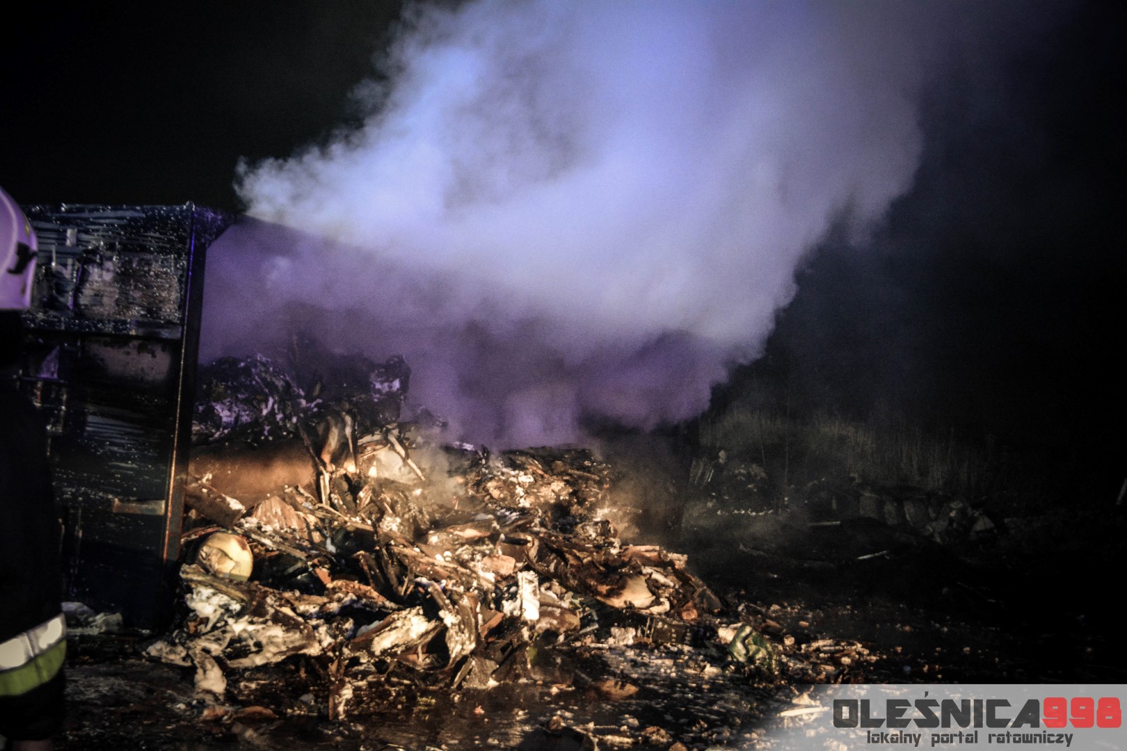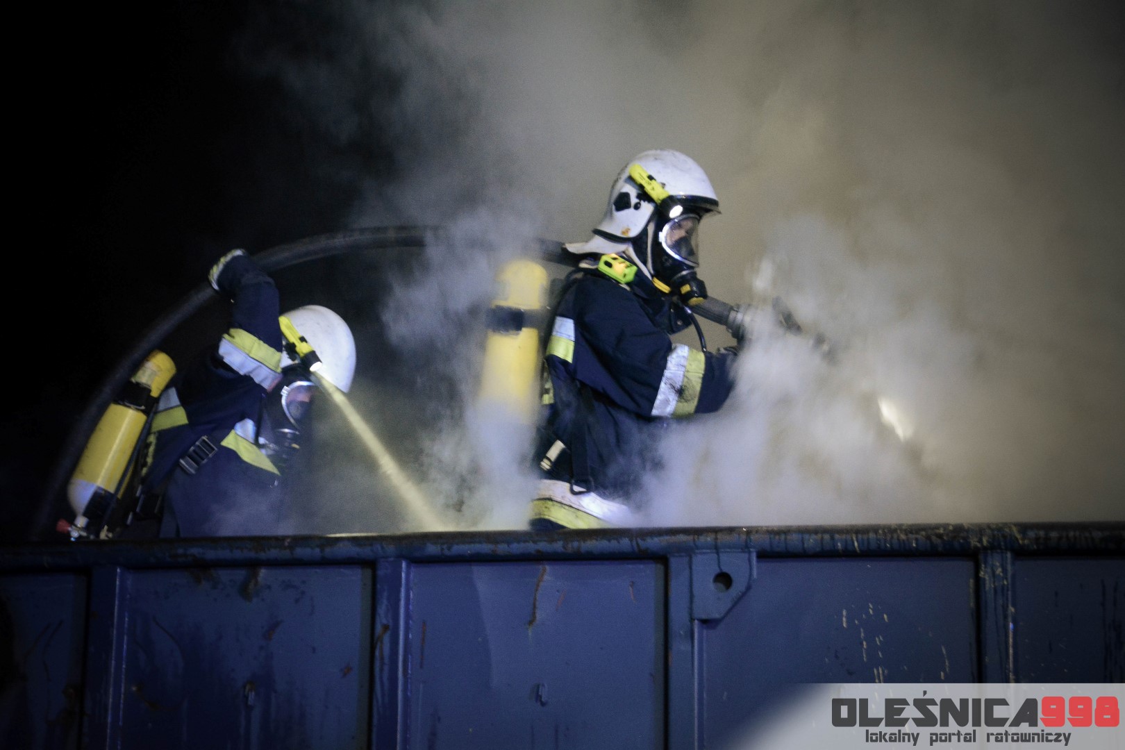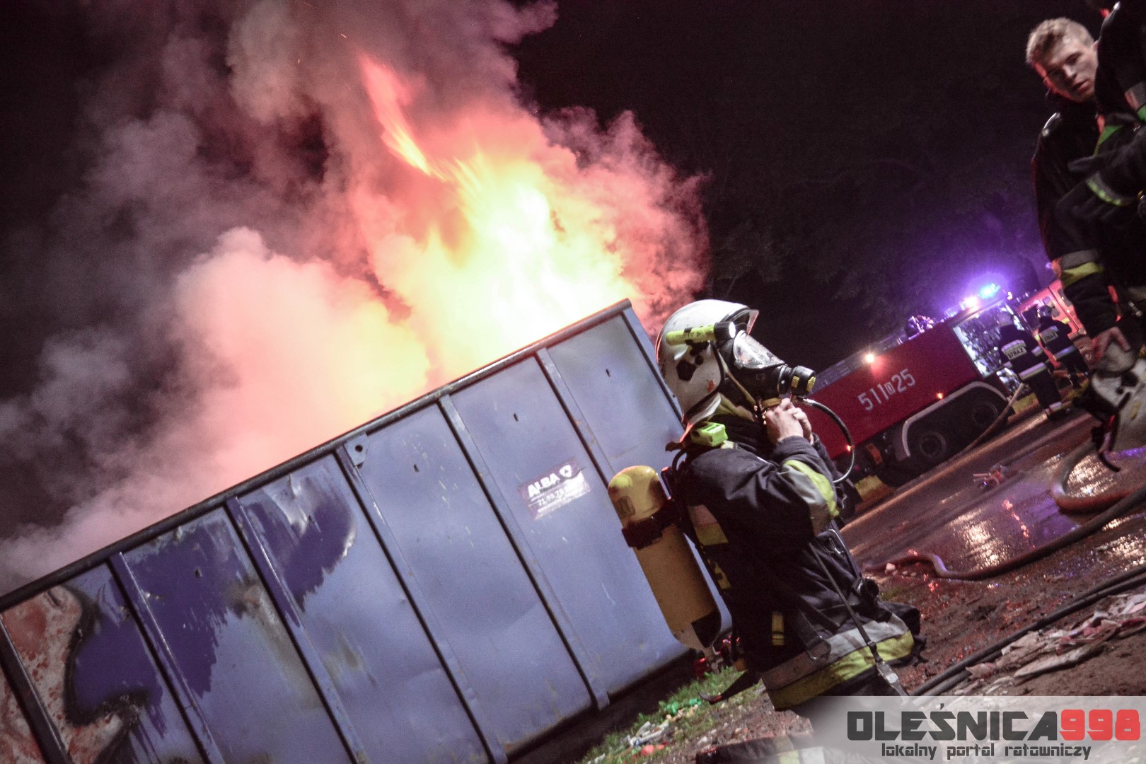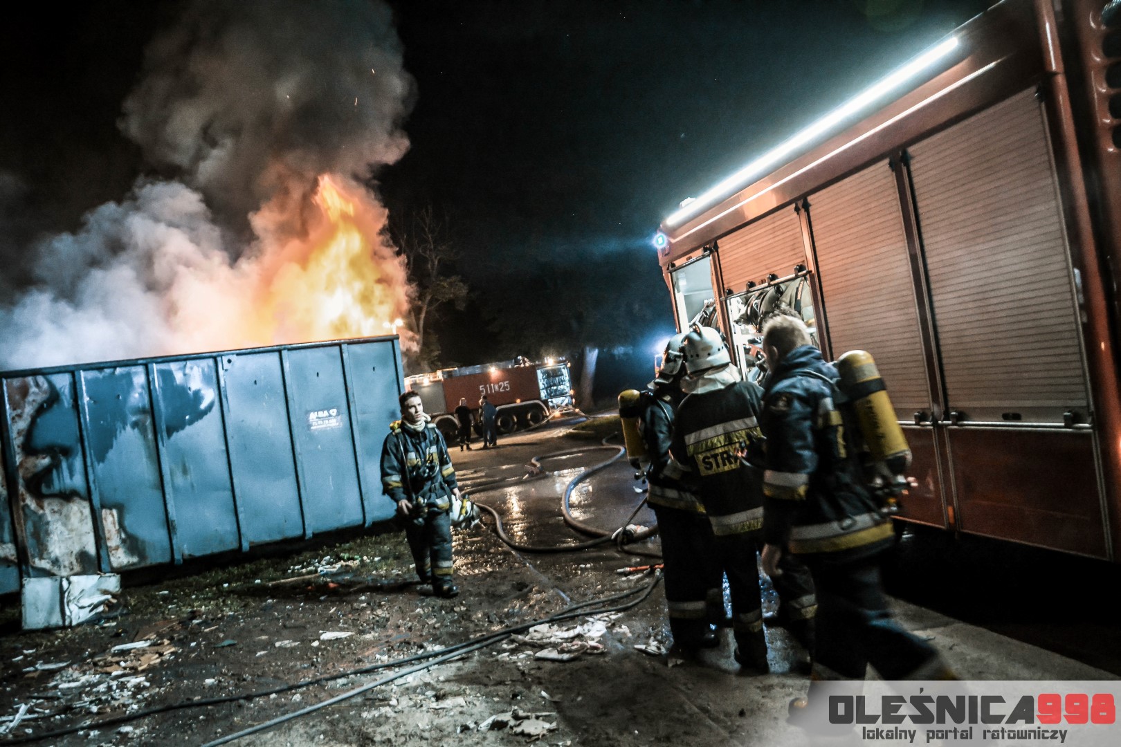 Strażacy po dojeździe na miejsce domniemanego wypalania trawy zastali mocno rozwinięty pożar składowiska śmieci. Ogniem objęte były dwa kontenery, a także zalegające na ziemi hałdy odpadów. Dowódca obecnego na miejscu zastępu polecił Dyżurnej Stanowiska Kierowania, zadysponowanie na miejsce dodatkowych sił i środków.