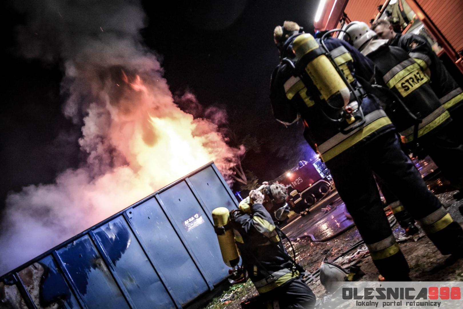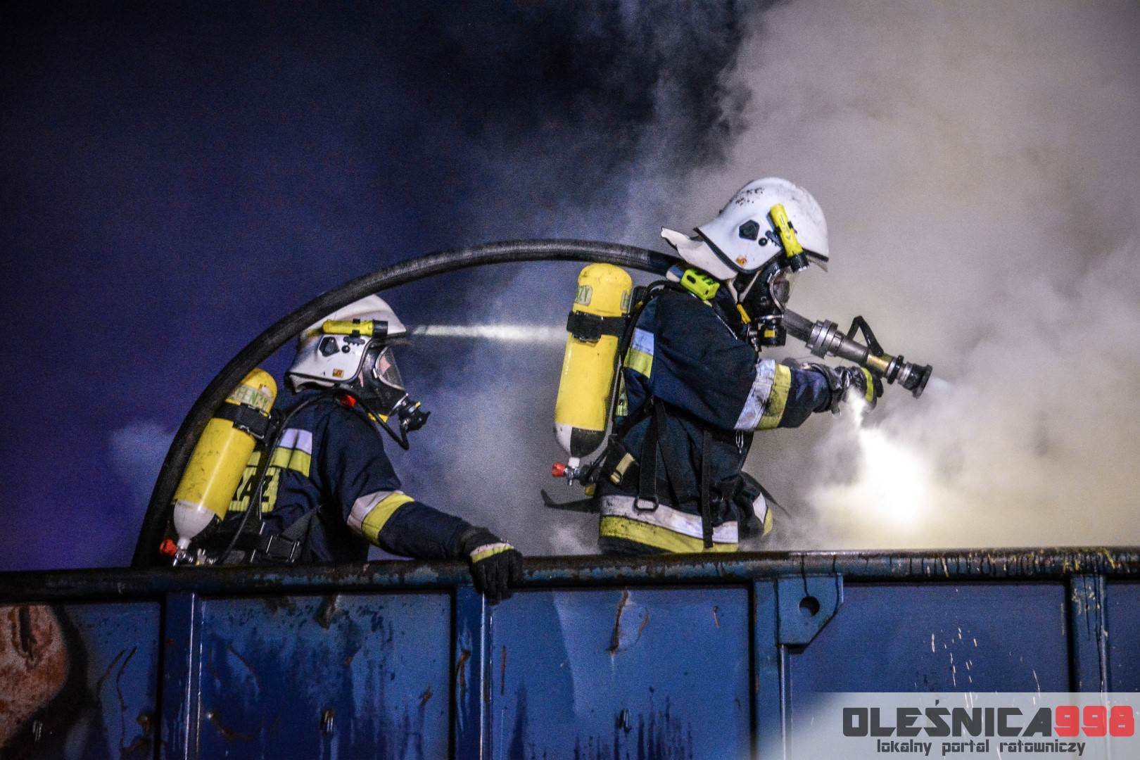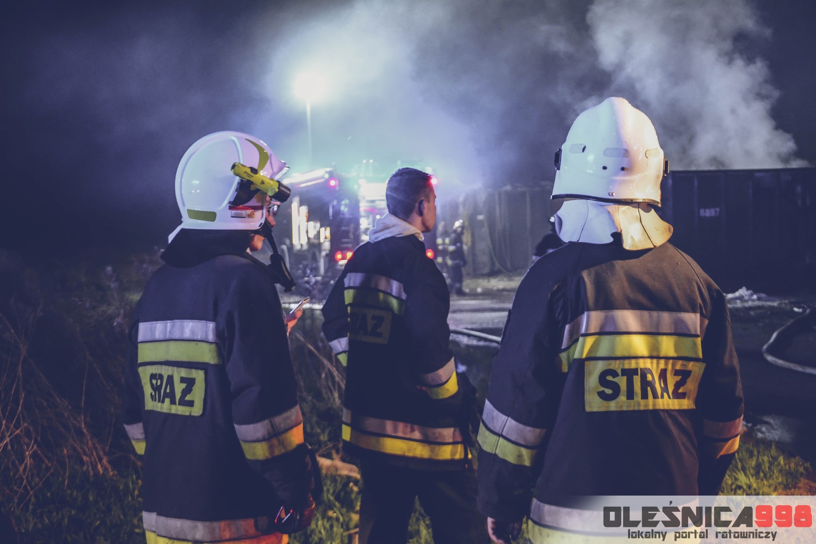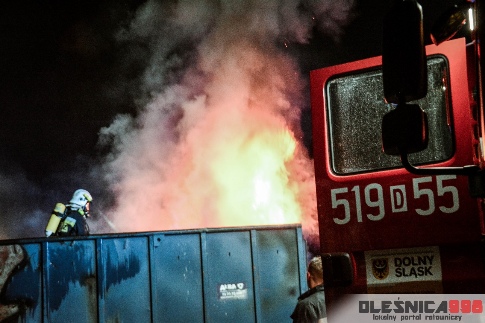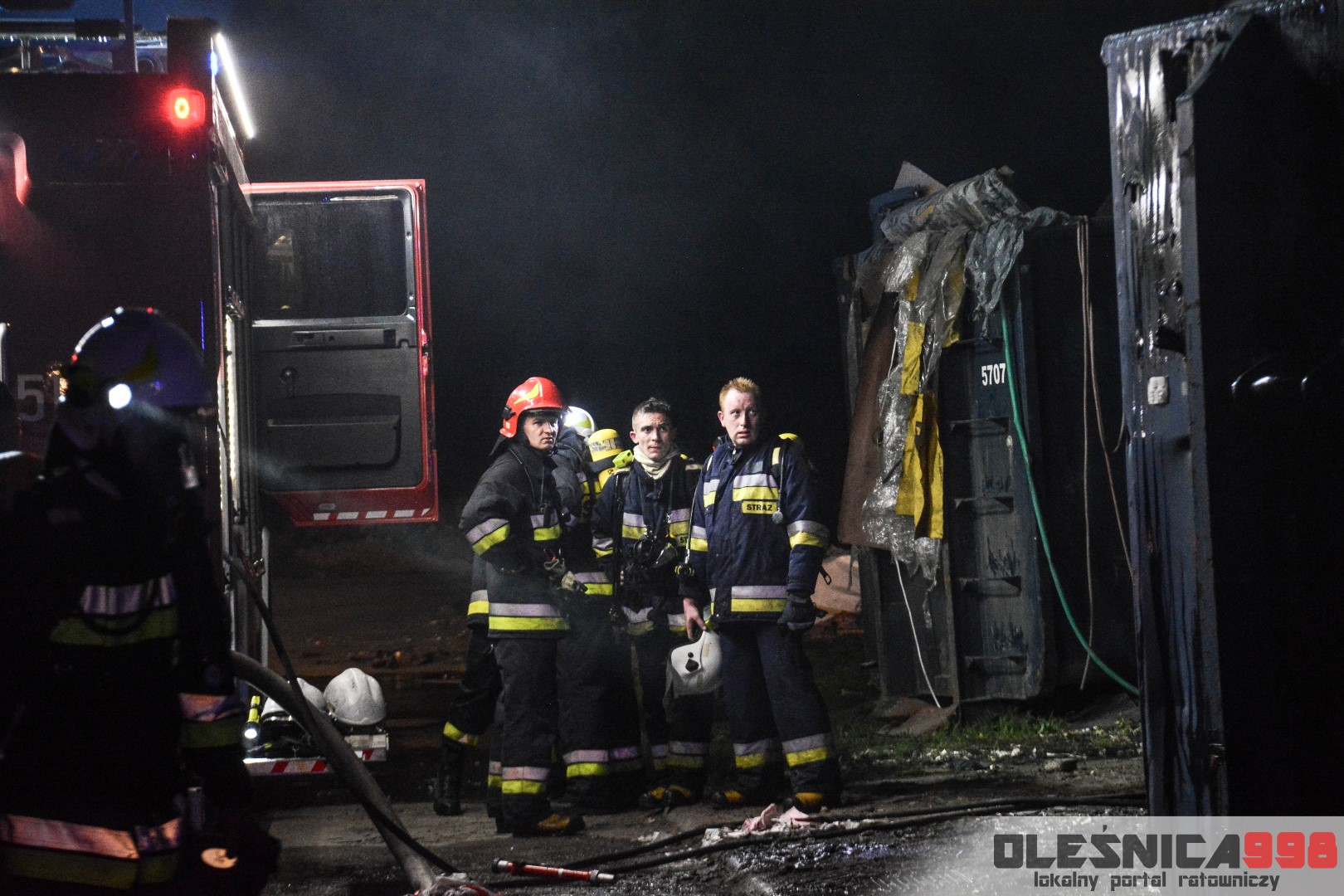 Strażacy po dojeździe na miejsce domniemanego wypalania trawy zastali mocno rozwinięty pożar składowiska śmieci. Ogniem objęte były dwa kontenery, a także zalegające na ziemi hałdy odpadów. Dowódca obecnego na miejscu zastępu polecił Dyżurnej Stanowiska Kierowania, zadysponowanie na miejsce dodatkowych sił i środków.