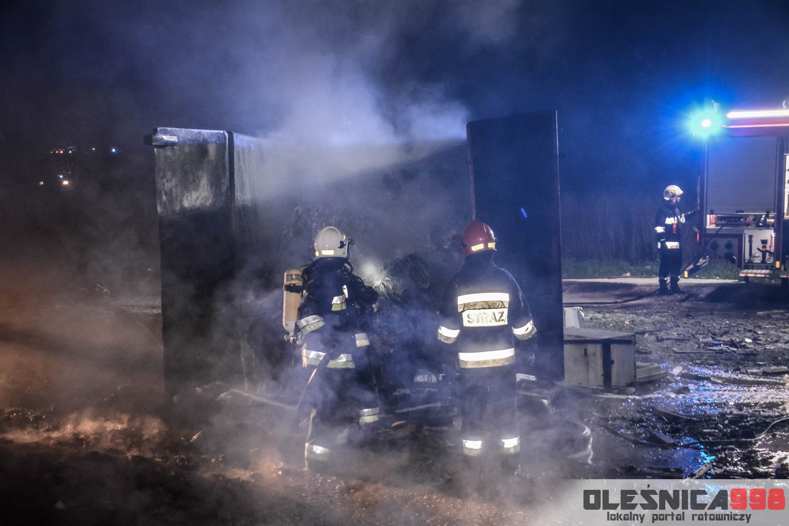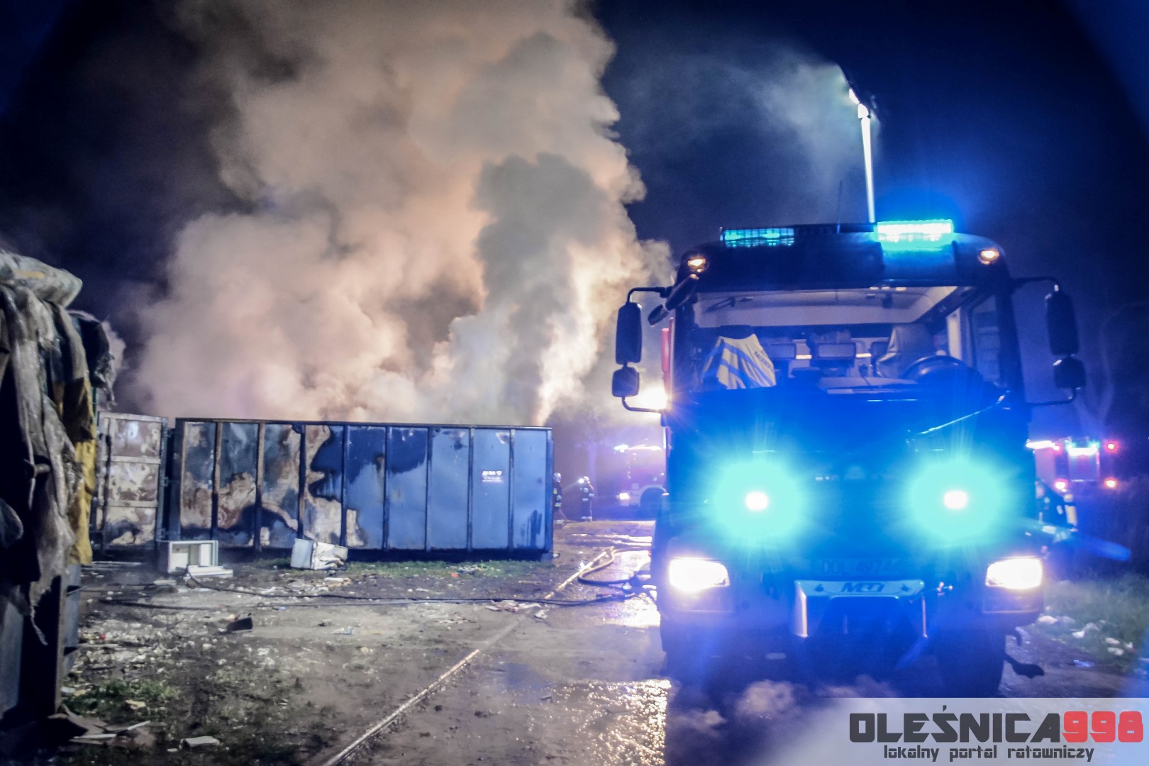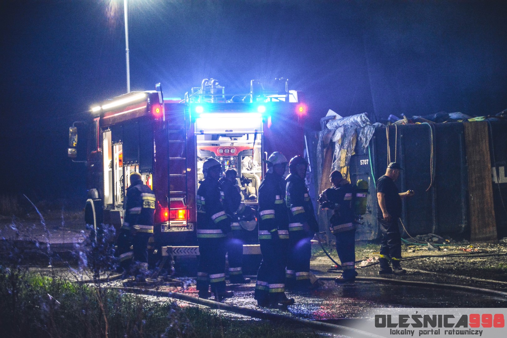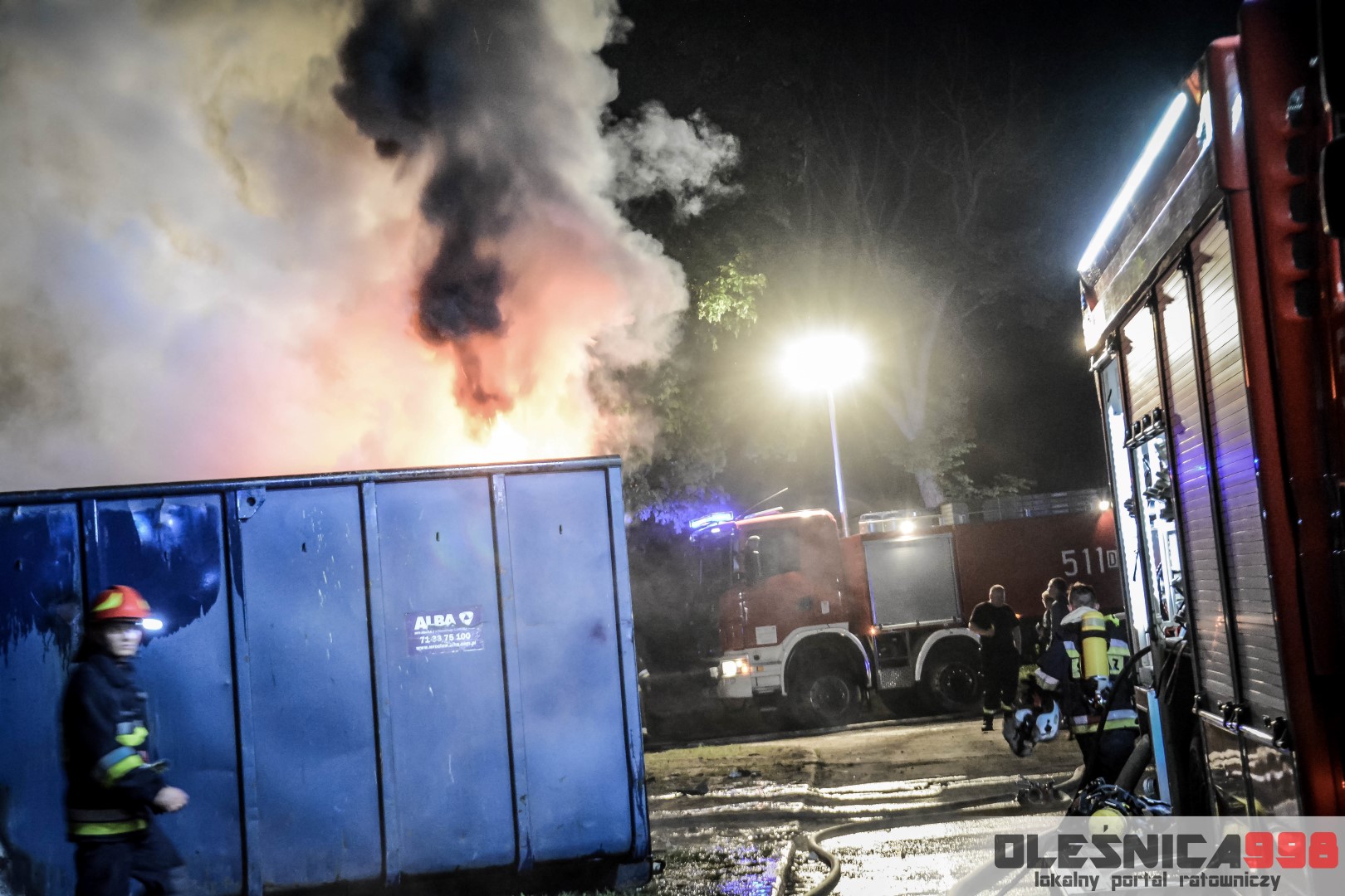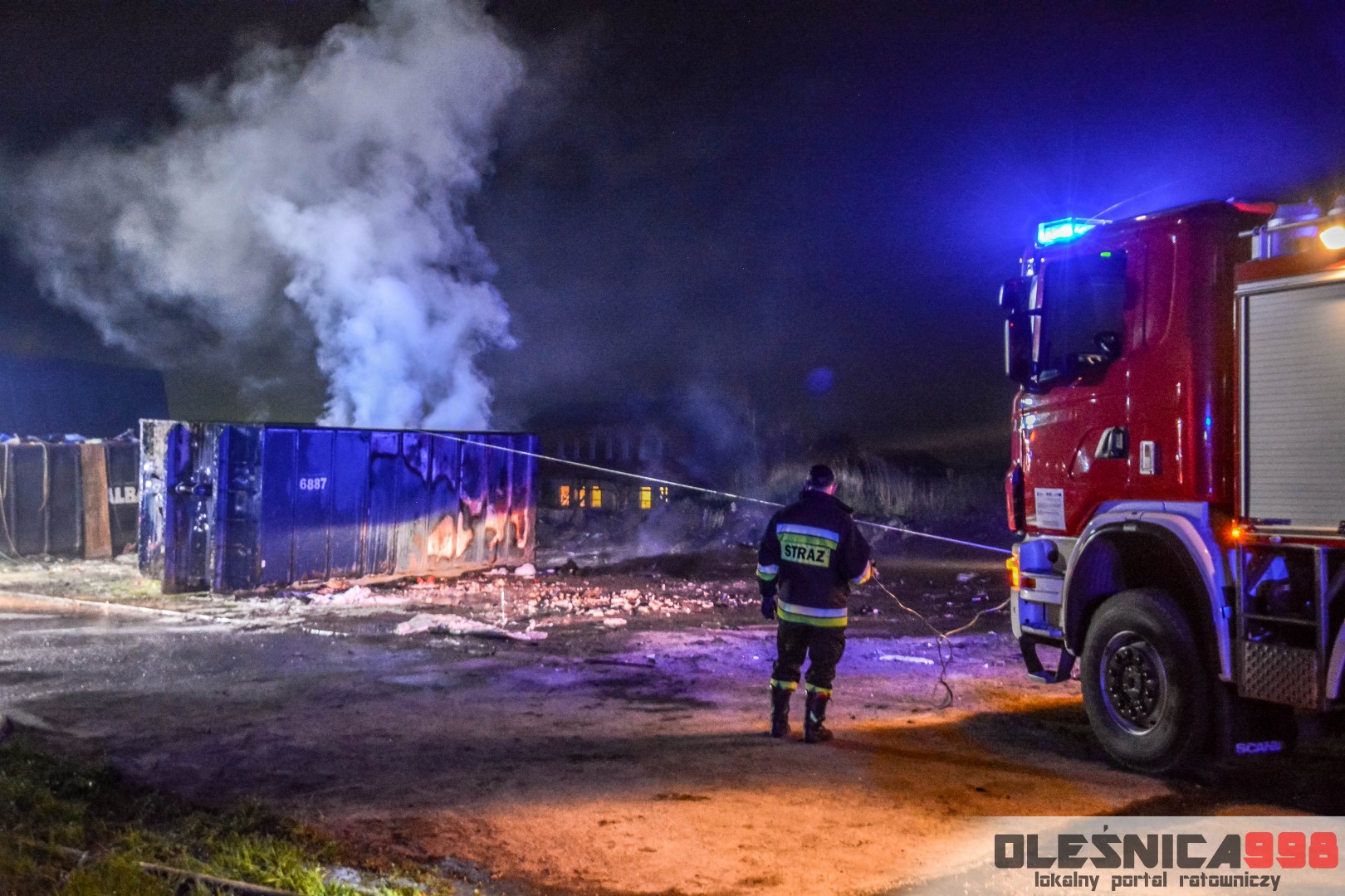 Strażacy po dojeździe na miejsce domniemanego wypalania trawy zastali mocno rozwinięty pożar składowiska śmieci. Ogniem objęte były dwa kontenery, a także zalegające na ziemi hałdy odpadów. Dowódca obecnego na miejscu zastępu polecił Dyżurnej Stanowiska Kierowania, zadysponowanie na miejsce dodatkowych sił i środków.